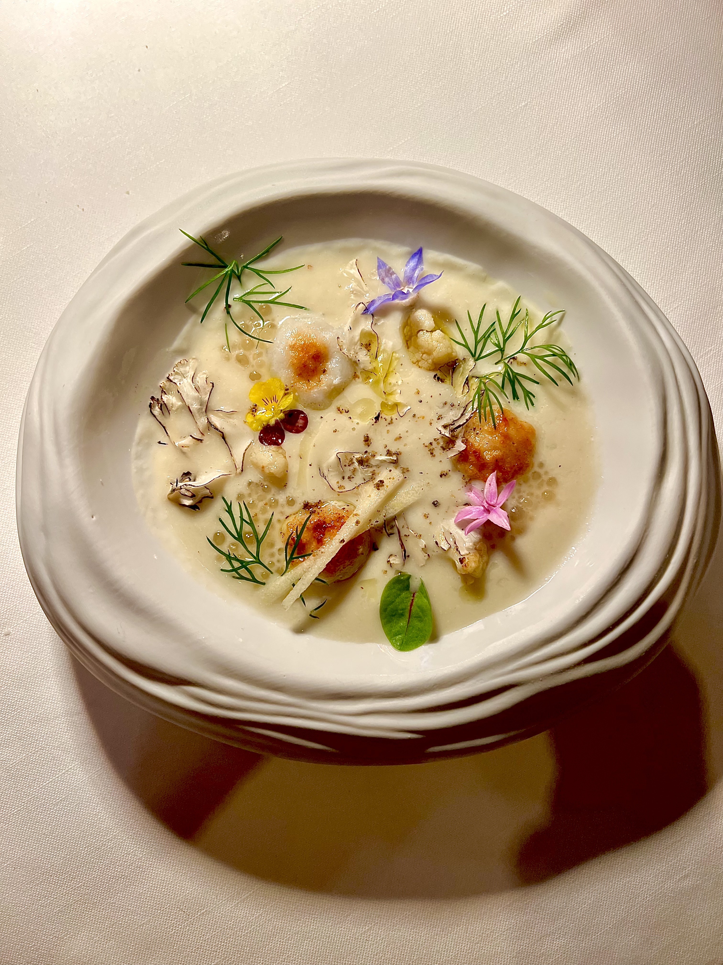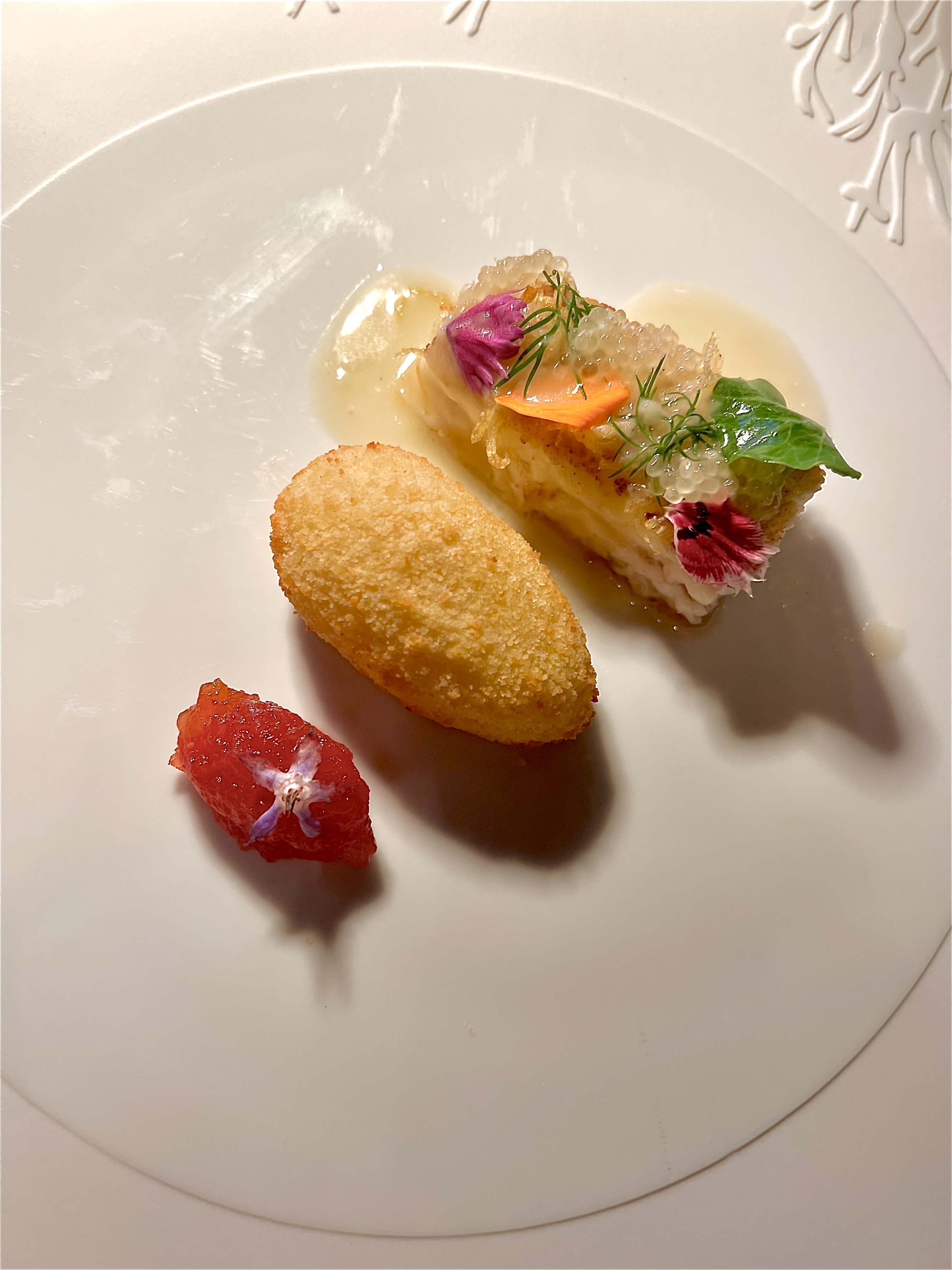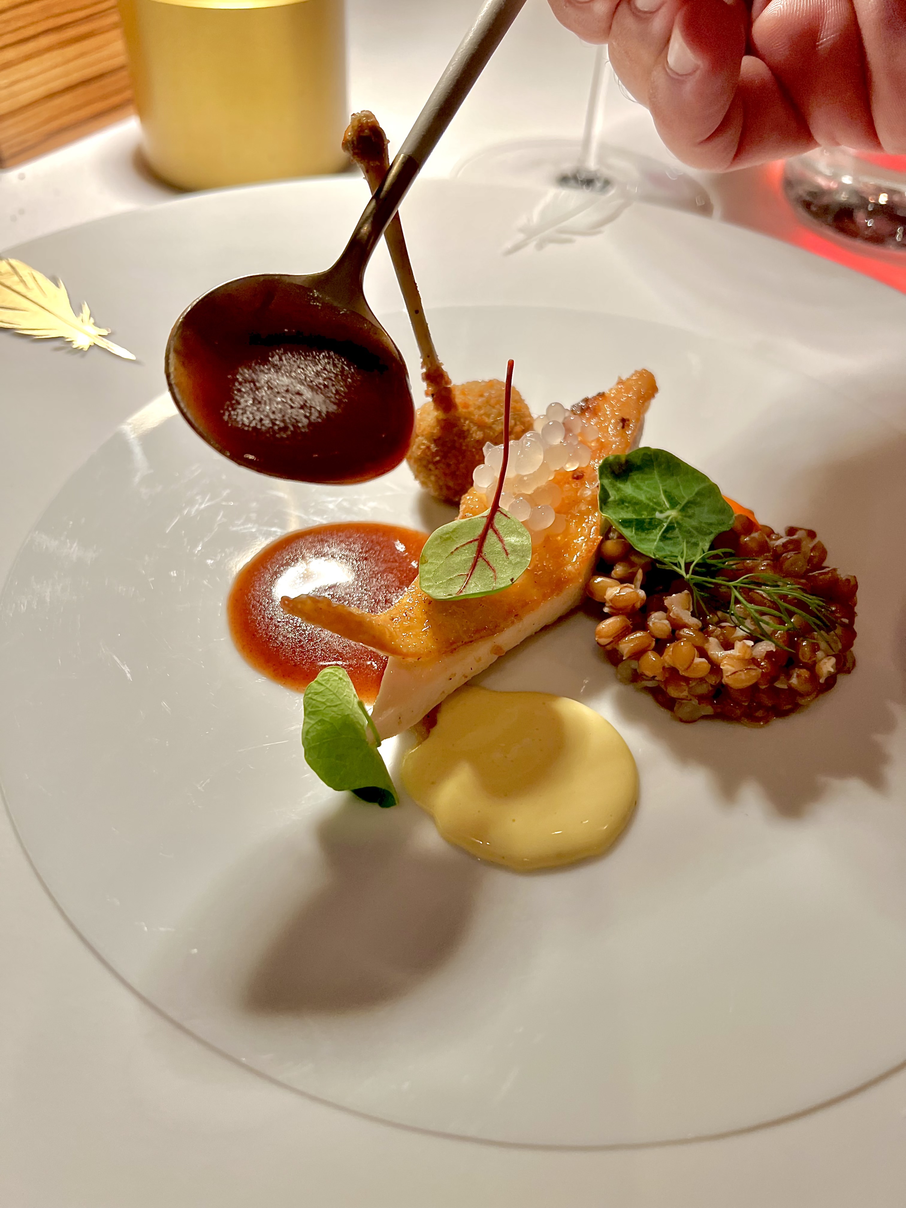 Les subtils gnocchis de seiche s’étoffent du réconfortant velouté de céleri rave et fenouil, la vanille s’infuse en rondeur et le caviar de camomille apporte une touche amère fine et claquante. Le tout est d’une belle consistance iodée et raffinée qui attise les papilles.