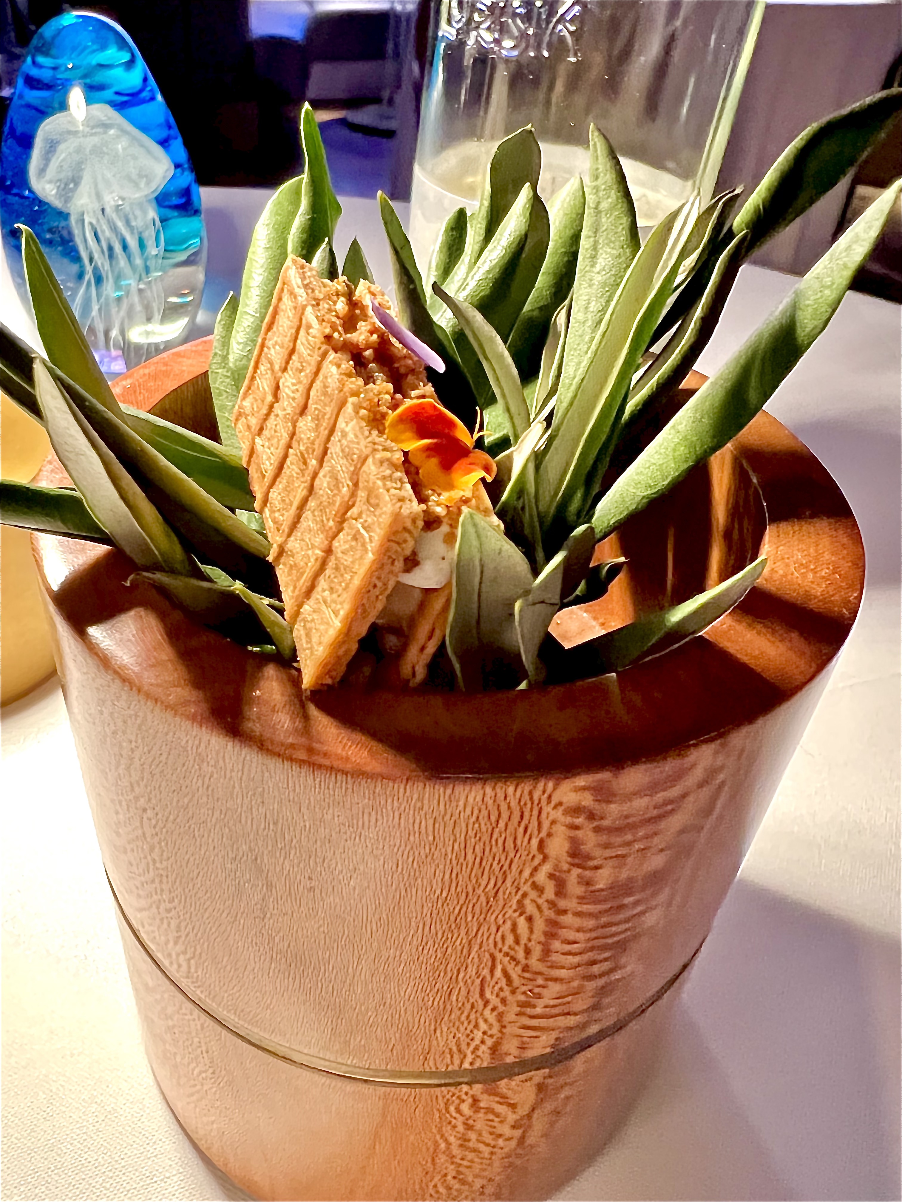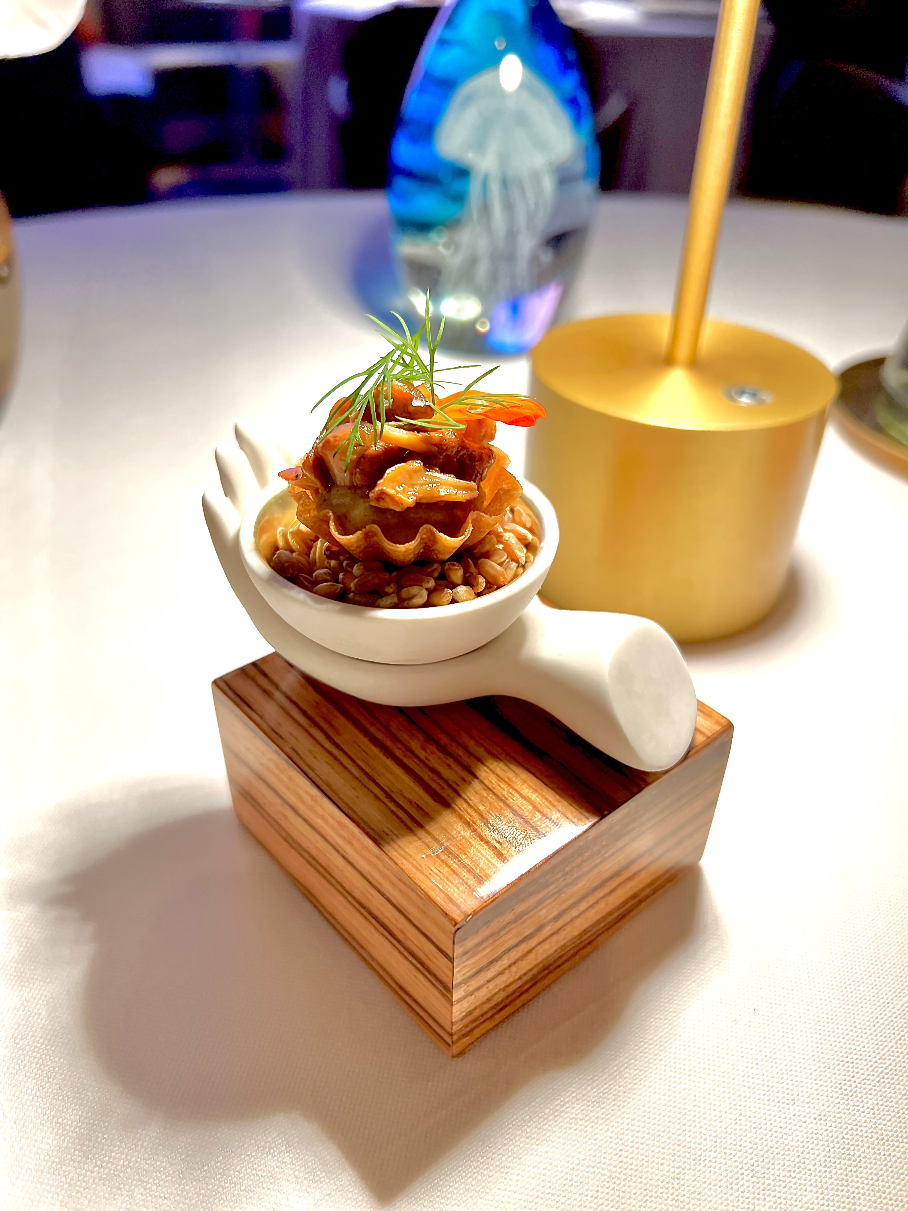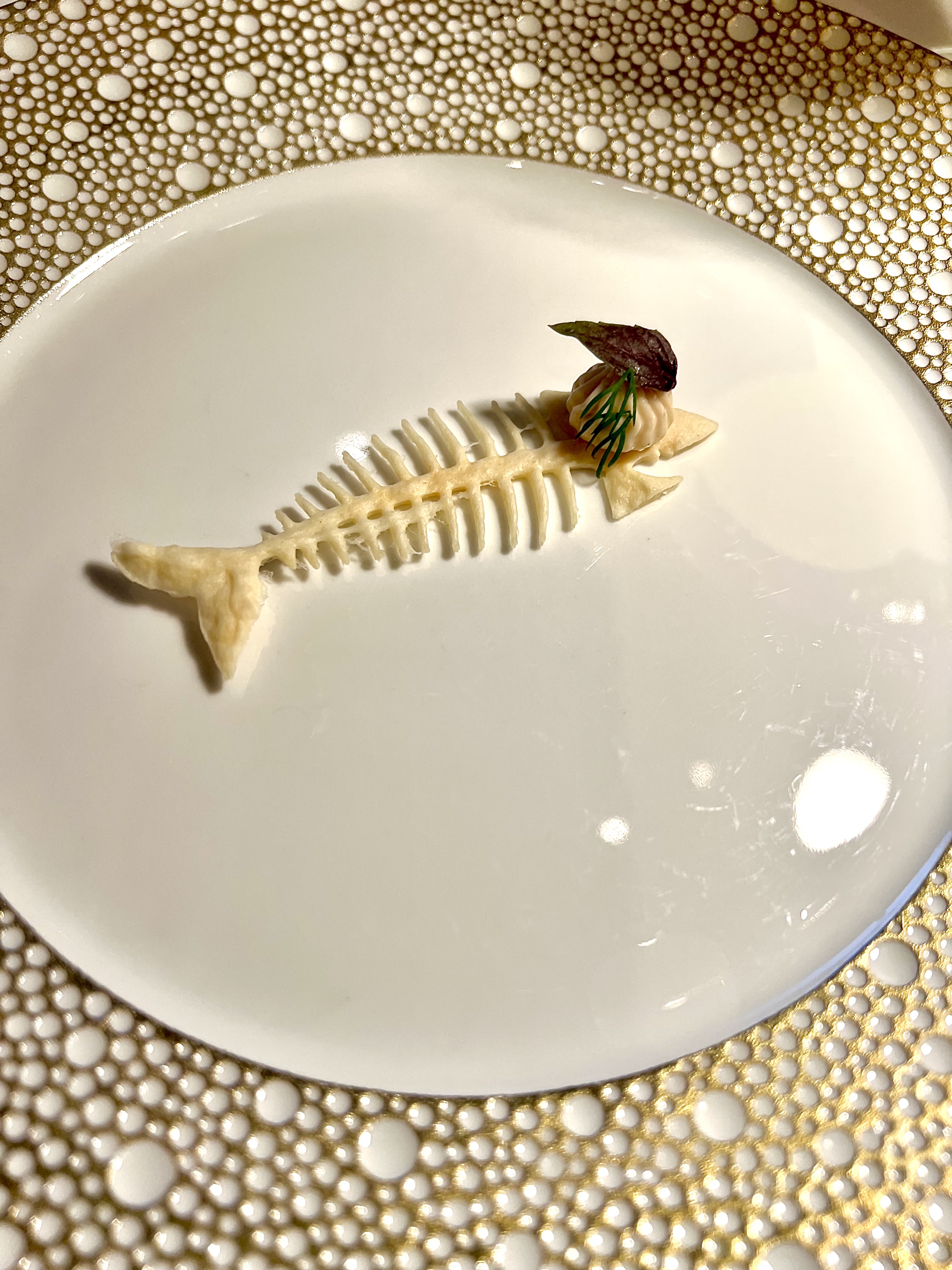 Les subtils gnocchis de seiche s’étoffent du réconfortant velouté de céleri rave et fenouil, la vanille s’infuse en rondeur et le caviar de camomille apporte une touche amère fine et claquante. Le tout est d’une belle consistance iodée et raffinée qui attise les papilles.