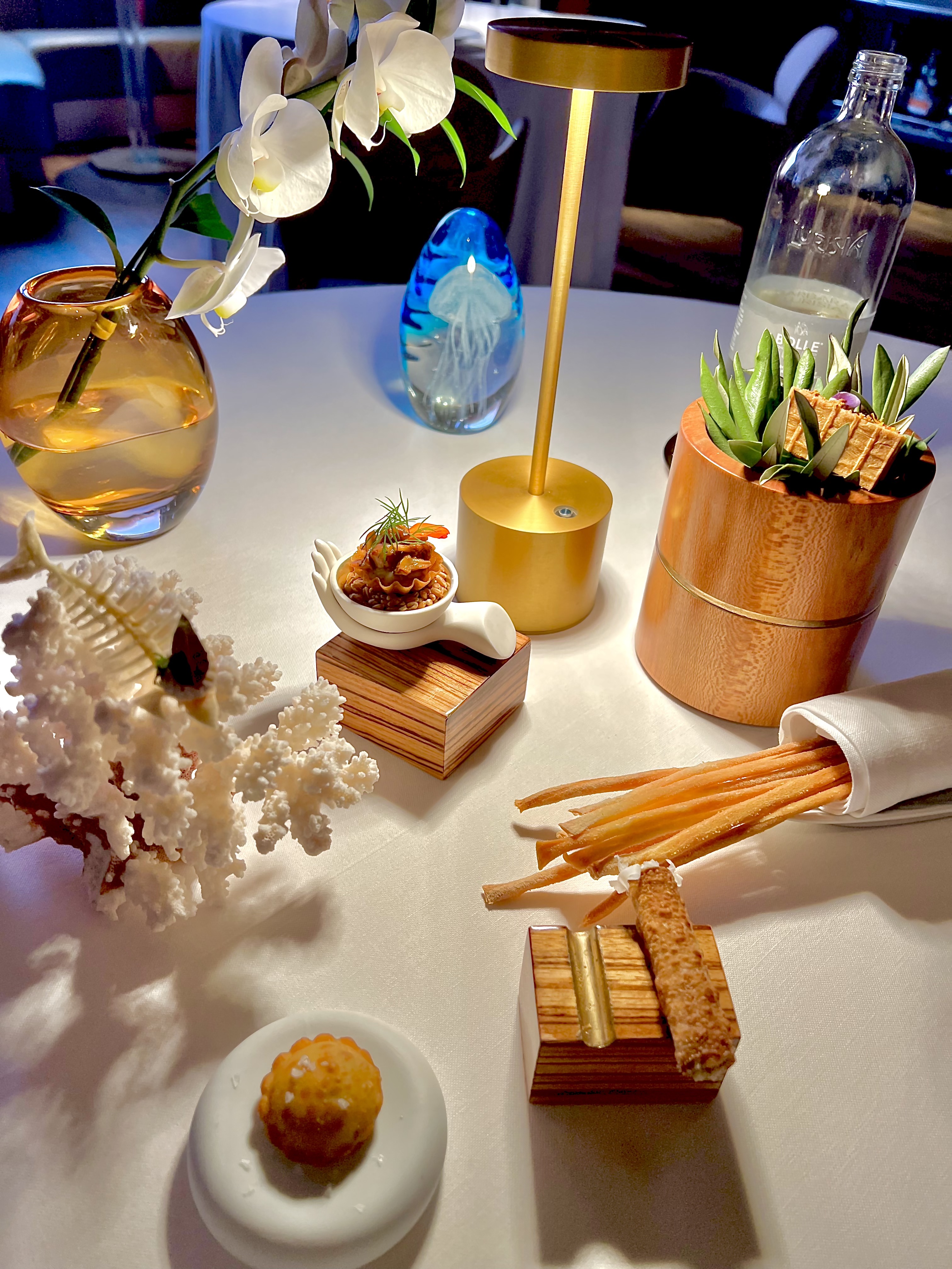 Ce précieux cocktail accompagnera à merveille les fascinants amuse-bouches présentés, tels des bijoux, comme la croustillante Arête de parmesan, en trompe l’oeil et beurre d’anchois, le traditionnel et parfait barbajuan à la crème de courgette, la Gaufrette froufrou (foie gras mousse de chèvre, confiture de tomates et olive noire) ou la Tartelette pomme de terre et girolles, sans oublier le Cannoli farci caviar d’aubergine et Parmesan, tout ce petit monde ciselé à la perfection vous met en appétit et vous apporte cette petite étincelle en vous qui prédit un dîner prometteur et terriblement exaltant.
