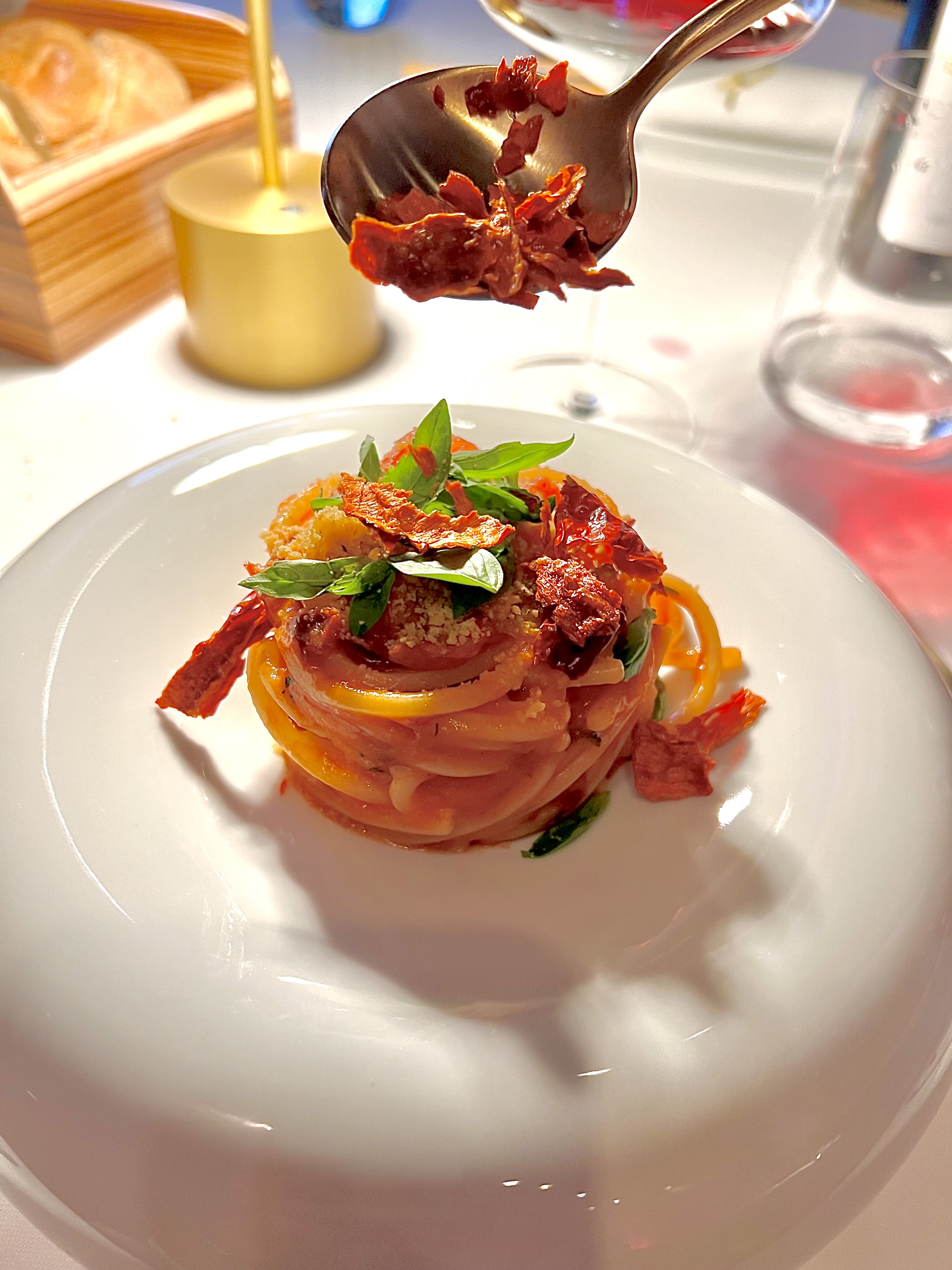 Spaghetti allo zafferano peperone crusco est à l’origine une assiette de pâtes « du pauvre » des familles de la Basilicate, qui se révèle, ici, étincelante et goûteuse entre amertume et douceur du fameux poivron qui apporte une texture colorée et croustillante. C’est simplement puissant, addictif et vrai!