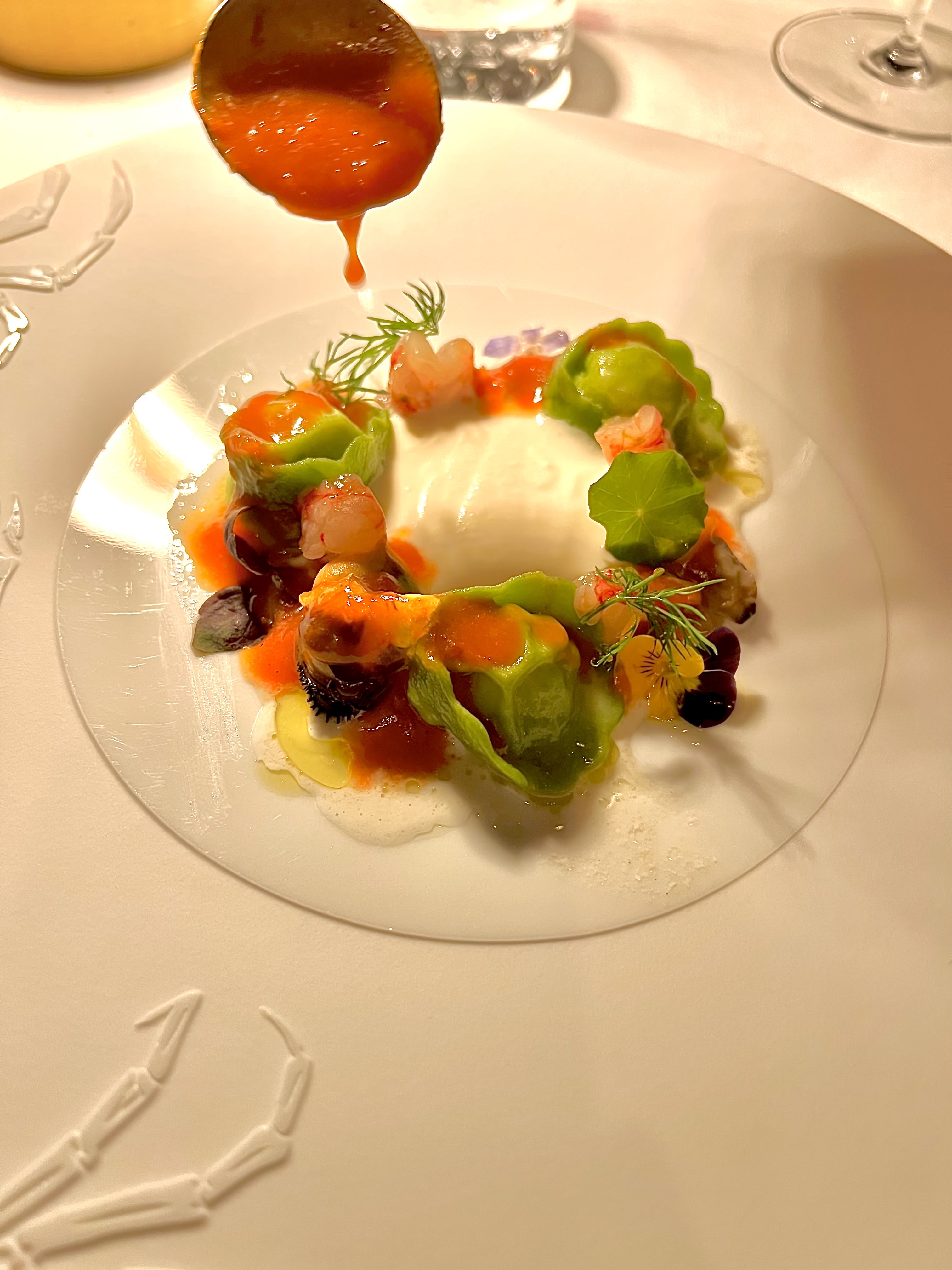 Les Tortellinis d’épinards farcis gamberoni et crabe : que dire de ces petites bouchées de bonheur totalement irrévérencieuses qui explosent de bonheurs et de délices en bouche. Toute la fraîcheur iodée du crabe se savoure intensément, les gamberoni à cru délivrent toute leur identité unique, la crémeuse burrata signe de son onctuosité lactée et la réduction tomatée de rascasse lie le tout en osmose pimpante et percutante.