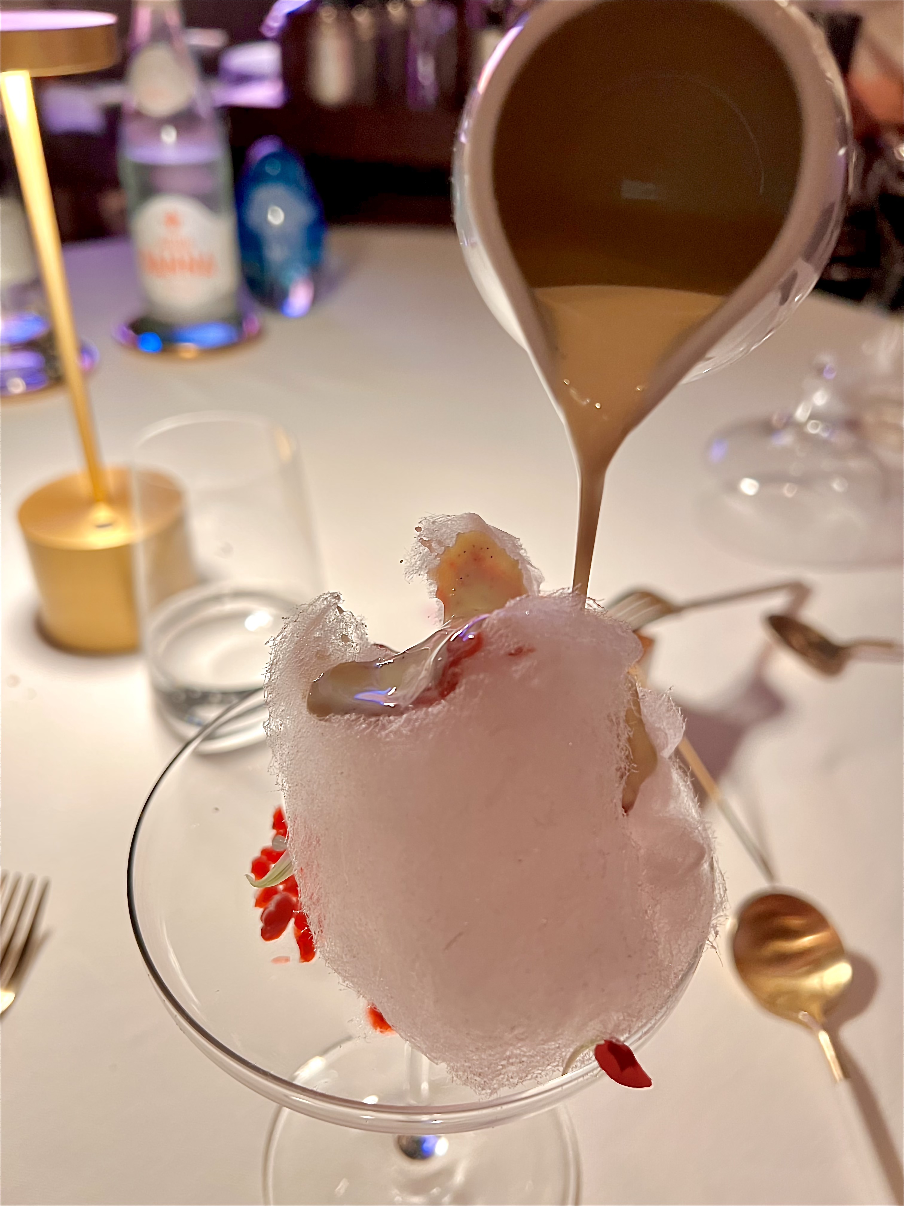 Le dessert est une revisite spectaculaire de l’île flottante aux amandes et pralines dans une version italienne de l’Amaretto. « L’île » se fait « bling » en se parant d’une feuille d’argent et la barbe à papa de praline fond d’allégresse de la crème anglaise.