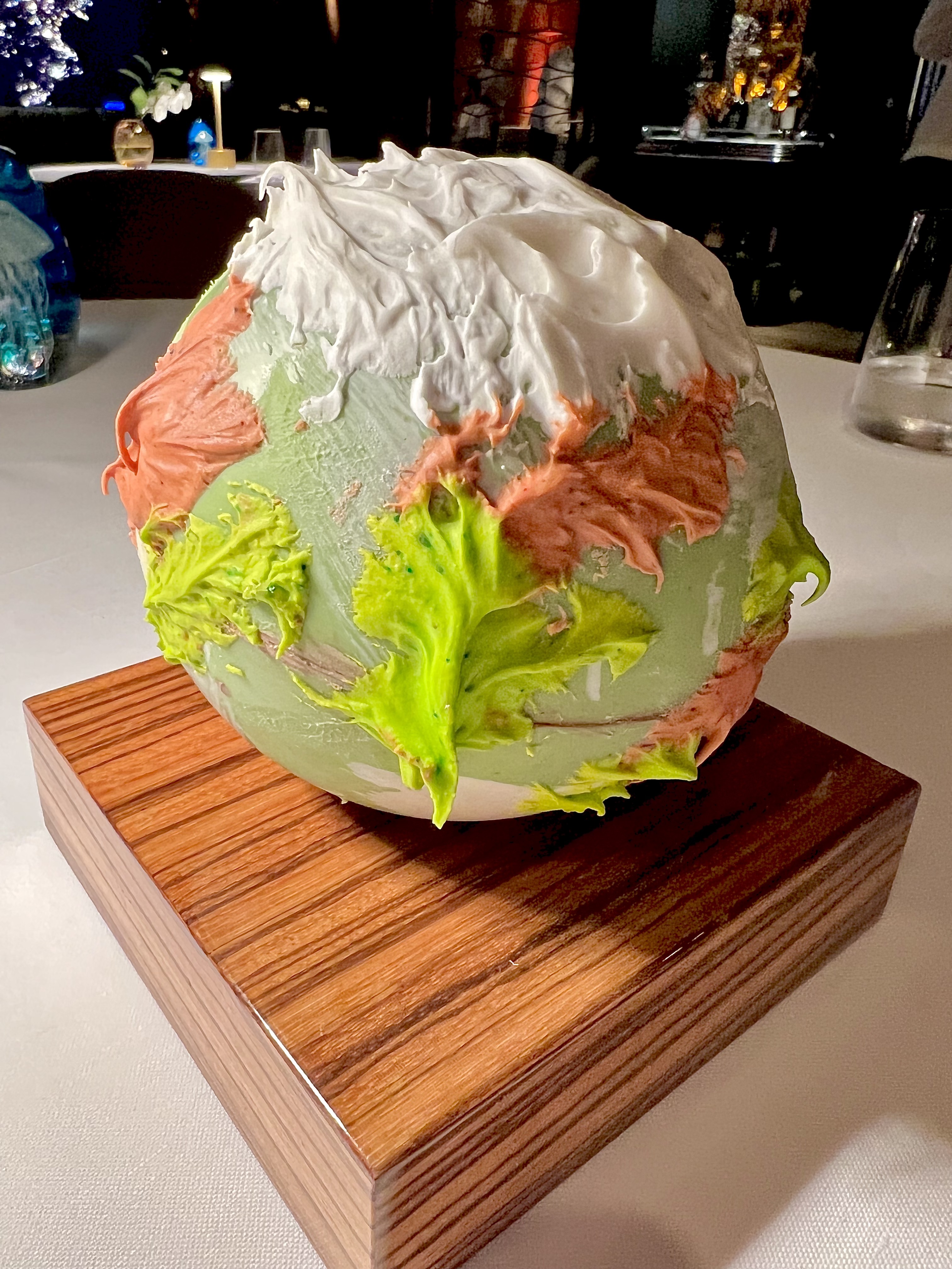 Pour terminer cet éblouissant menu en harmonie, à vous de libérer un « monde de chocolat » et de mignardises, en cassant une sphère terrestre avec un maillet ou plutôt un marteau, tel un commissaire-priseur de l’art culinaire.