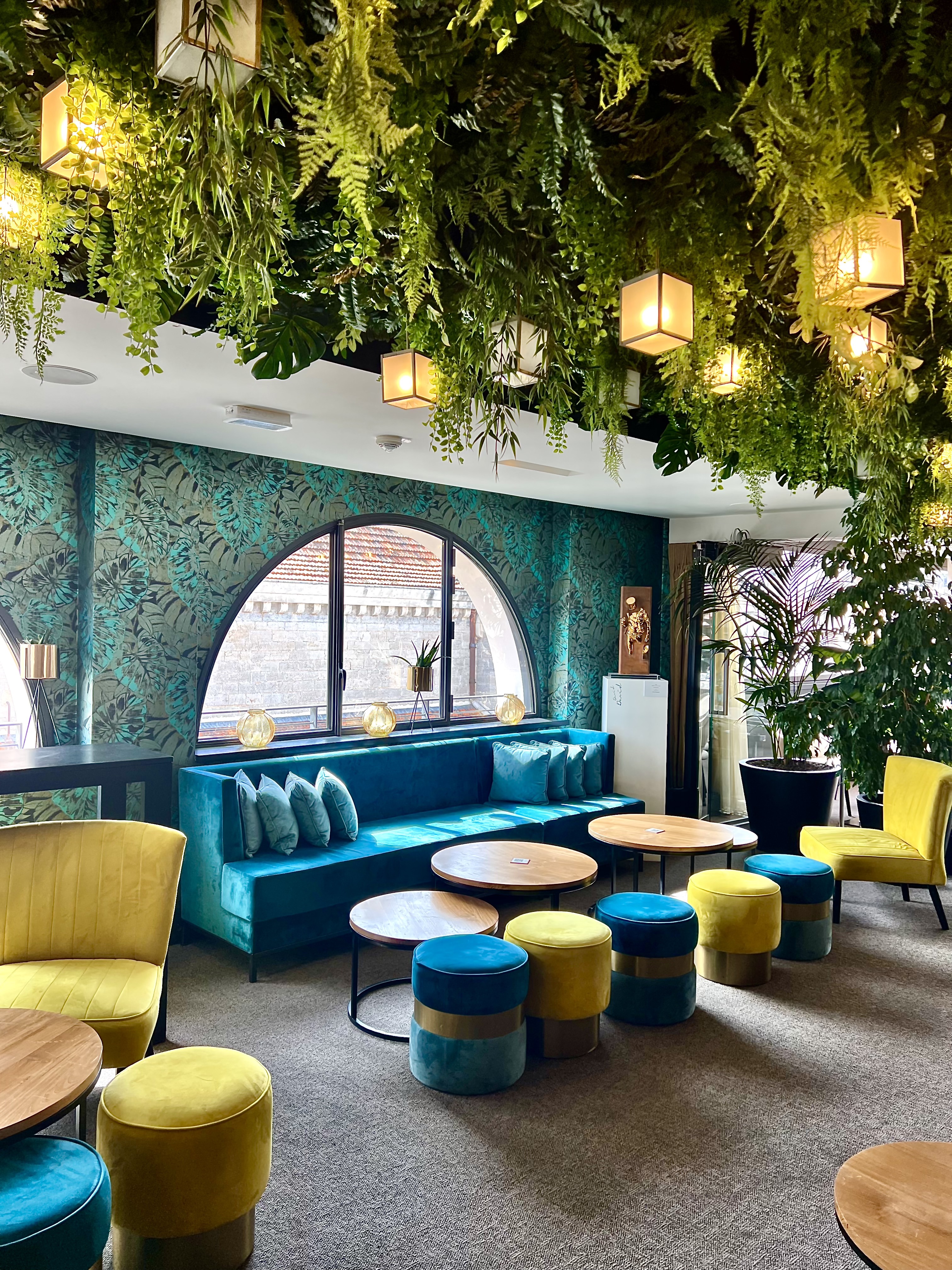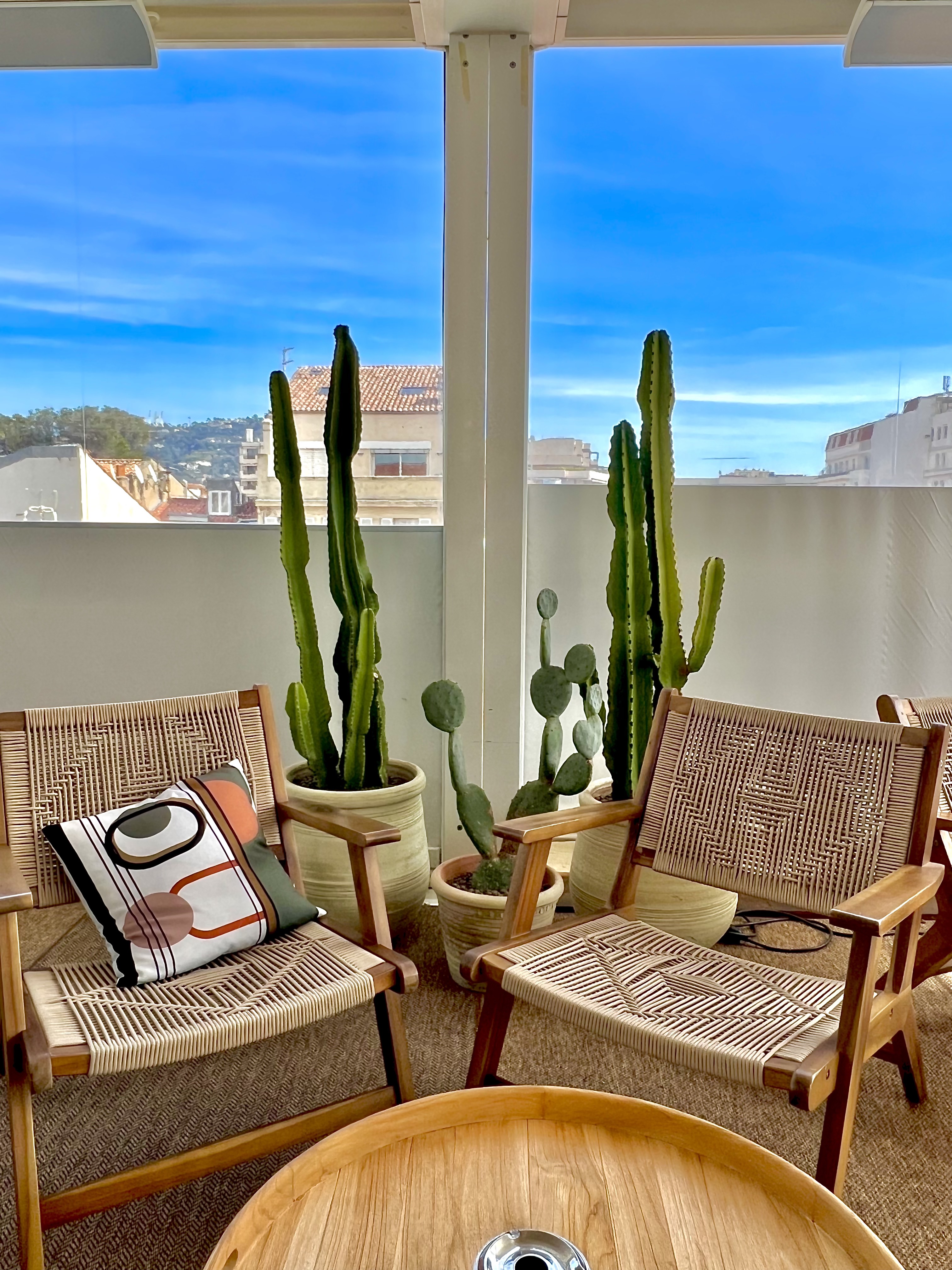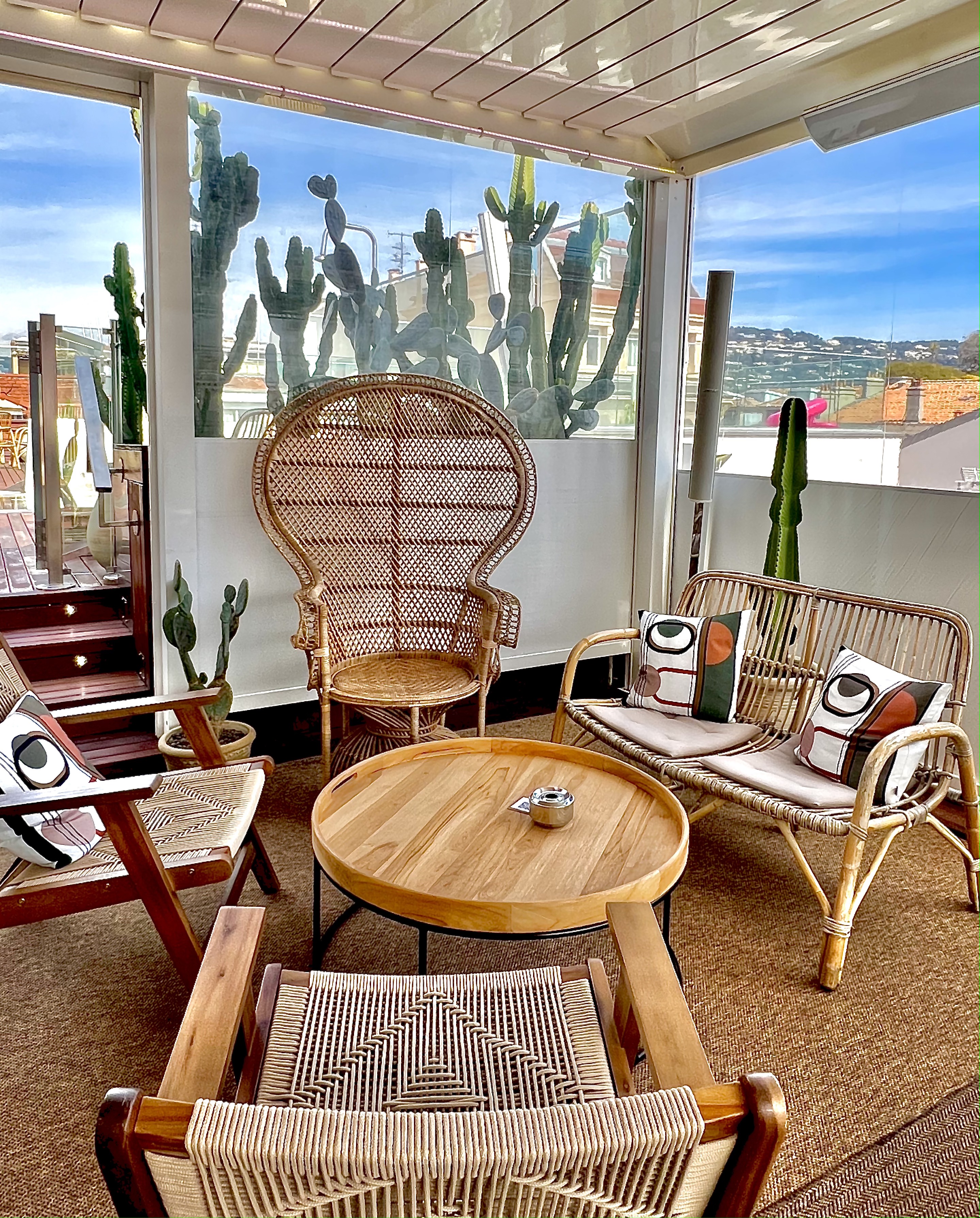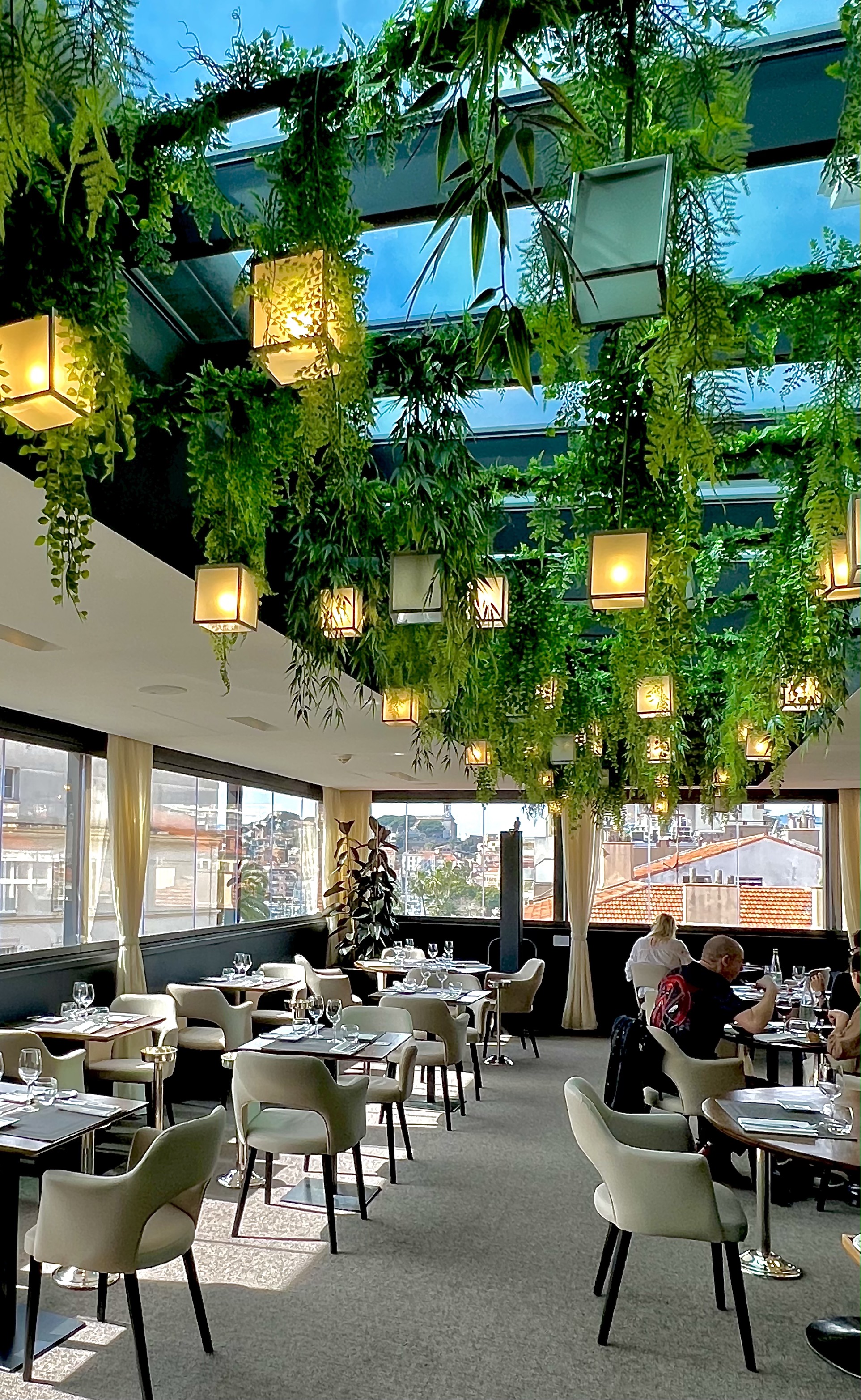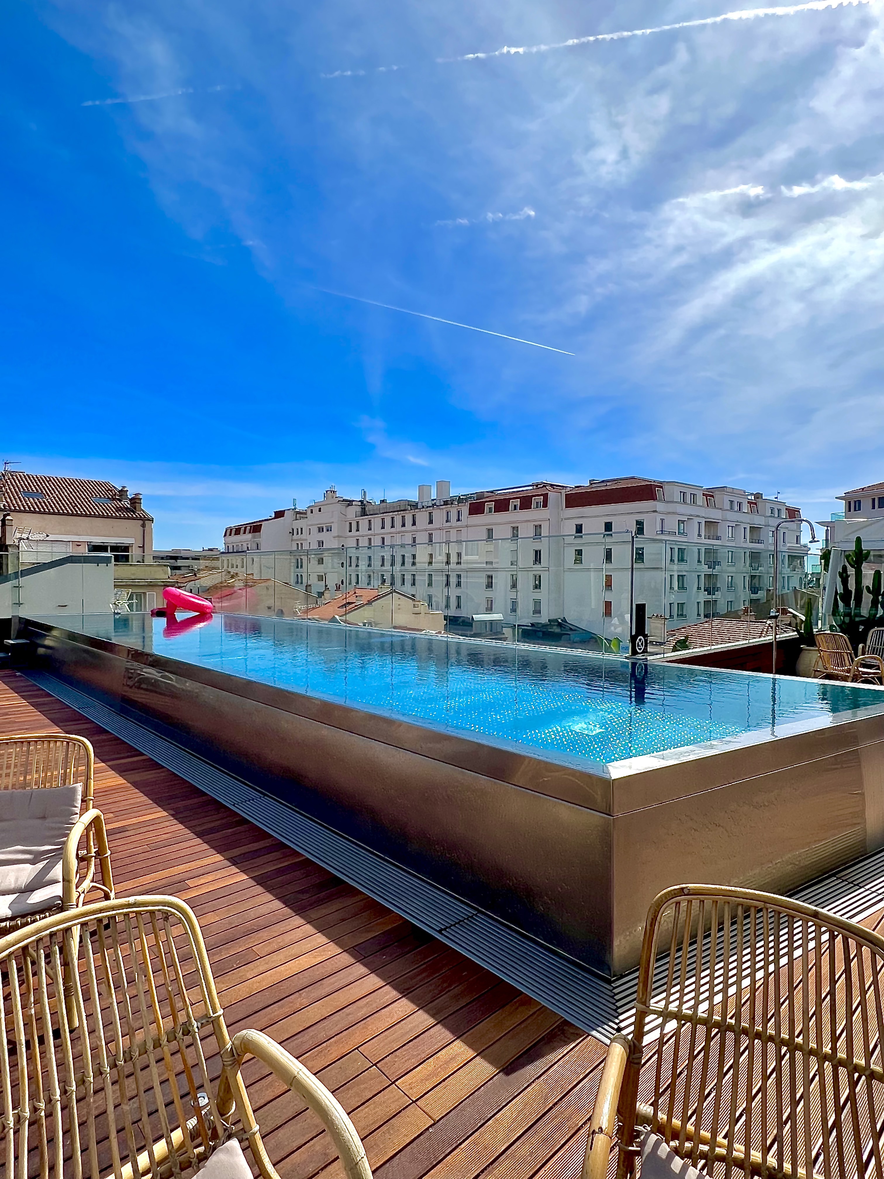 Légèrement en retrait de la folle trépidation de la Croisette et du Palais des Festivals, l’établissement est une véritable bulle de sérénité et de délices qui se divise en trois espaces : le restaurant panoramique d’une vue sur le charmant et historique quartier du Suquet, le Bar végétalisé à l’esprit d’une forêt tropicale et aux touches Art Déco, et la Terrasse Pergola au style bohème chic, adjacente à la piscine miroir d’une ligne profilée.