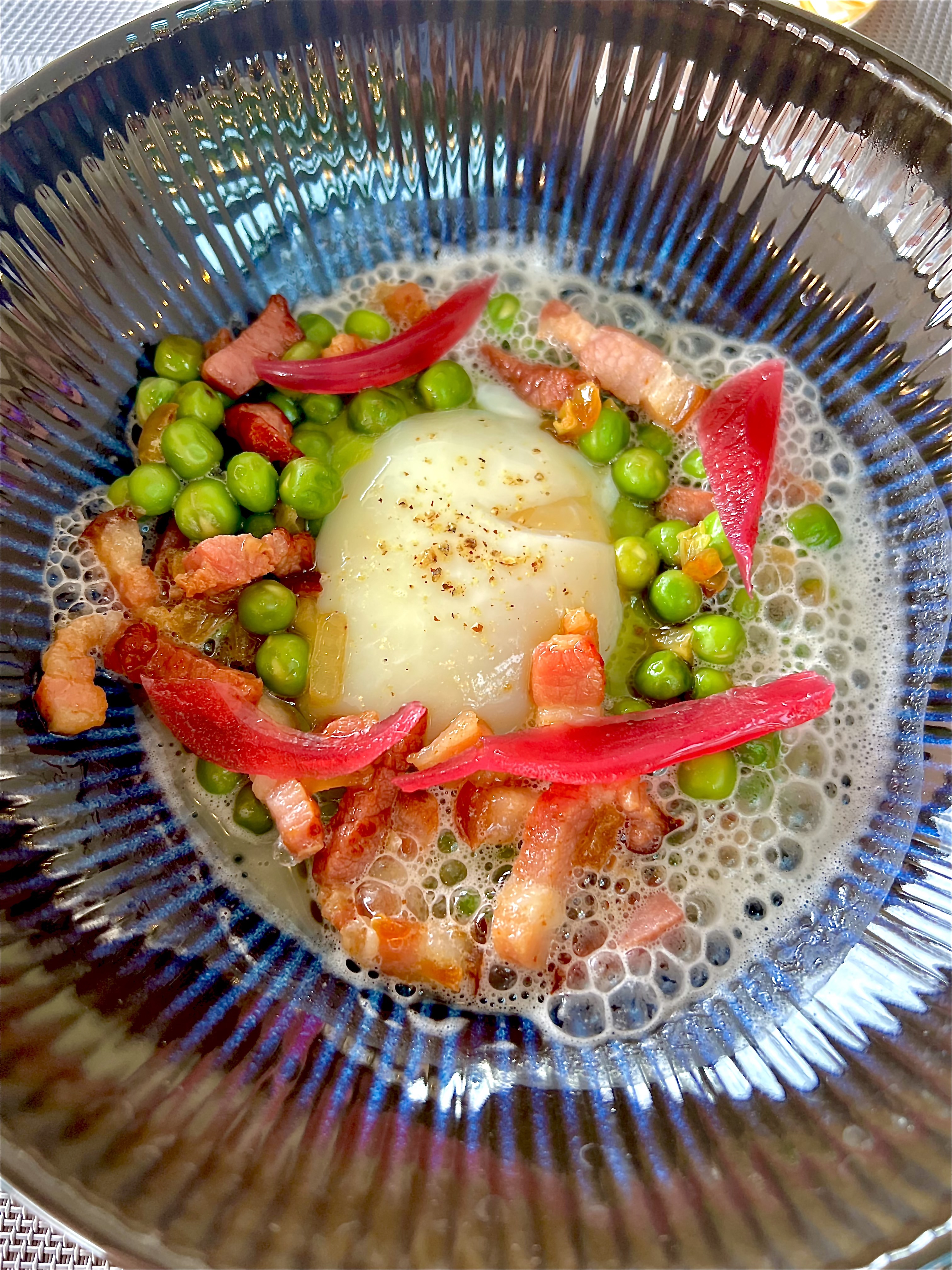 En entrée, l’Œuf poché, petits pois frais à la française au lard fumé se fait parfait de son jaune gourmand, les petits pois claquent de vie printanière, les lardons ont cette touche et mâche fumées et les pickles viennent ciseler de leur peps. La crème de petits pois et l’émulsion de lard enveloppent le tout d’un voile savoureux et subtil.