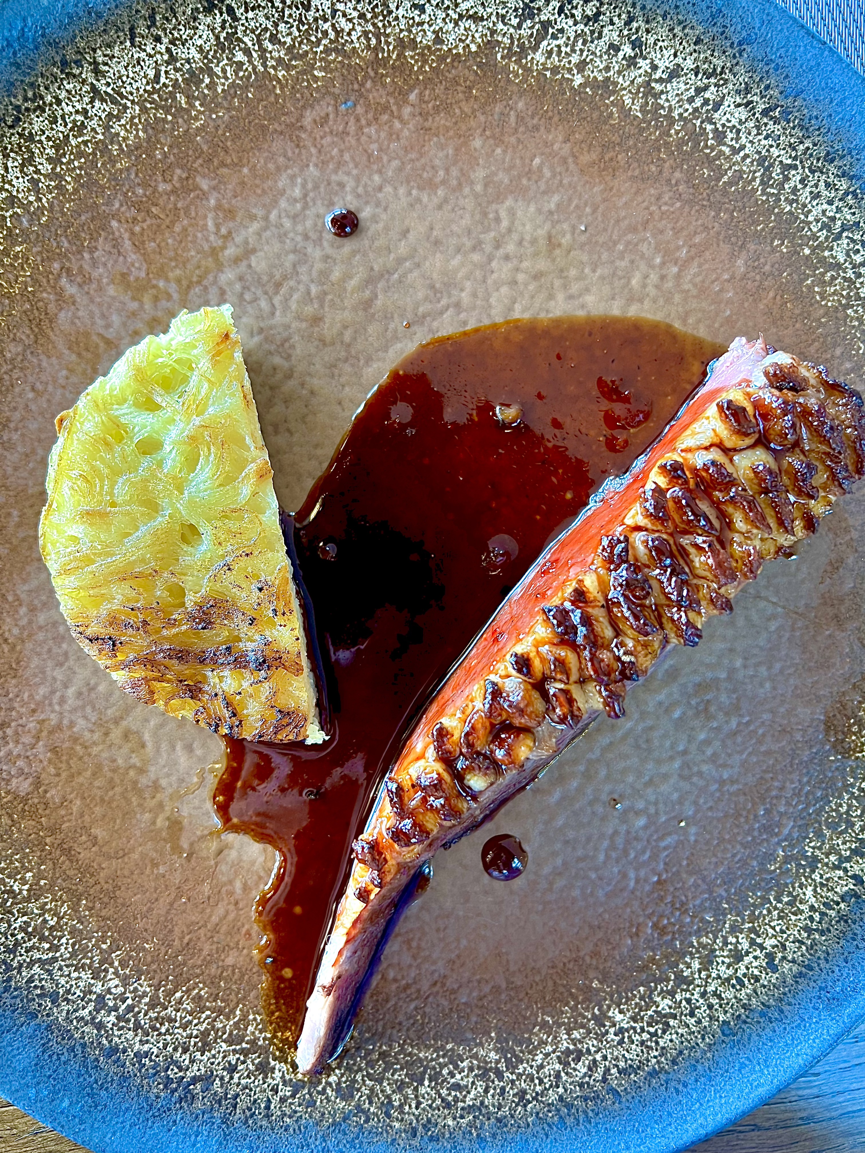 La Canna-Bouille, soupe et poissons de roche saisis à la plancha, rouille safranée et croûtons dorés est telle une fine bouillabaisse aux poissons pétrifiés d’une cuisson minute à l’huile d’olive, marqués juste ce qu’il faut, ils gardent toute leur identité et vivacité iodée. La rouille se fait discret siphon en légèreté, les pommes de terre en texture et les croutons en délicate croustille font la cadence en bouche. L’ensemble est réjouissant et pertinent.