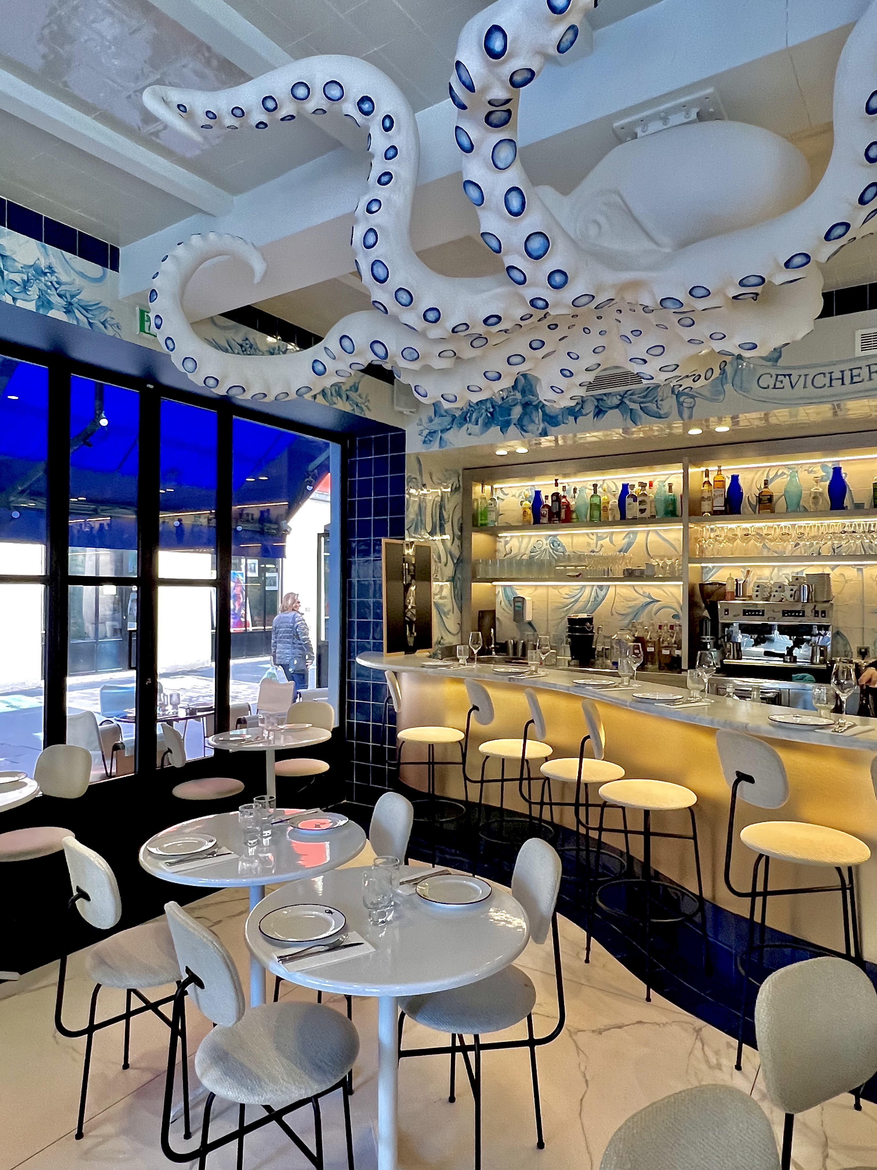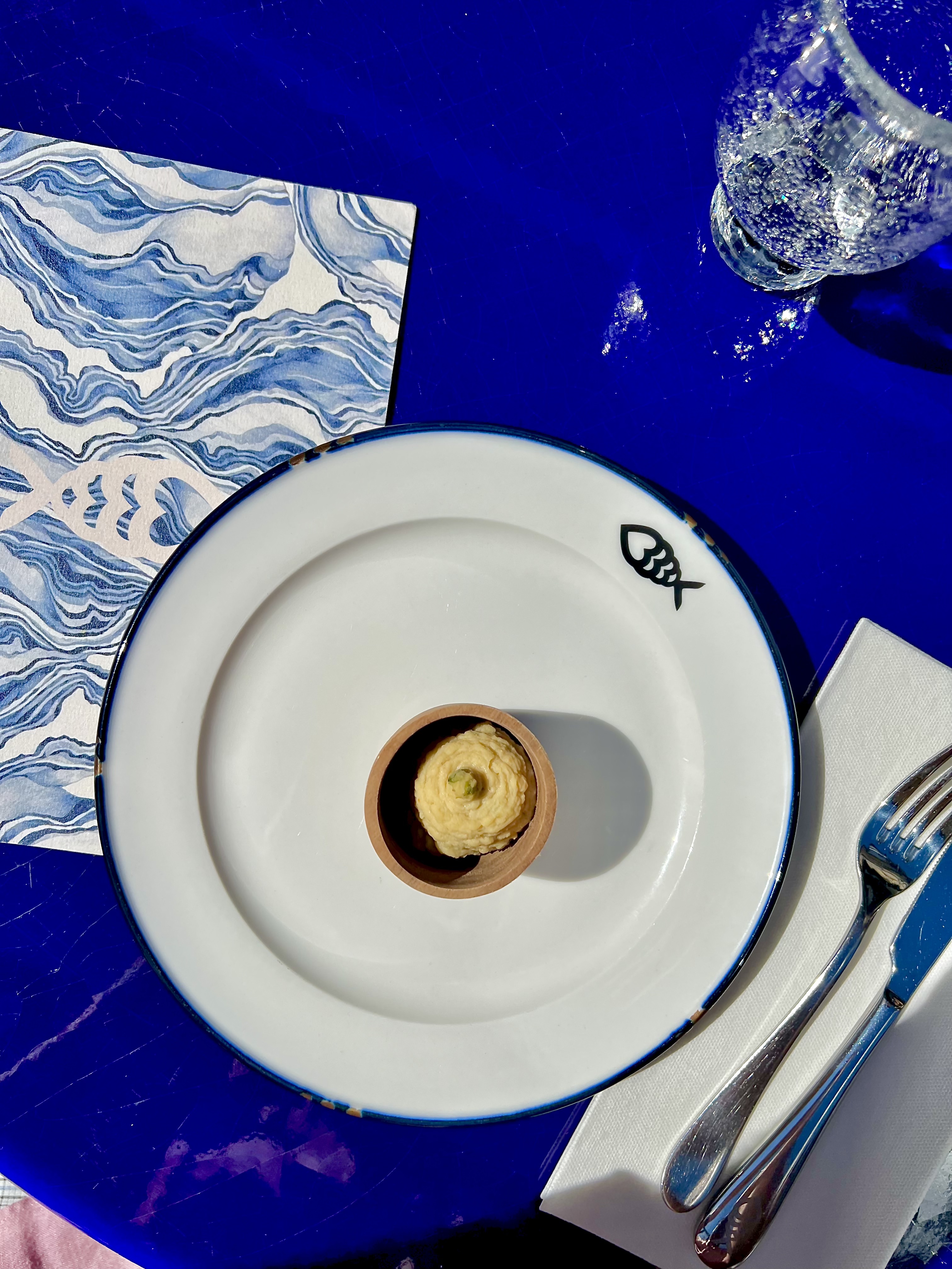 La décoration raffinée signée de la Maison Maju (Carmela, Boccaccio…) est lumineuse et contemporaine entre le bleu des azuléjos, entièrement peints à la main en une fresque par le jeune et très talentueux artiste Nicolas Blazicevic (Type 55 et Bocaccio) et le blanc immaculé d’un poulpe tentaculaire au plafond signé du carnavalier Cedric Pignataro. L’ensemble est cadencé de mobiliers élégants, le bar arrondi, où l’on peut déjeuner ou dîner, délimite l’espace avec douceur et harmonie. La terrasse en angle est un parfait refuge, vaste, aérée et cadencée de la façade ocre.