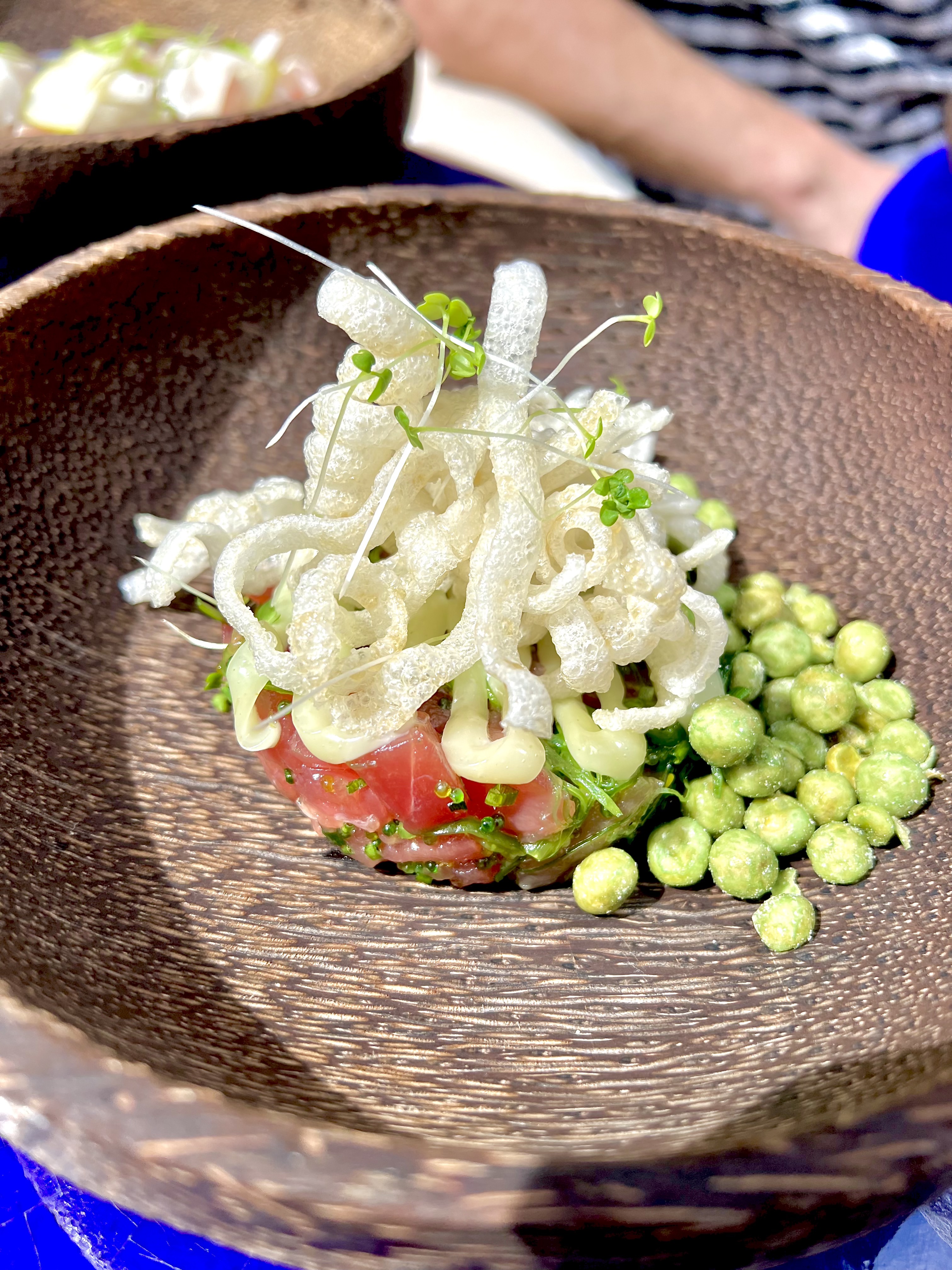 Pour débuter, les cocktails originaux et créatifs sont identitaires avec une véritable recherche mixologique, comme le Coco Branco (Rhum Fatwash Coconut, Martini Blanc infusé à l’algue Nori, Luxador Bitter, Eau de coco), le Aveia C.M.P (Pisco, Lillet Blanc, Lait d’avoine torréfié, Citron jaune) ou encore le Amor de Arroz (Gin, Saké Junmai, Eau de riz, Sirop de Fleur d’oranger maison, Vinaigre de riz, Congee). Ils s’accompagnent d’un onctueux Houmous, relevé d’iode des algues, et d’excellents Accras de Morue au remarquable crousti-moelleux et qui se révèlent en intensité d’une combinaison de morceaux de morue et de pomme terre à la dégustation. La crème de zatar vient titiller de sa douceur corsée et herbacée.