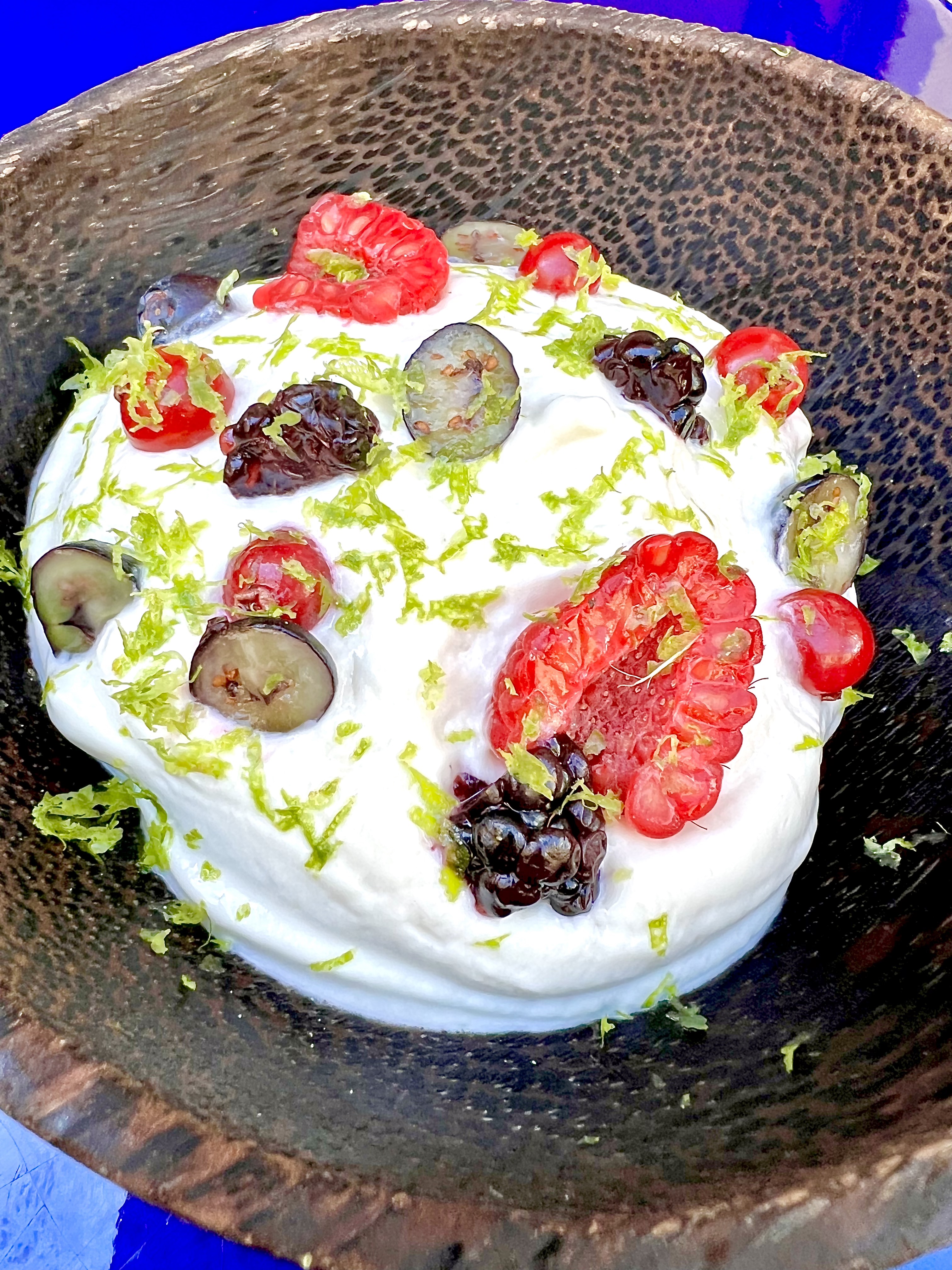 Le Ceviche de Saint-Jacques, Fruit Passion, Purée d’Avocat, Kumquat : les Saint-Jacques ont cette pertinence de leur vivacité relevée de la complexe et plaisante acidité du fruit de la passion, la purée d’avocat apporte la douceur et la rondeur, le kumquat confit vient titiller d’une fraîche sucrosité. Les dés de mangue et la coriandre sont la note poivrée. Un équilibre absolu!