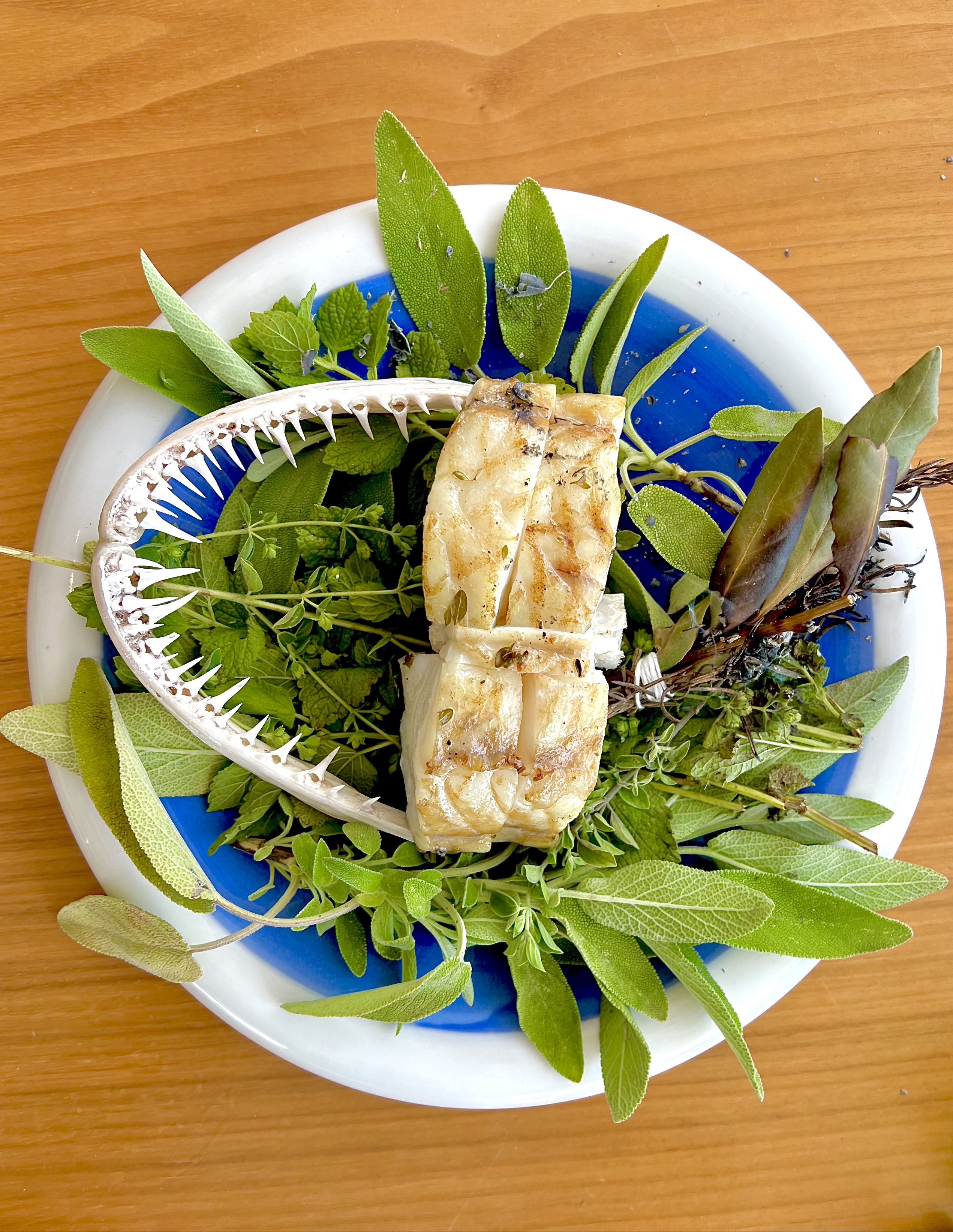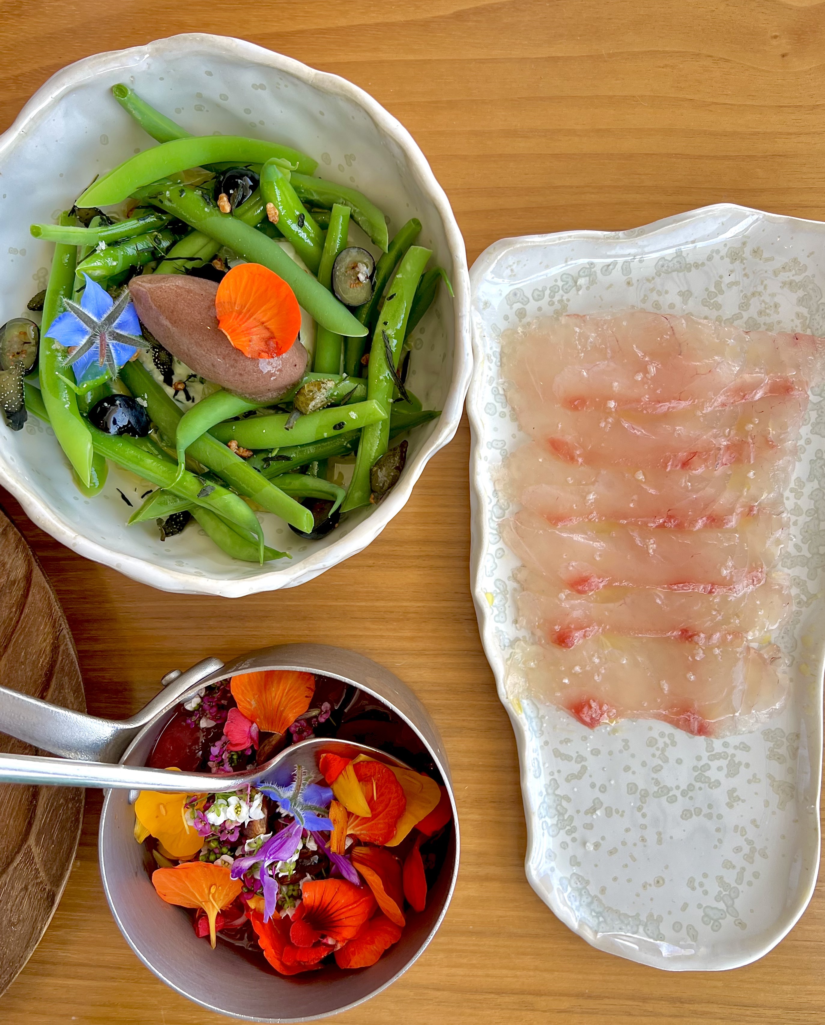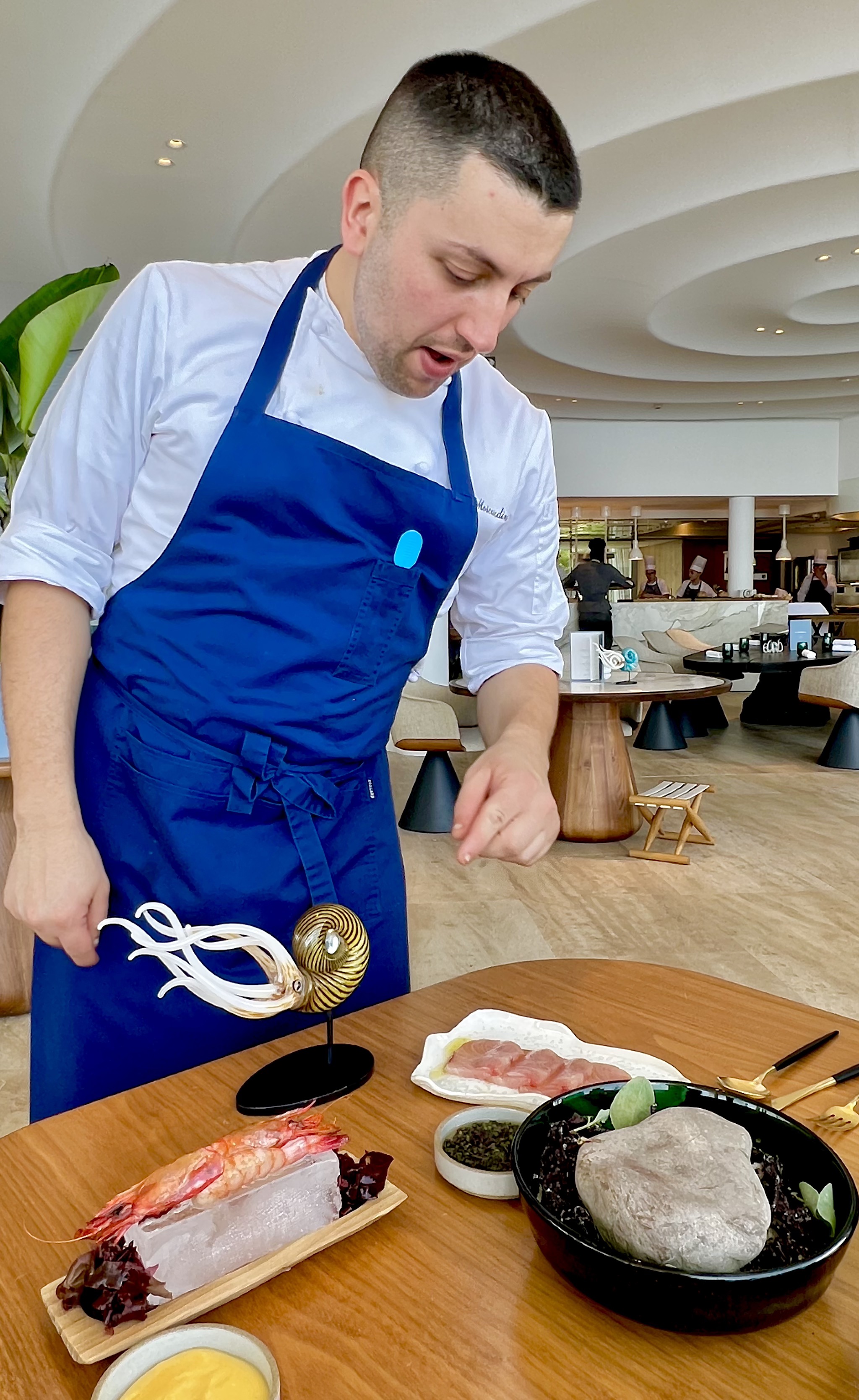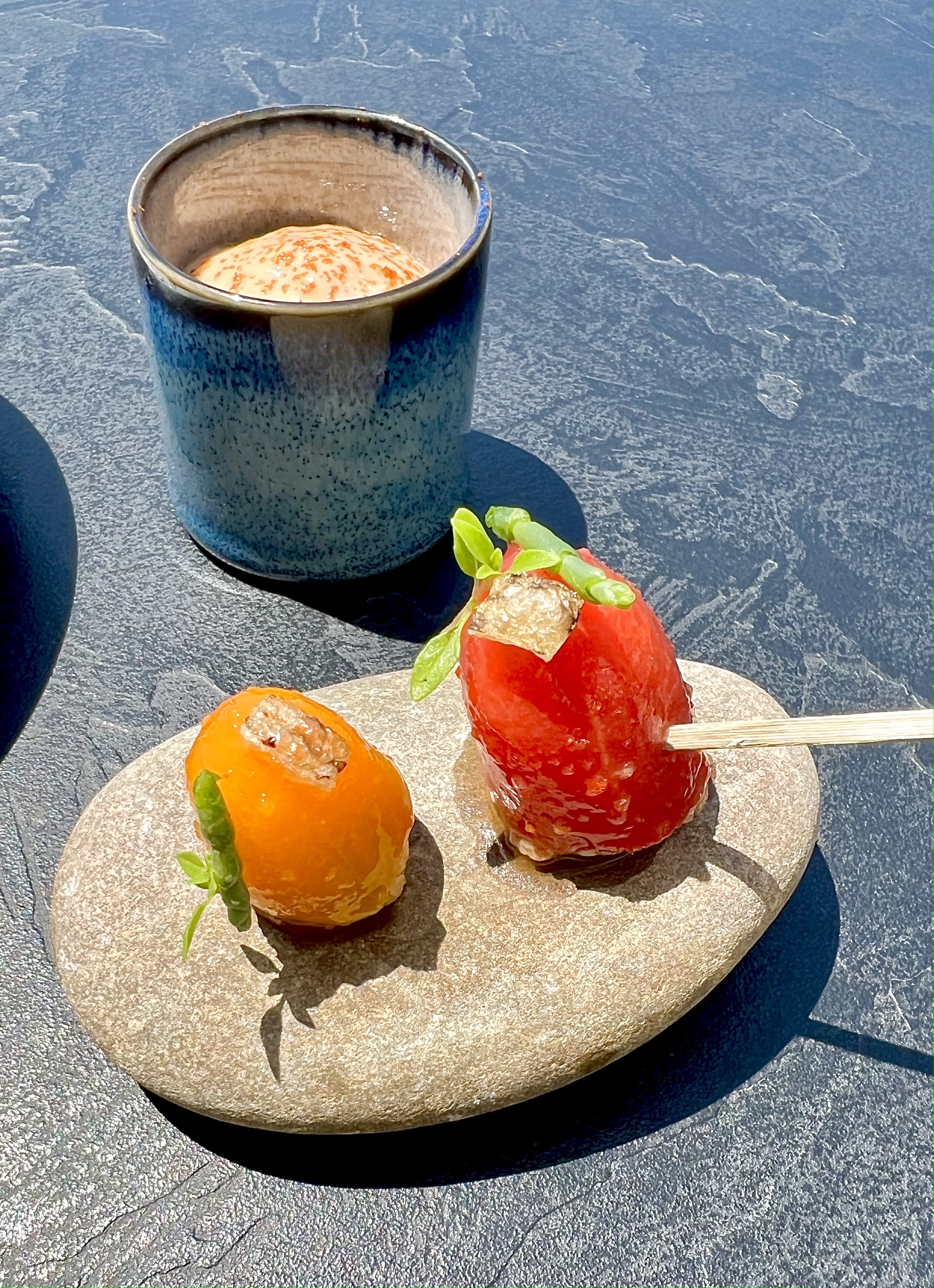 C’est installé sur cette terrasse, côté bar, la plus époustouflante de la région, que vous allez déguster les Tapas de la Mer, comme cette charcuterie de différents poissons assaisonnés individuellement, thon fumé, thon aux herbes, espadon fumé et espadon aux épices, la chair est fondante et texturée à la fois, avec une intensité viande et très jambon, les pickles de concombre et les feuilles de kaffir apportent un kick à l’ensemble. Les minis et juteuses tomates farcies d’une brandade éclatent en bouche de sucrosité et de crémeux d’iode. Les churros aux gambas, à « dipper » dans une sauce cocktail aux algues, croustillent de vie. C’est absolument appétant et vivifiant.