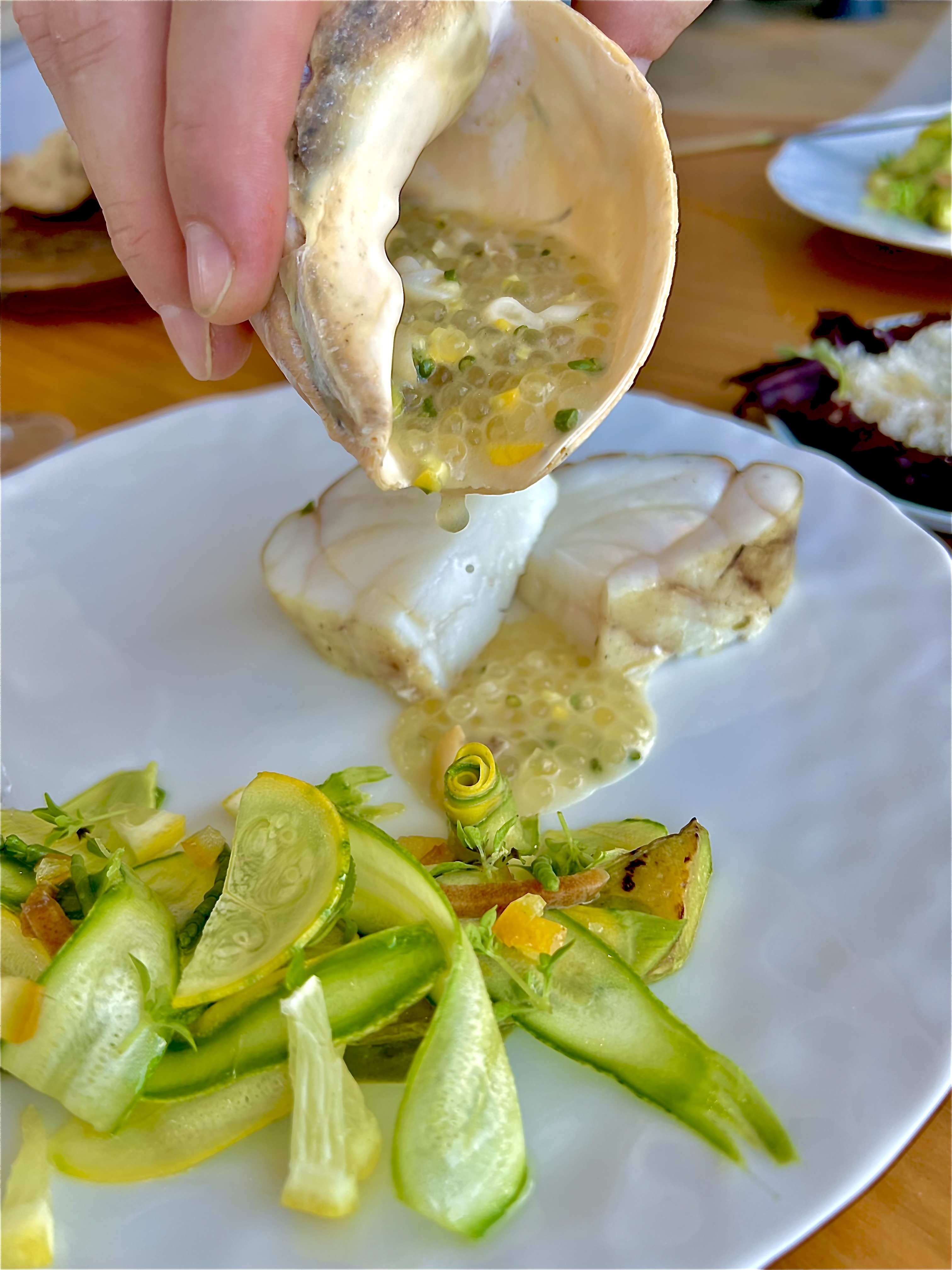 La Lotte, pêchée a portée de brasses et maturée 15 jours, arrive sur table de sa vivance d’une cuisson d’exception, braisée sur l’arête, où la nacre signifie tout. La sauge fumée délivre ce côté réconfortant et ésotérique d’une cheminée savoureusement purifiée, la sauce coquillage au vermouth (rappel des sauces d’autrefois dans une intensité moderne) qui est servie à la manière d’un Robinson dans une coquille de lambi, vibre de vérité des coquillages et claque des bulles d’agrumes du tapioca marin. Les courgettes jaunes et vertes cuites au barbecue se déclinent d’elles-mêmes et se relèvent de poutargue fraîche et de salicorne.
