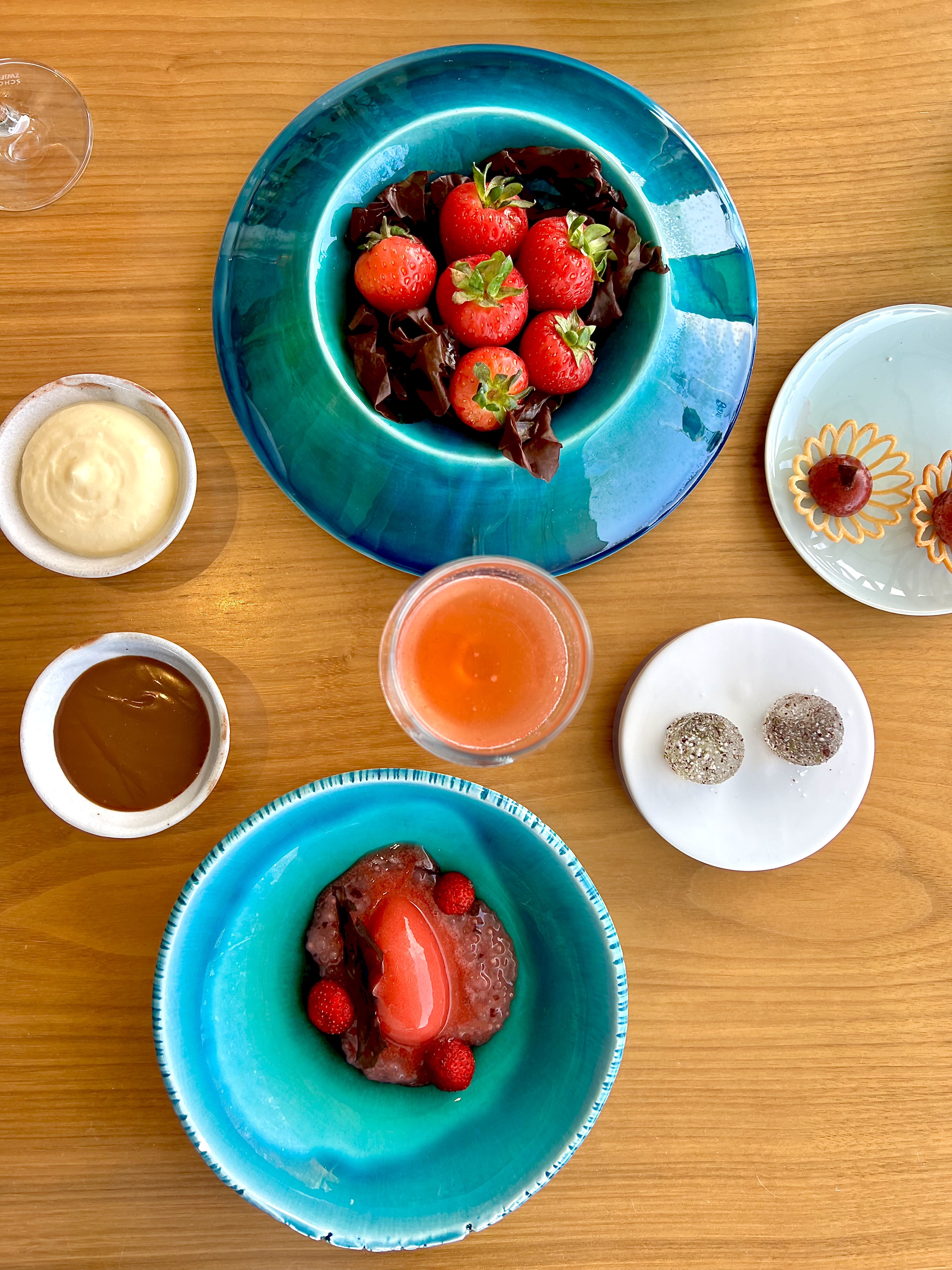 Les desserts, signés de la Cheffe Pâtissière Julieta Cavaneta et de Noémie Grosse, déclinent le fruit dans toute sa saisonnalité, ici la fraise de Carros est travaillée de plusieurs façons : entière et servie avec une déclinaison de sauces et crèmes : Sabayon au Champagne, Crème crue à la vanille givrée, sauce chocolat Maison Duplanteur, en Sorbet et perles du Japon, en Tartelette et algues, en eau marinée et enfin en pâtes de fruits de la mer à l’algue dulse.