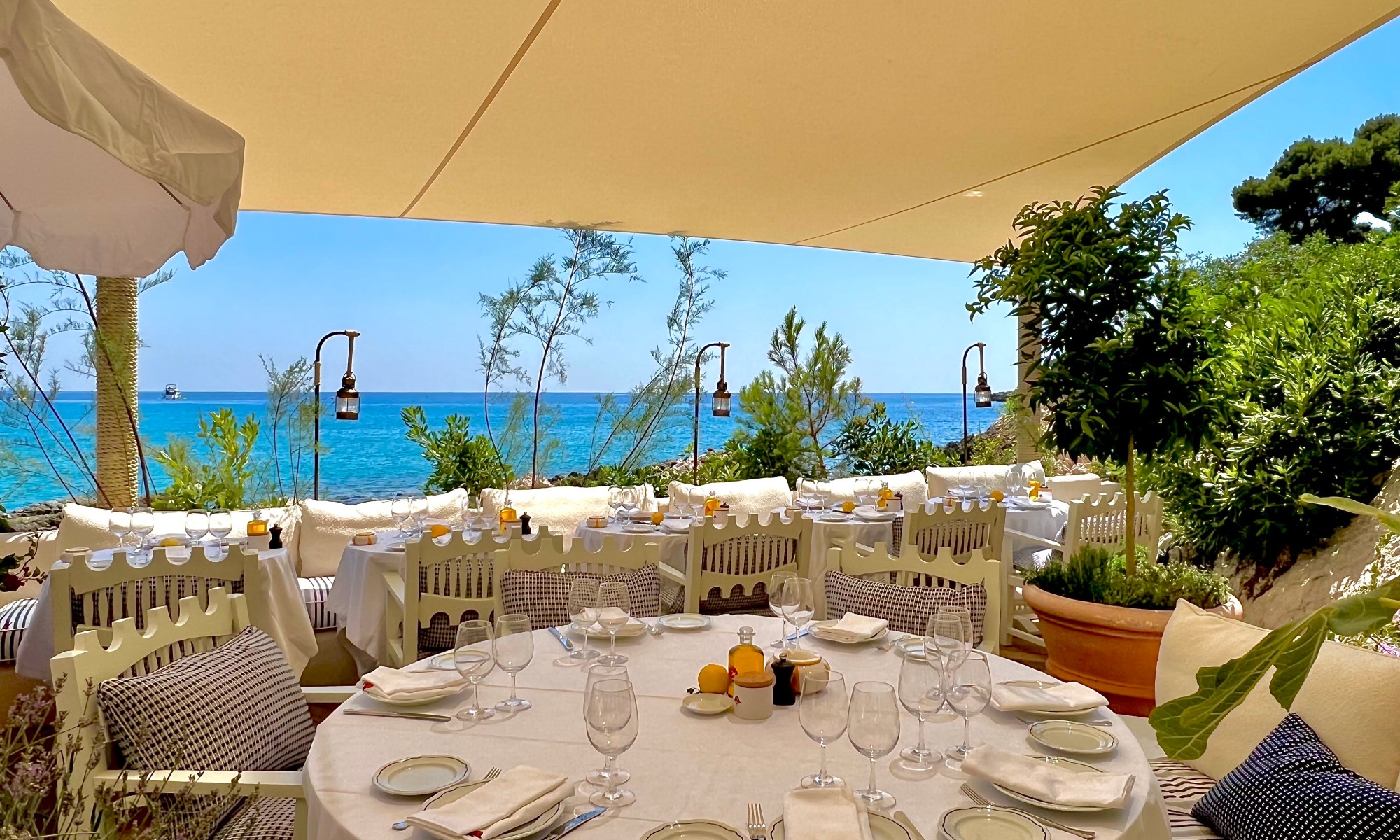 La décoration, naturellement raffinée, se baigne de lumière tout en se cachant des jeux d’ombres bienveillants des toiles tendues le jour, elle se fait romantique et distinguée le soir à la lueur des bougies cadencée du son des vagues. Les terrasses, sur différents niveaux et juste au dessus des flots, permettent de vivre ce Pirate en toute quiétude d’une inoubliable vue pleine mer ou sur la belle ville de Menton. Chaque table est un spot idéal, les chaises, et les moelleuses et immaculées banquettes donnent envie de s’y lover avec une élégante nonchalance, un cocktail, une coupe de champagne ou simplement un verre perlant de fraîcheur d’un rosé cristallin à la main.
