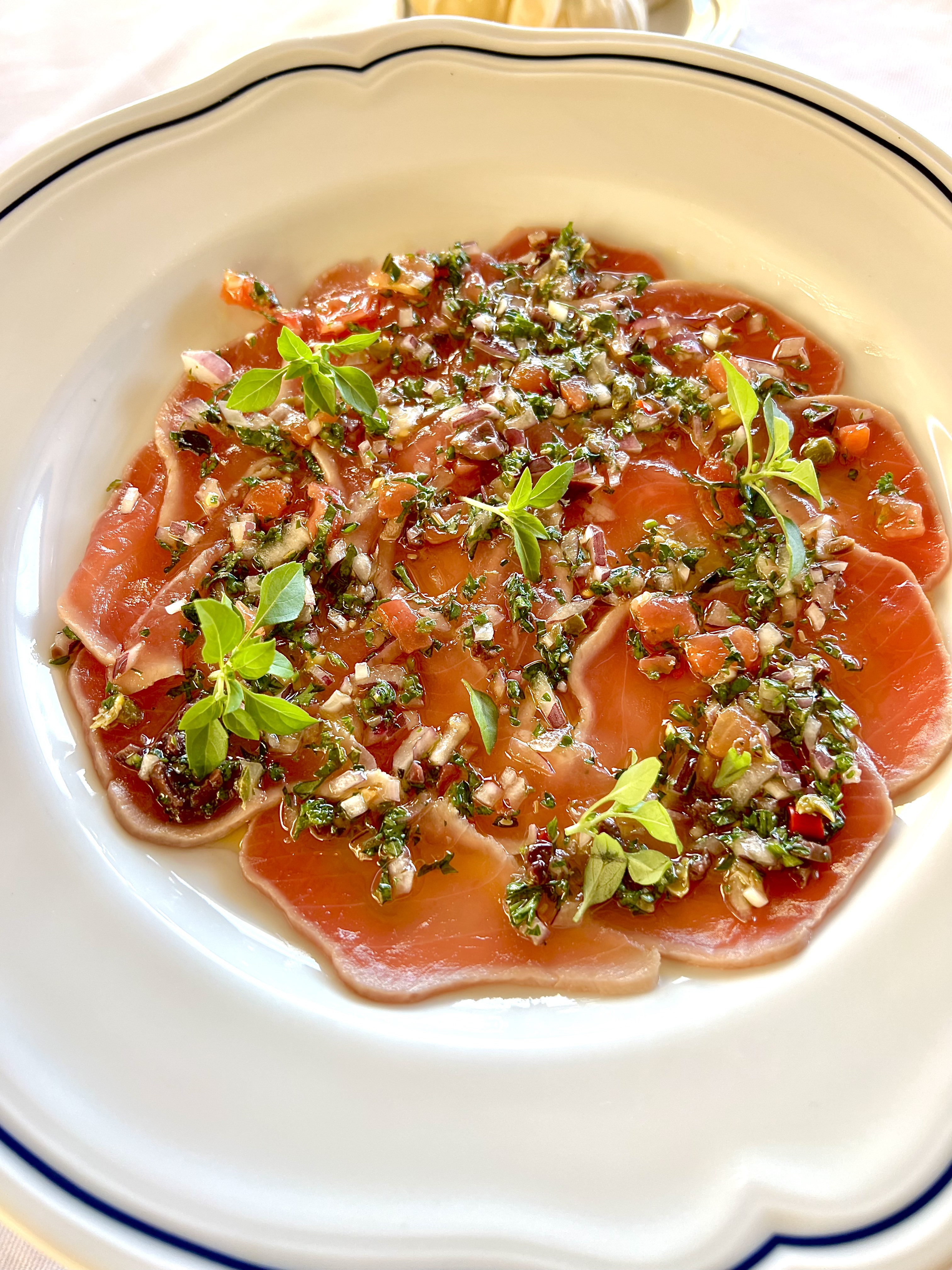 Les Tranches de thon rouge cru, à la belle mâche, s’assaisonnent de pertinence à l’italienne alla puttanesca, de tomates, d’ail, de câpres, d’olive et d’anchois. C’est addictif et vif à la fois.