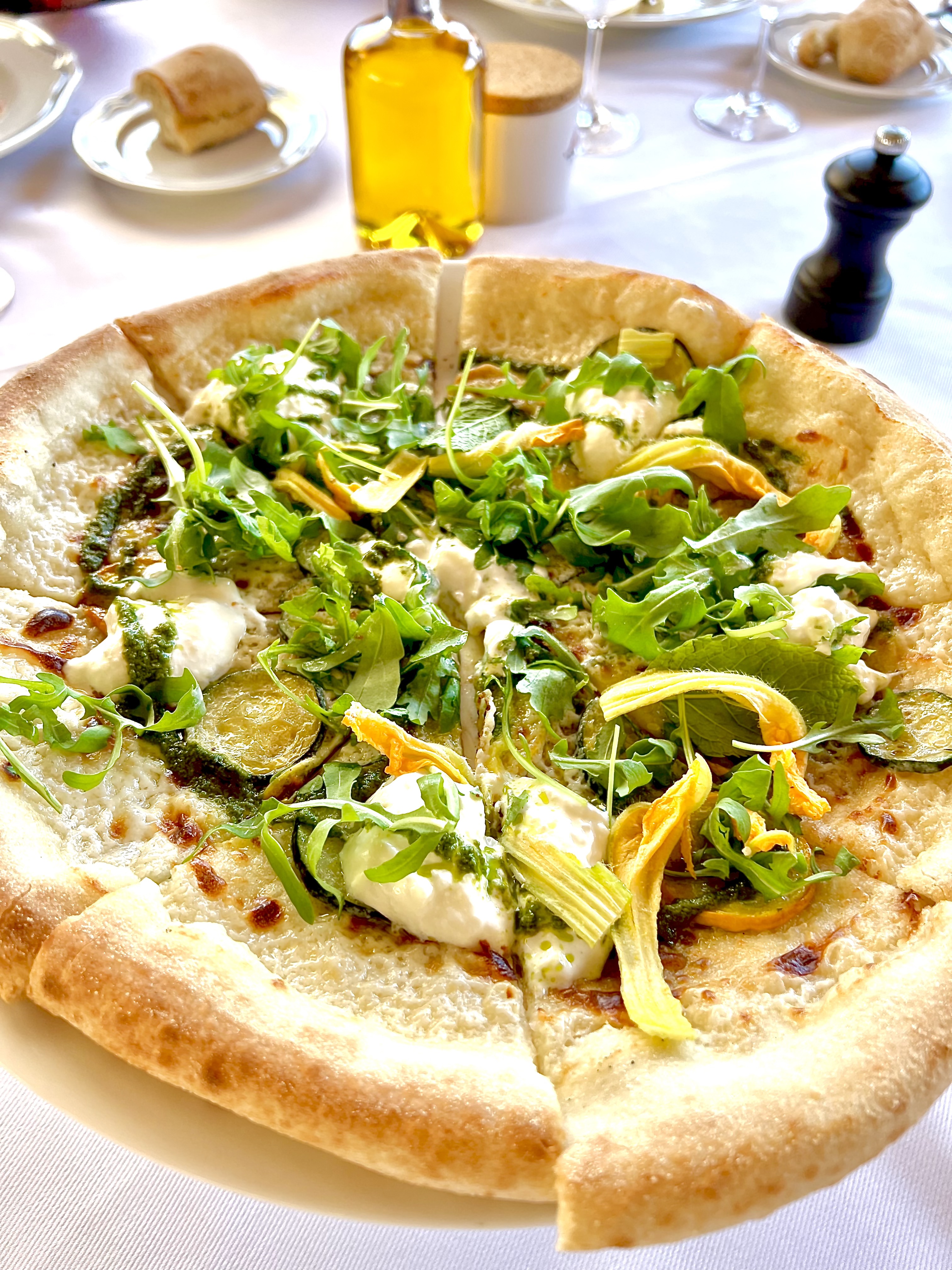 Fleurs de courgettes, stracciatella et pesto de roquette.