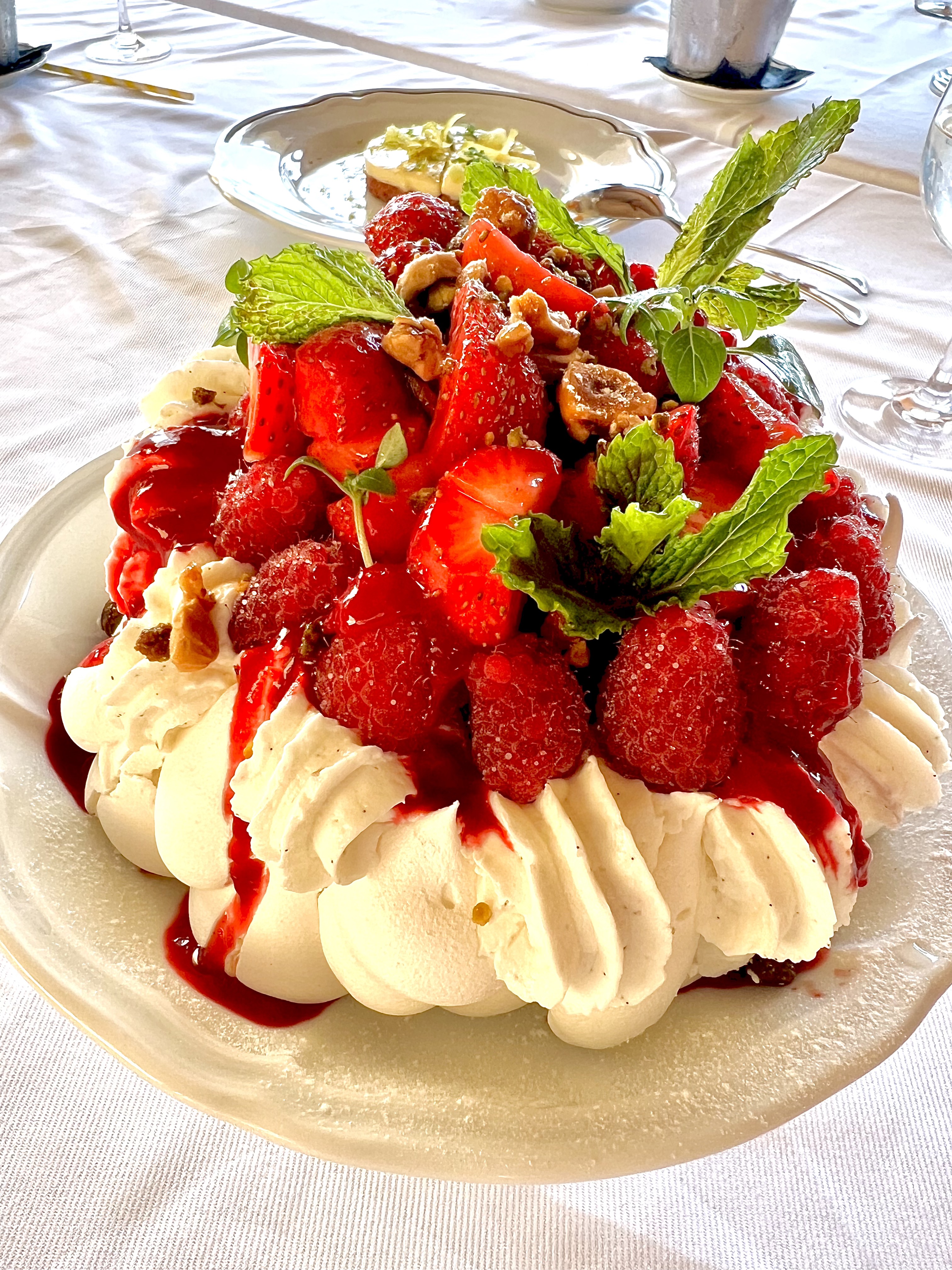 Les desserts vibrent d’une parfaite Tarte au citron, zestes confits de citron vert et basilic ou d’une imposante et aérienne Pavlova de fruits rouges, meringue, sorbet, noisettes, pistaches caramélisées et chantilly. La Tarte est également Tropézienne ou Soufflée au chocolat.