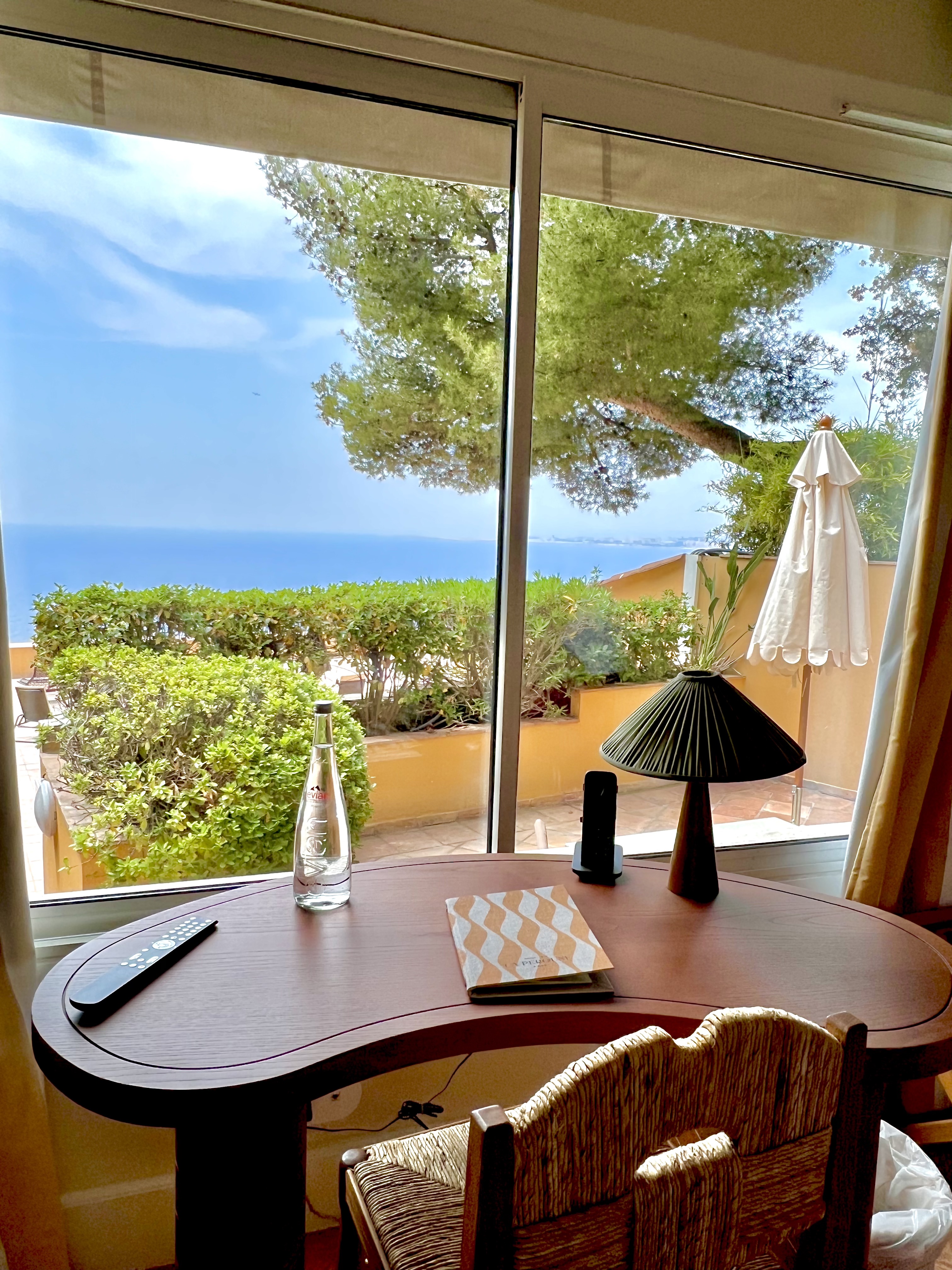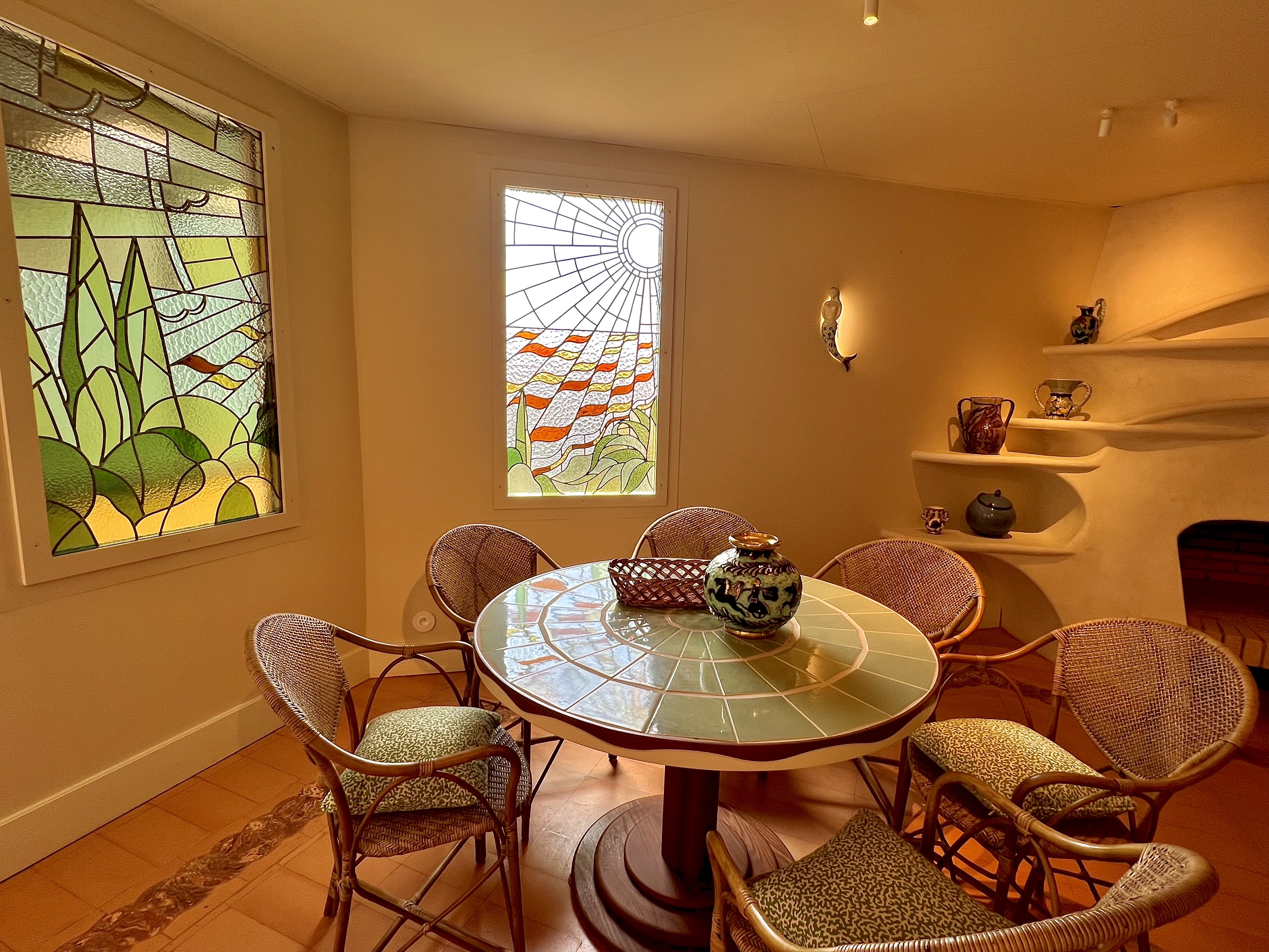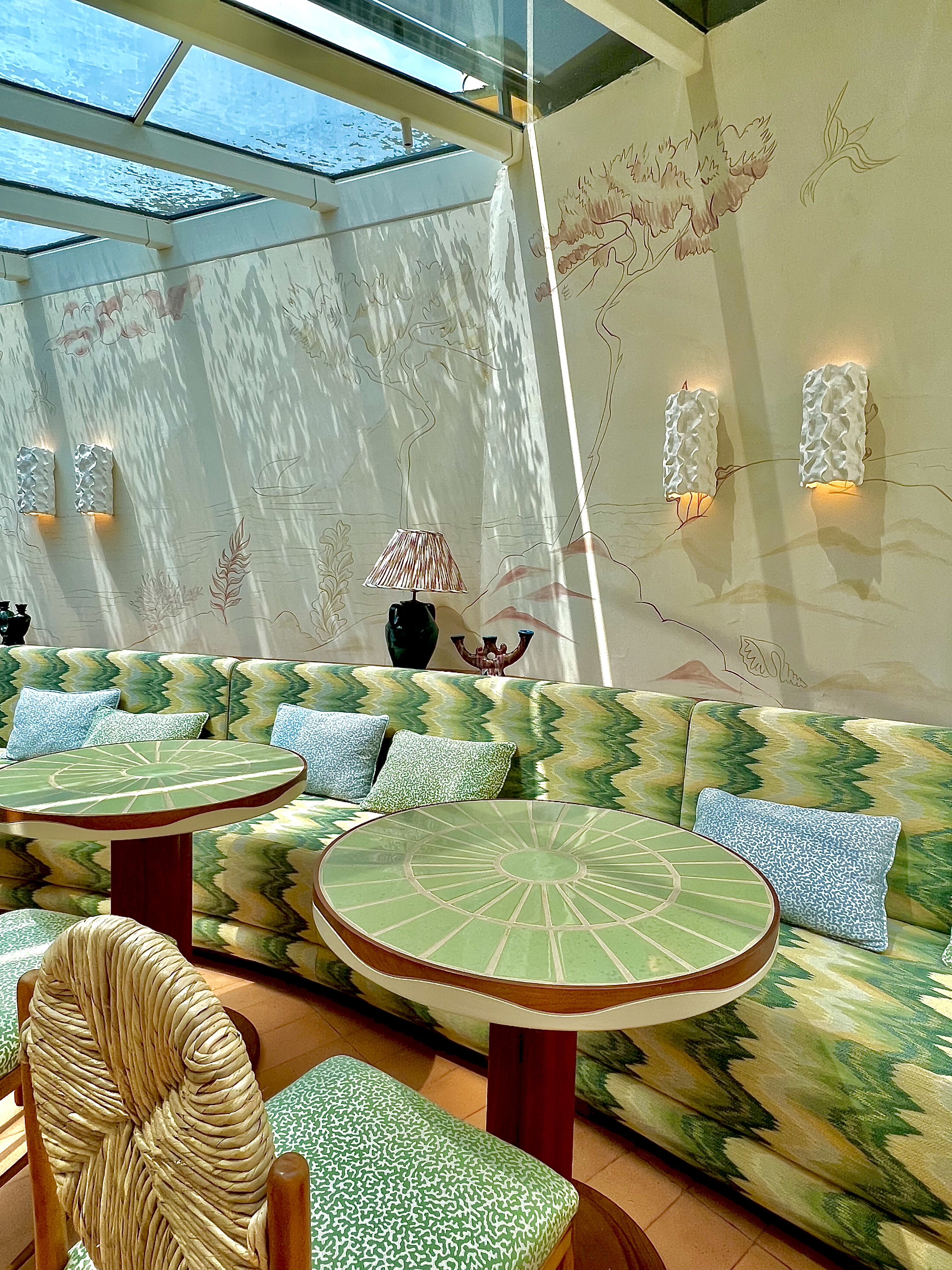 Le lobby vous plonge immédiatement dans cette facétieuse insouciance « So French Riviera »! Après 6 étages et un dédale de couloirs, vous découvrez alors une incroyable oasis de sérénité et d’élégance : Le Patio, véritable perchoir secret et gourmand, où se dissimule le bar et le restaurant. La verrière vous abrite en lumière les jours d’hiver, il sera bon de se nicher sur la banquette au vert graphique et à la courbe d’une vague, les murs, quant à eux, sont à peine « tatoués » – comme au fusain à la main – de dessins racontant la Méditerranée, entre pins parasols, ligne d’horizon d’une mer à l’infini, de roches et d’étoiles de mer : une belle signature du très inspiré artiste Nicolas Blazicevic (Type 55, Peixes Bonaparte, Boccaccio). La cheminée à cette allure généreuse et dodue d’une poterie et les vitraux ont cette griffe très Le Corbusier.