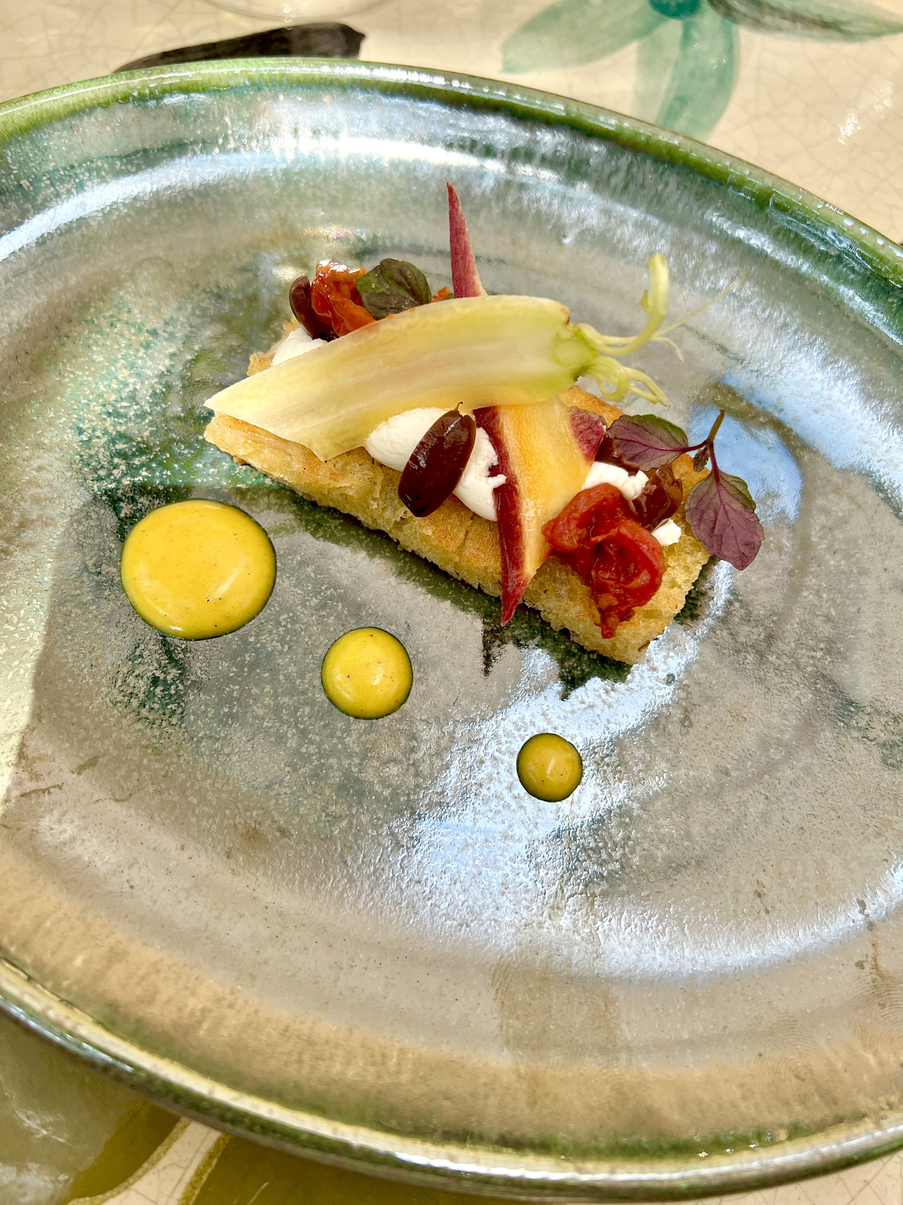 Le Pain perdu de focaccia et chèvre au citron vert, tomates confites et carottes a cette croque en bouche appétante.