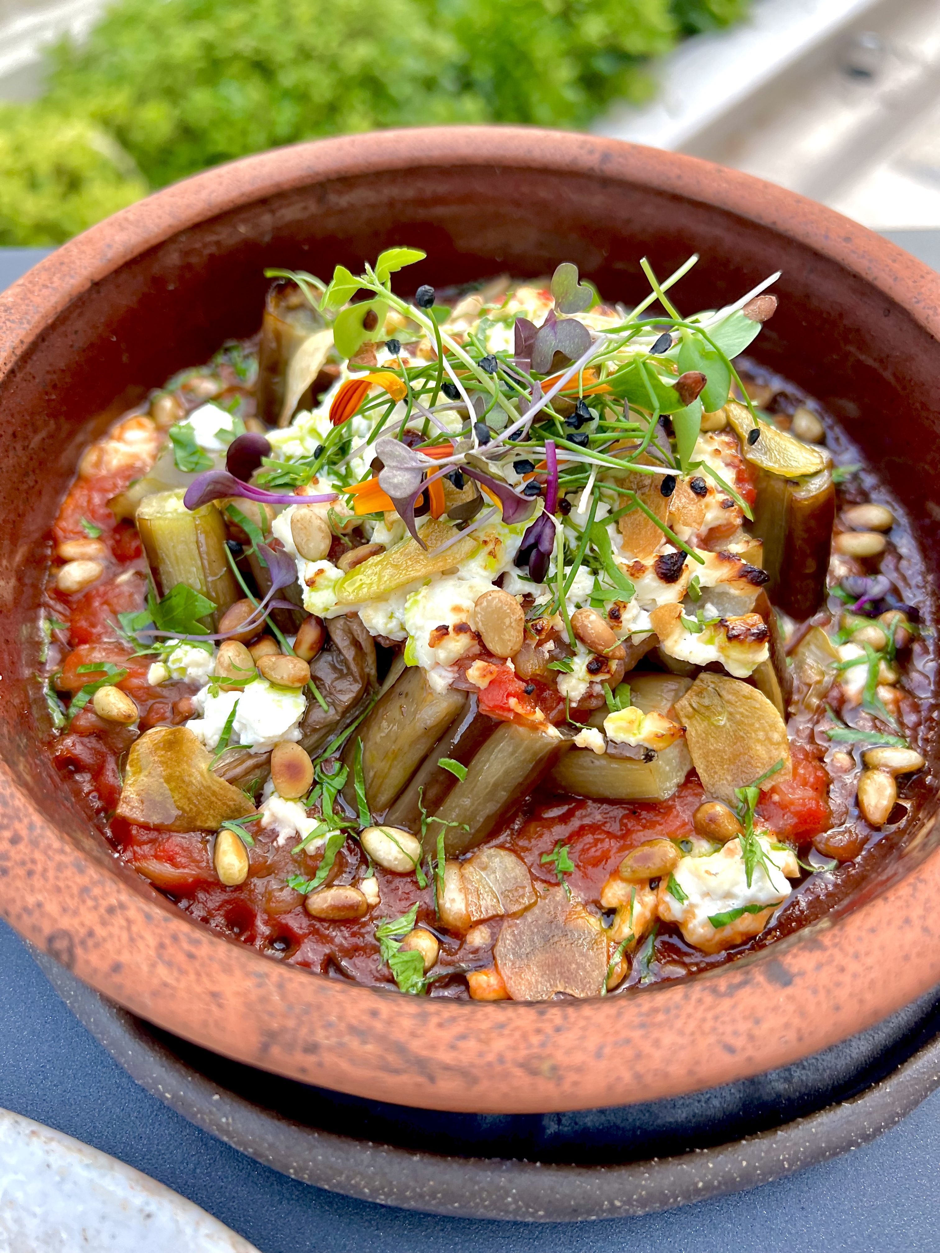 l’Umut’s Bayildi à s’évanouir de bonheur, comme le raconte l’histoire : celle d’un Imam, qui quand il goûta pour la première fois ce plat si merveilleux et si savoureux, s’évanouit. Cette cassolette d’aubergine confite, sauce tomate aux oignons, féta, arachide & chips d’ail est véritablement une gourmandise à elle toute seule, tout est parfaitement en place de cette addictive compotée, les pignons apportent la croque qui fait mouche en bouche et les herbes fines la fraîcheur idéale.
