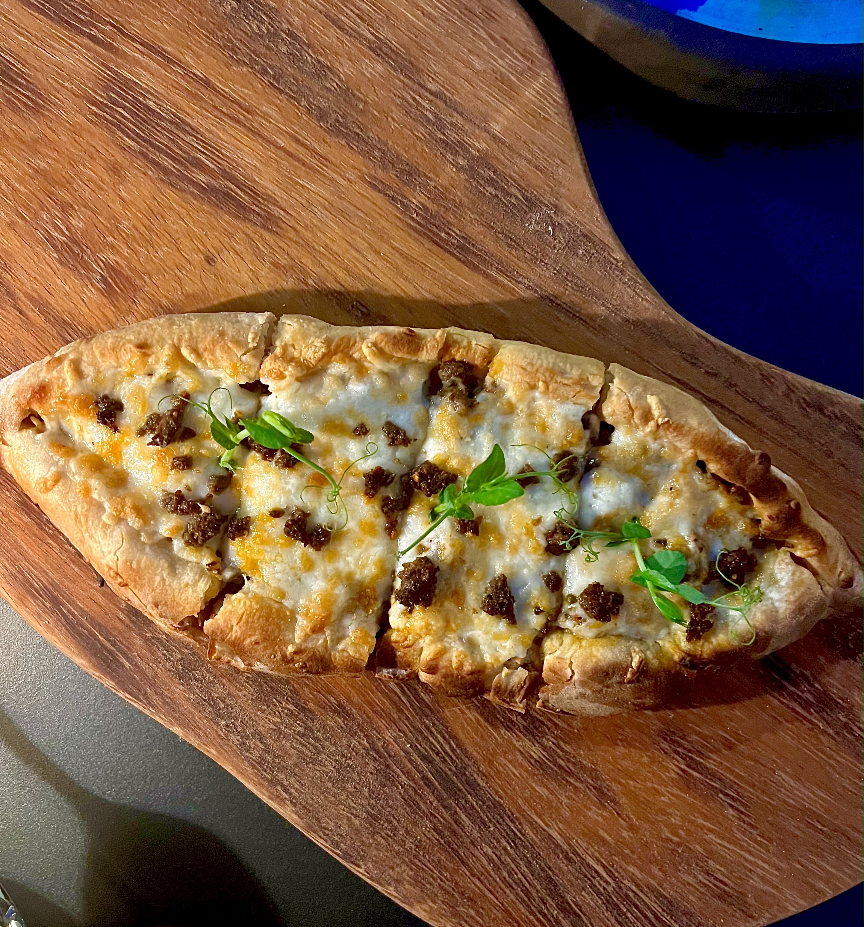 Les pains, faits maison et cuits au four devant vous, sont une réelle valeur ajoutée et se savourent tels des plats et sans façon avec les mains pour le plaisir des papilles, comme le Sucuk Pide au fromage et à la saucisse turque (à base de boeuf et d’agneau légèrement épicée).