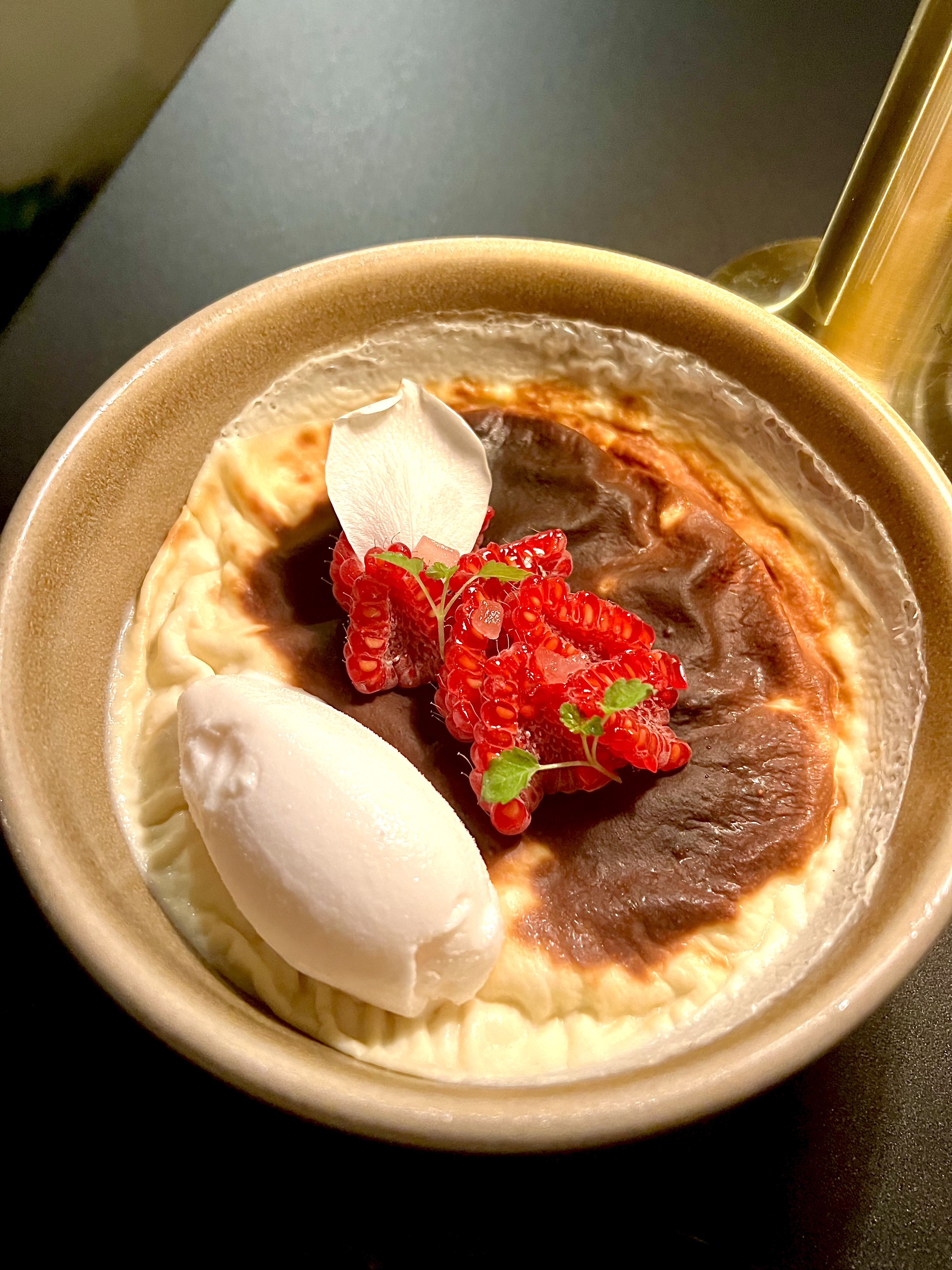 Les desserts se font véritables contes des douceurs comme le Künefe : madjule fondu (fromage au lait de vache), mélangé à la mozzarella, et imprégné de sirop de fleur d’oranger et d’eau de rose, le tout est enroulé de cheveux d’anges et servi tiède. On y pose dessus une glace pistache enrobée de pistaches concassées. Le Firin Sütlaç : ce riz au lait traditionnel légèrement crouté de sa cuisson au feu garde de son crémeux, les framboises, la glace à la rose et loukoum viennent vivifier de leur vie fruitée et florale.