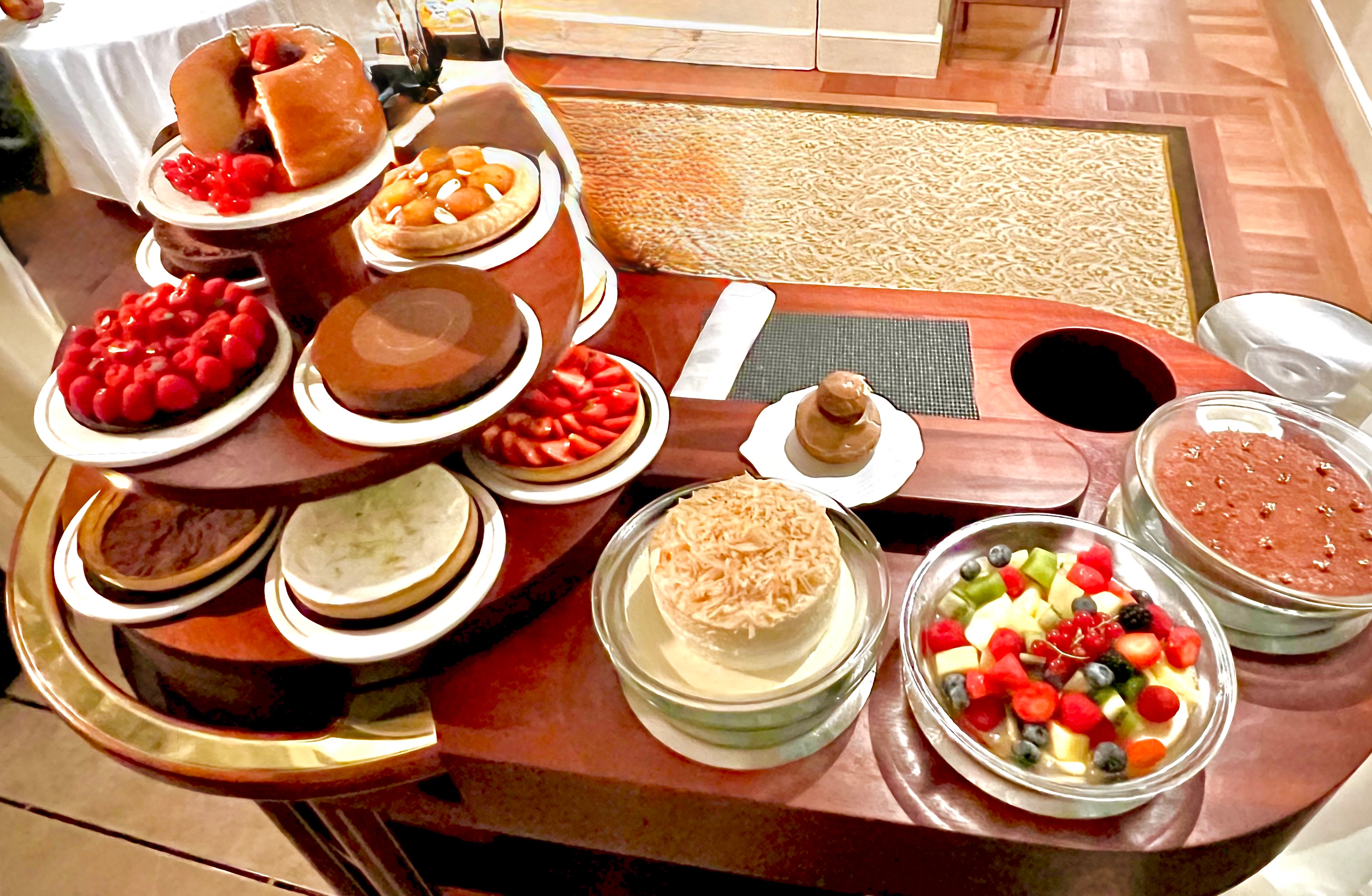 Le Chariot de pâtisseries et entremets est aussi spectaculaire que celui du pain et fait chavirer d’envie les pupilles et les papilles avec cette folle et déraisonnable envie de tout goûter pour éviter la cruauté du choix. Plus d’une quinzaine de délices entre le Savarin, la mousse au chocolat, l’île flottante, la religieuse, les différentes tartes de fruits de saison, de chocolat, de citron, des entremets chocolat-passion et tant d’autres, qu’il serait totalement déraisonnable d’énumérer.
