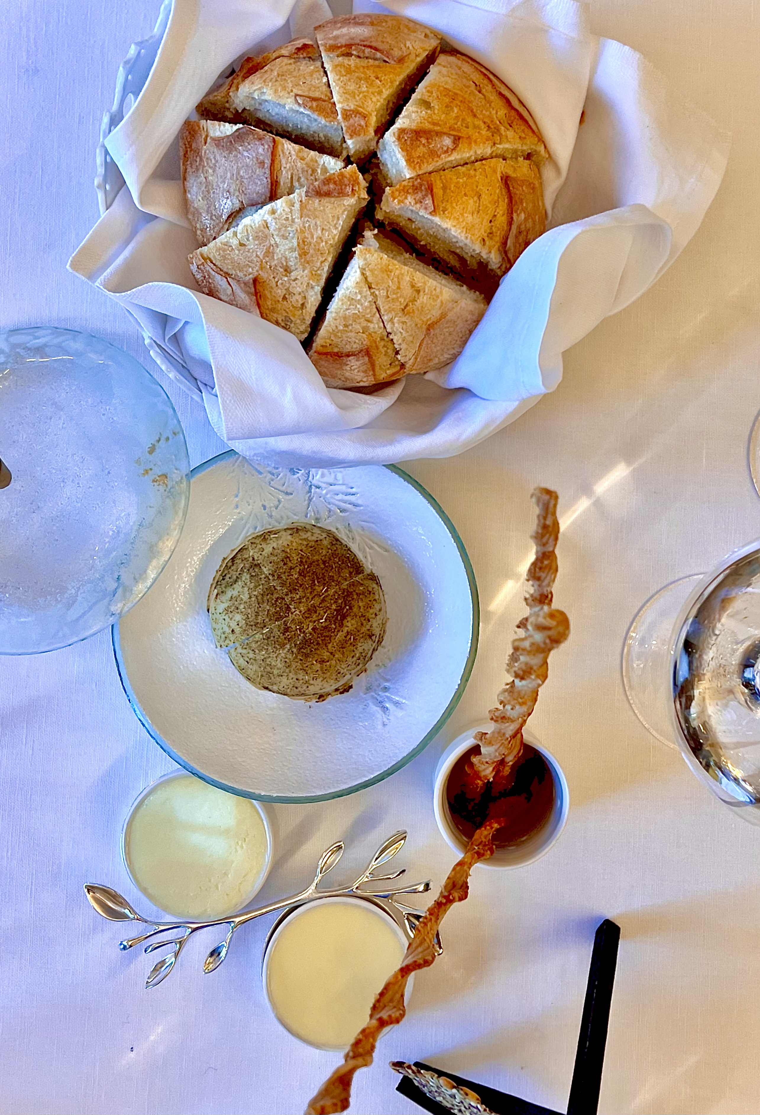 Arrive l’instant du « Pain » et de ses déclinaisons, présenté et rompu devant vous par la cheffe adjointe Amélia Losilia, et cela débute avec la Focaccia à l’origan cuite à la vapeur et servie chaude sous cloche qui rappelle l’histoire de Nice qui fût un temps italienne, tout comme les Gressins au pecorino truffé du fromager voisin Nery. En clin d’oeil aux 6000 oeuvres de l’hôtel, le Cracker, sans gluten et vegan, à base de différentes graines (chia, courge, sésame, tournesol), préparé en grande plaque est cassé à l’instant pour créer des formes abstraites posées sur un petit chevalet. Le pain en miche au levain de 28 ans d’âge est celui du célèbre artisan-boulanger antibois Jean-Paul Veziano, quatrième génération du nom. Pour « tartiner » d’émoi cet éventail, deux sortes de beurres sont proposés : tout d’abord en tradition, le beurre salé de Normandie (en hommage aux origines de la cheffe), puis un beurre vegan qui ouvre une autre et ingénieuse perspective, à base de beurre de cacao, d’huile d’olive et jus de citron de Menton.