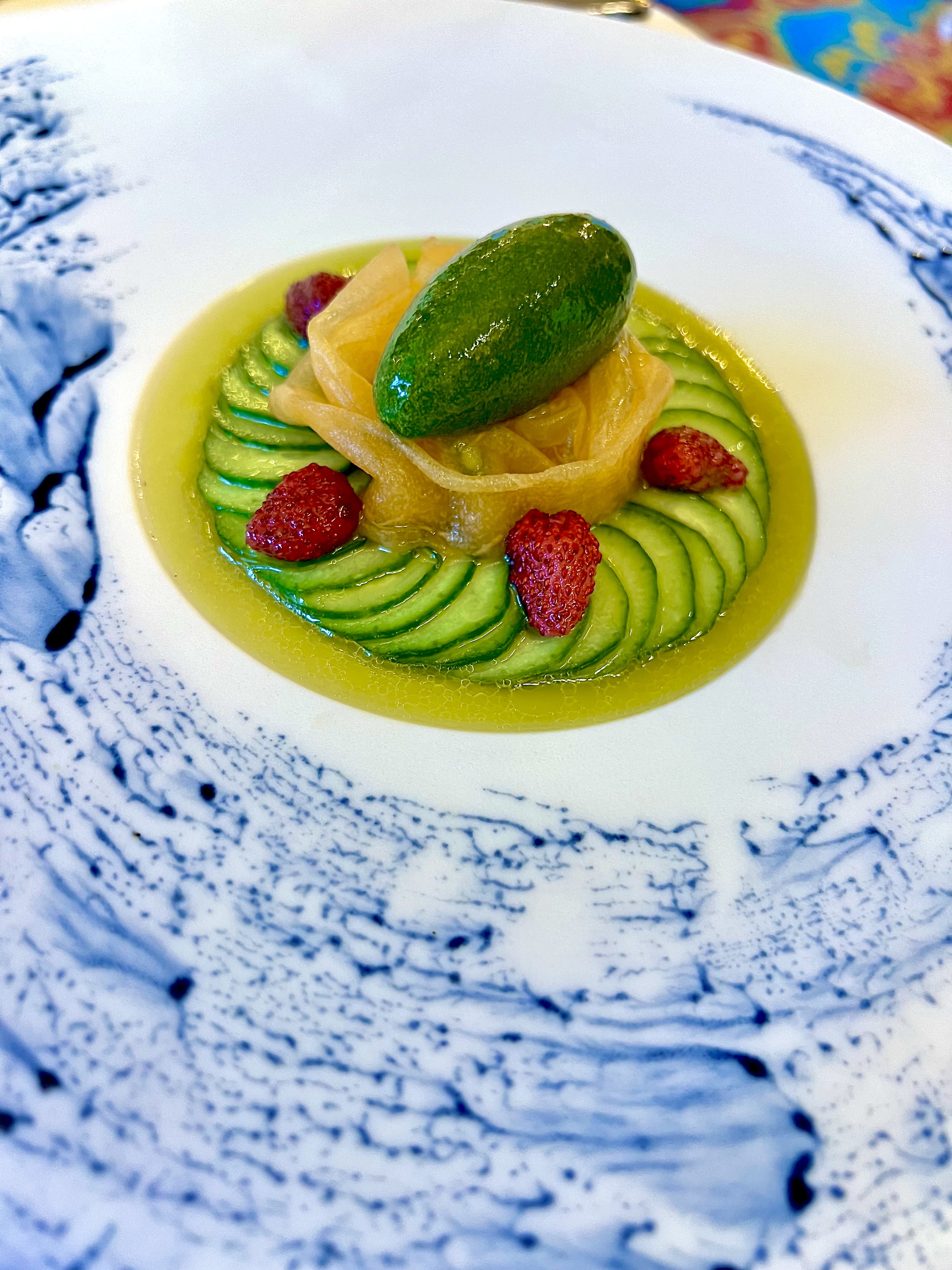 Instant végétal, melon, concombre et fraise des bois : fulgurance du végétal dans cet instant suspendu en modernité d’une grande ampleur en bouche. Un triptyque en totale harmonie entre saveurs à la fois douces et juteuses, textures en croques, fondantes et moelleuses du melon, du concombre et des fraises des bois. La frémissante vinaigrette au miel de Menton délivre toute la pertinence de son acidité et le sorbet aux herbes (basilic, estragon, coriandre) vient rafraîchir en puissance aromatique, telle la rosée dans un potager.