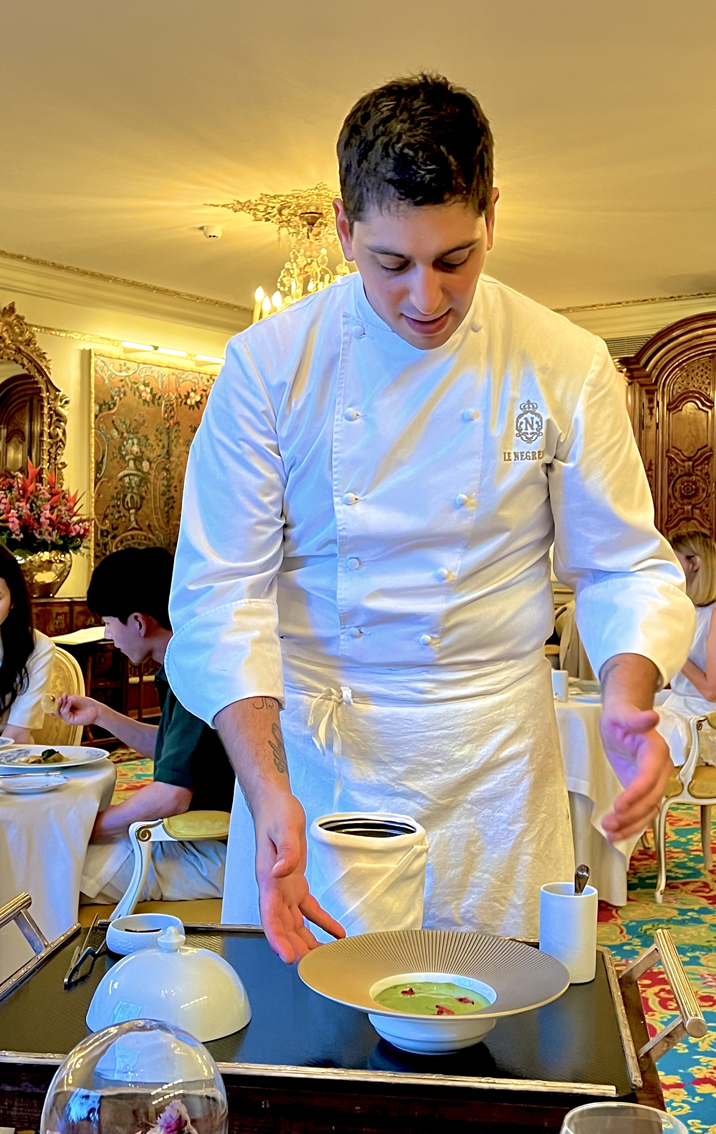 Le service en salle, orchestré avec précision et attention par Julien Freulon, le nouveau directeur, est de haute volée, les gestes sont assurés et ont la douce et sincère chaleur humaine, subtilement accompagnante. Les chefs en salle, qui actent le partage du pain au guéridon ou la finalisation d’une assiette, délivrent cette sensation privilégiée d’une expérience gastronomique hautement personnalisée et d’une proximité unique avec la brigade.