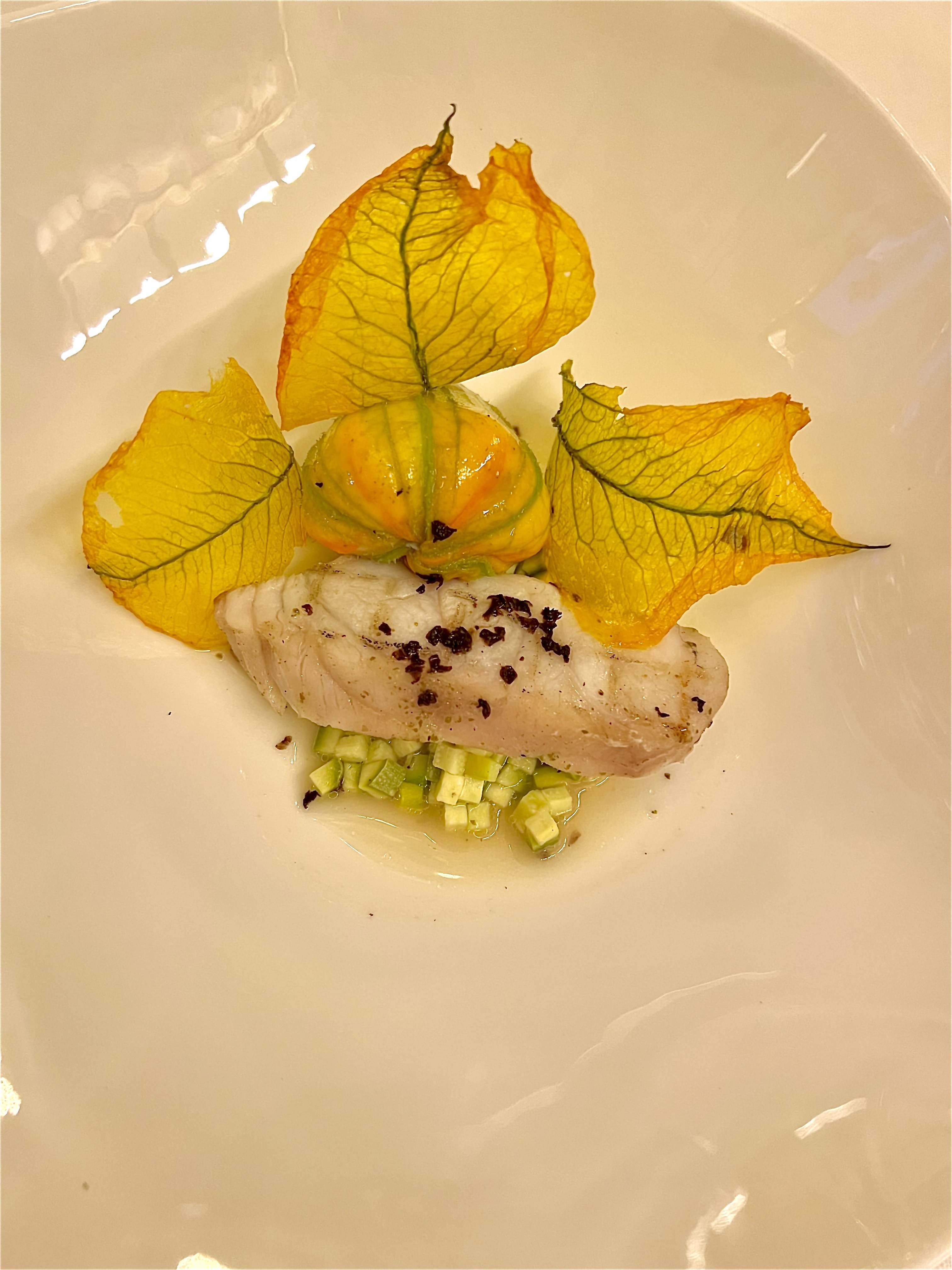 Mérou de Méditerranée mariné et grillé au poivre vert, fleurs de courgette de chez Jean-Charles Orso : la fleur de courgette est pratiquement le point central, elle est, d’une part, pétrifiée de ses pétales frits et, d’autre part, farcie et dodue de sa farce fine. Le mérou, d’une belle cuisson grillée qui garde tout son moelleux, est timidement mariné du trio : citron, ail, poivre vert. La courgette en brunoise donne de son mordant.