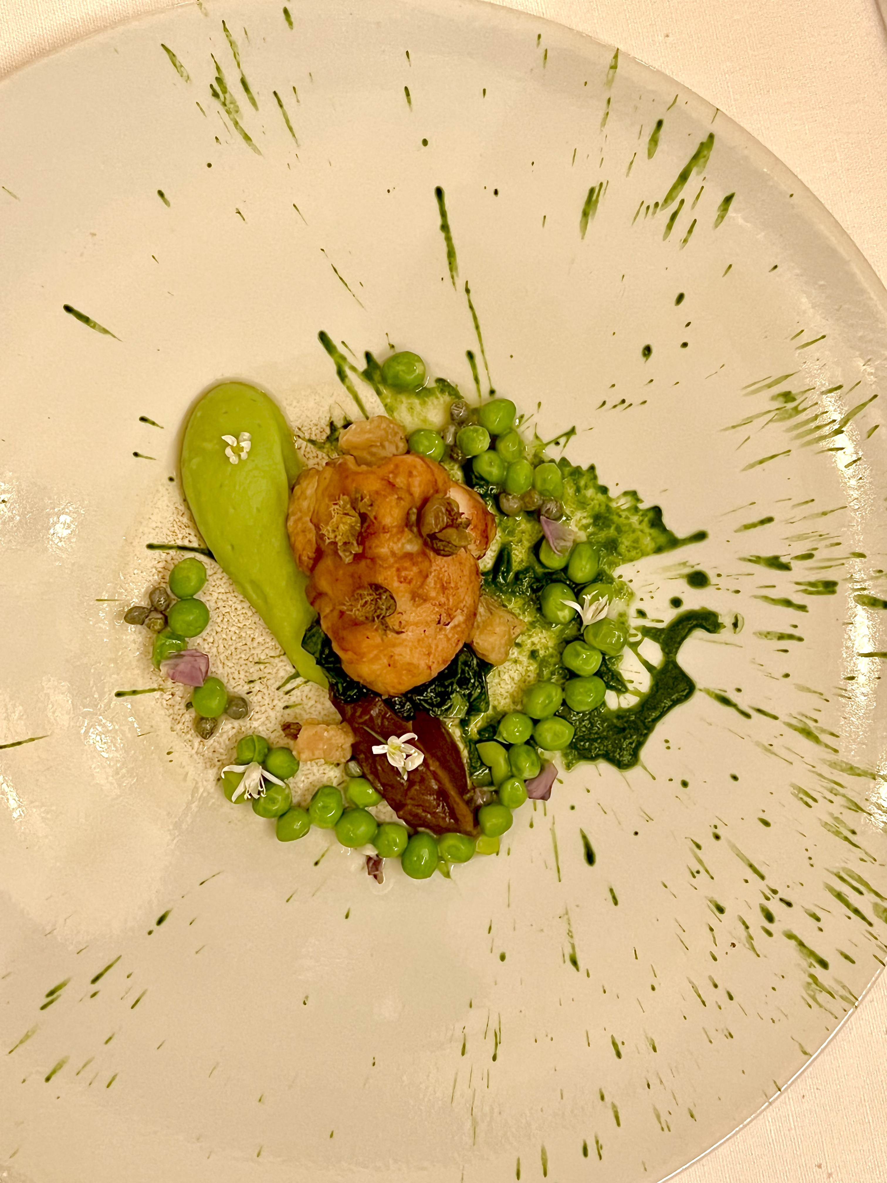 Ris de veau dorés au beurre, ail des ours et petit pois, purée d’oignons, sauce soja, jus aux câpres : nourrit en cuisson au beurre en croustille moutardée, le ris de veau se balance du fizz des câpres, les petits pois en deux façons, en fine mousseline et entiers, juste blanchis, se font douceur végétale et printanière, enveloppante et claquante. La compôtée d’oignons caramélisés est un condiment qui orchestre savamment de sa confiante douceur.