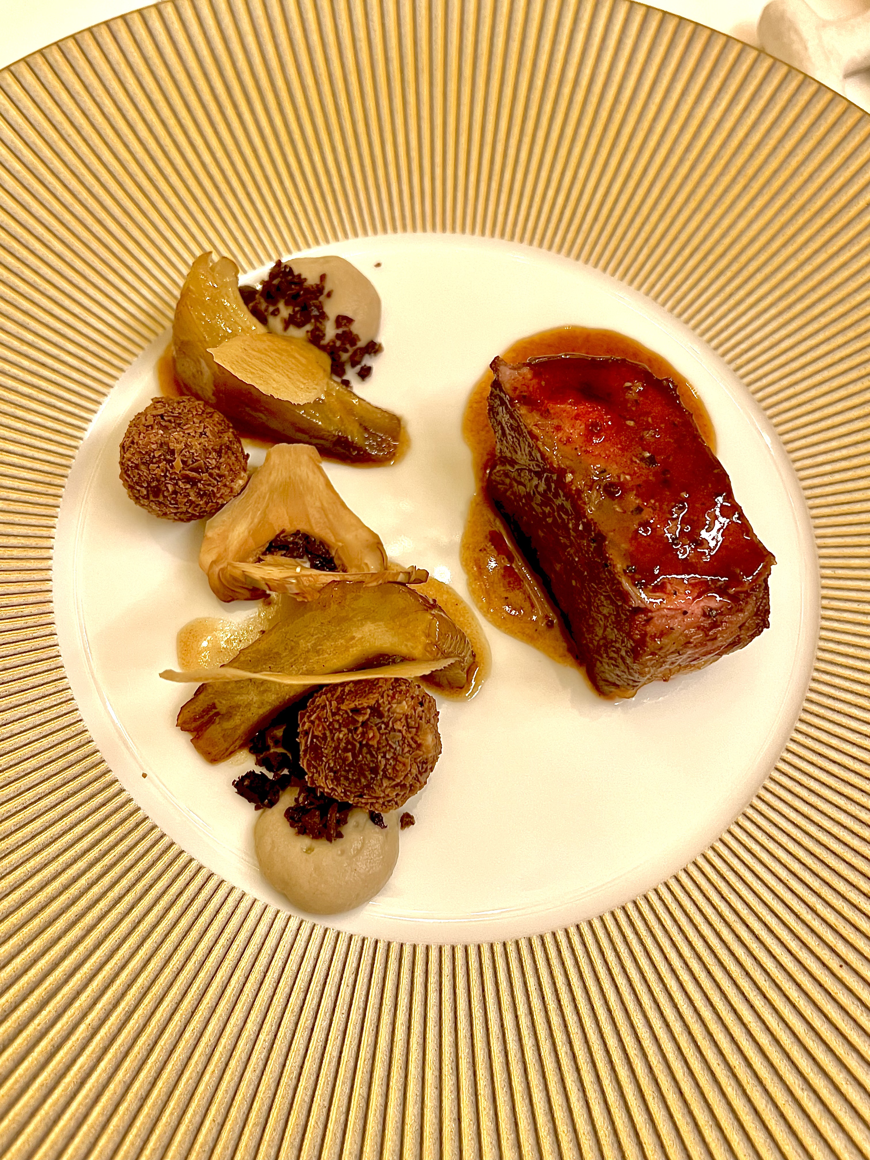 Le Cabillaud nacré, perles du Japon, pomme de terre délicatesse, beurre citron-mélisse se fait fine porcelaine de sa transparence d’une sublime cuisson, il fond en bouche, tel un bonbon qui s’effeuille d’iode. Les pommes de terre sont en suave délicatesse et les perles du Japon claquent en cadence. Le beurre-citron-mélisse, émulsionné, vivifie d’un relief herbacé-acidulé, gourmand et saisissant. Tout semble si évident et tout est à sa place pour la plus grande des valeurs : le plaisir gustatif.