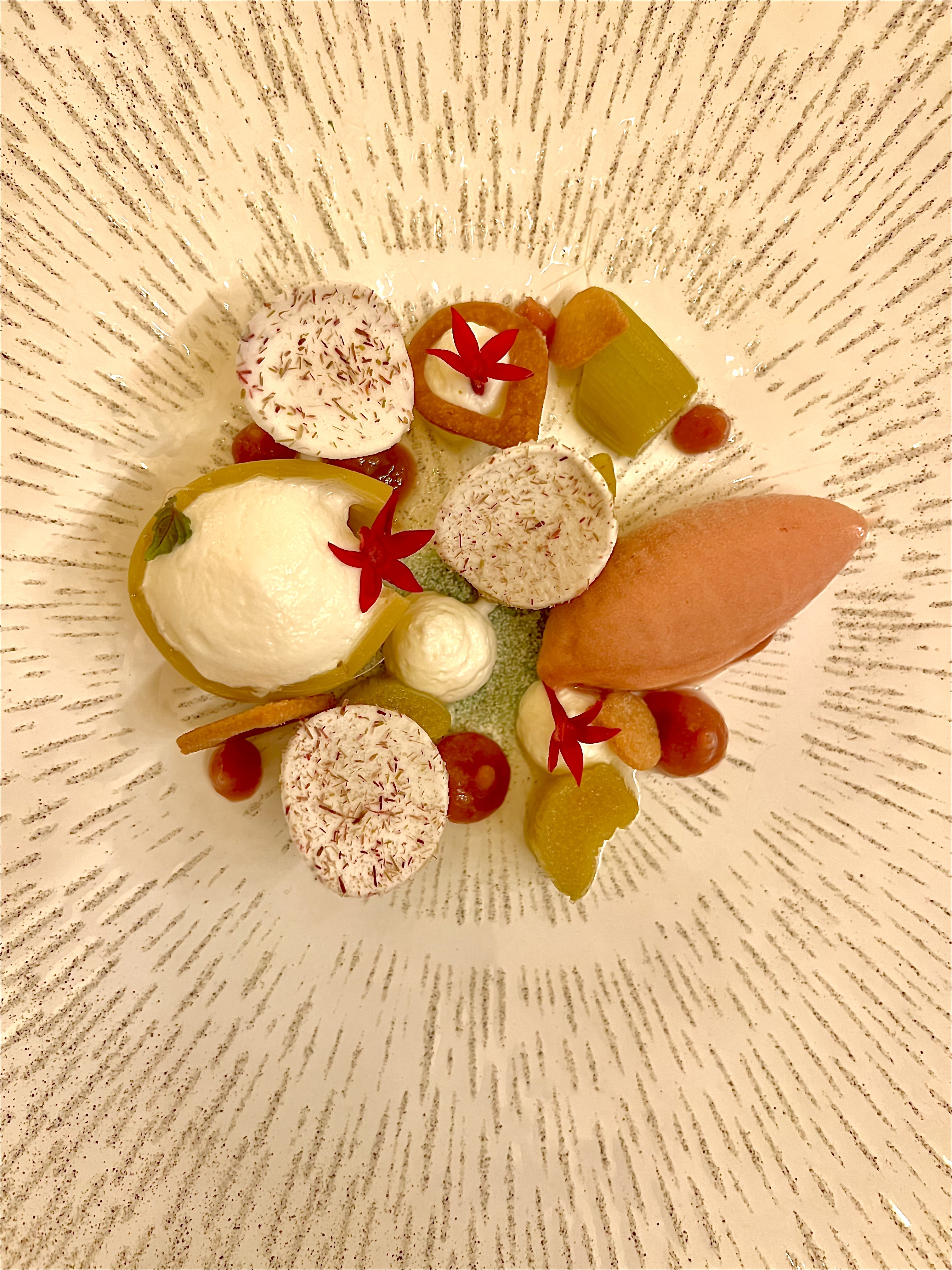 Les desserts signés Charles Bernard et Léa Matteudi ont la résonance de la saison et de l’ultra local comme la Rhubarbe pochée, sablé aux amandes, mousse au yaourt de brebis du hameau de Bessauges : on y retrouve la rhubarbe en différentes façons et cuissons, tout d’abord en sorbet, puis pochée et farcie de la laiteuse mousse au yaourt de brebis des montagnes, en morceau et enfin en croustille de meringue. Une totale symphonie rhubarbe en textures, entre frais, vif et acidulé où tout est en équilibre absolu.