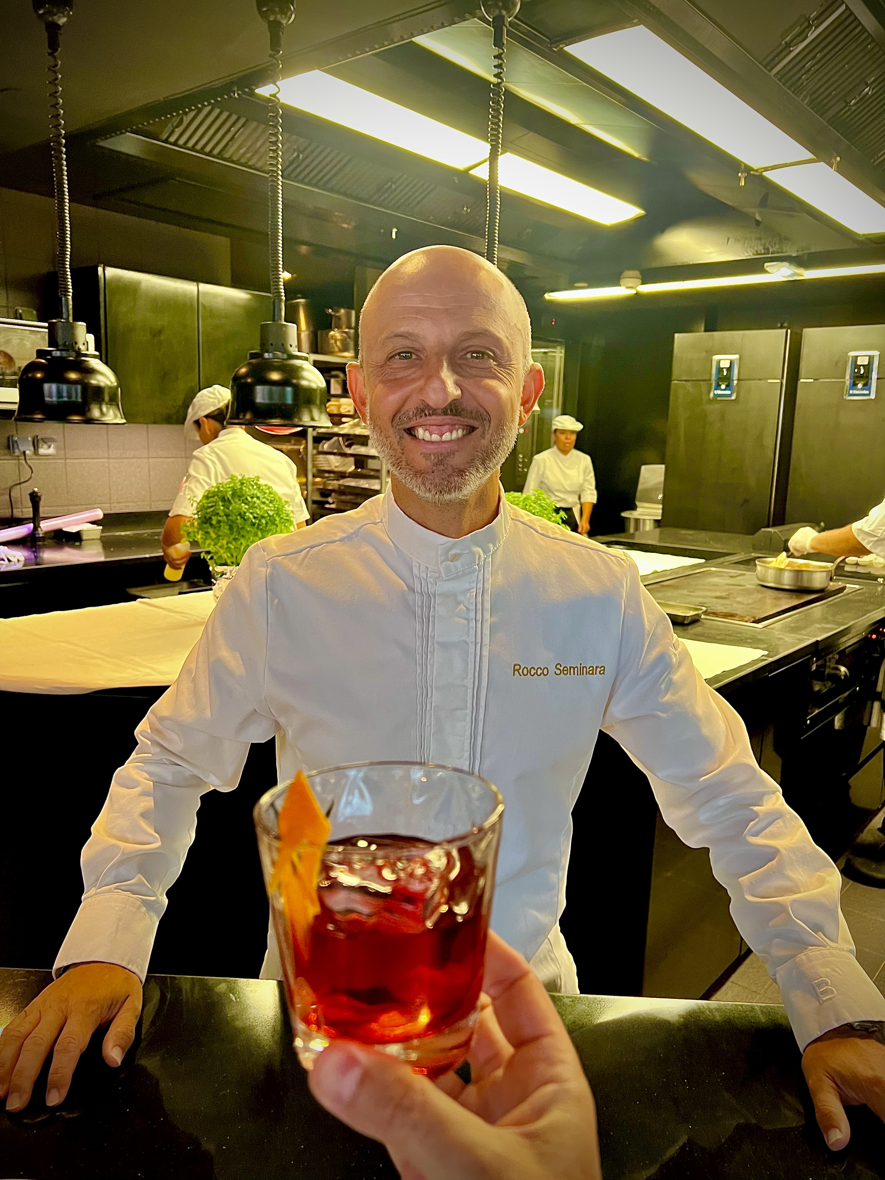 Merveilleusement installé et niché dans cette oasis de verdure, tout commence par une sélection de Negronis plus créatifs les uns que les autres. En effet, Manon et Rocco sont passionnés de cocktails et de mixologie, notamment de Negronis qu’ils déclinent à la carte en 5 versions, plus un sans alcool. Cela va du grand classique parfaitement maîtrisé le Negroni Amalfi, au plus innovant, comme Le Mezcal Negroni ou le Verde Negroni (Gin Malfy citron infusé au basilic, Italicus, bitter bianco), ou encore Le Rosa Negroni (Tanqueray gin, St-Germain, bitter bianco, fraise, poivre de timut)… ces Negronis d’exception, raffinés et inventifs, s’accompagnent en amuse-bouche d’une Tartelette croustillante au Vitello tonnato : montée au siphon, cette suave crème tiède vitello tonnato se réhausse d’une fine poudre d’herbes et de croustillant de pain. En une bouchée, cette tartelette se savoure en équilibre des goûts et de texture.