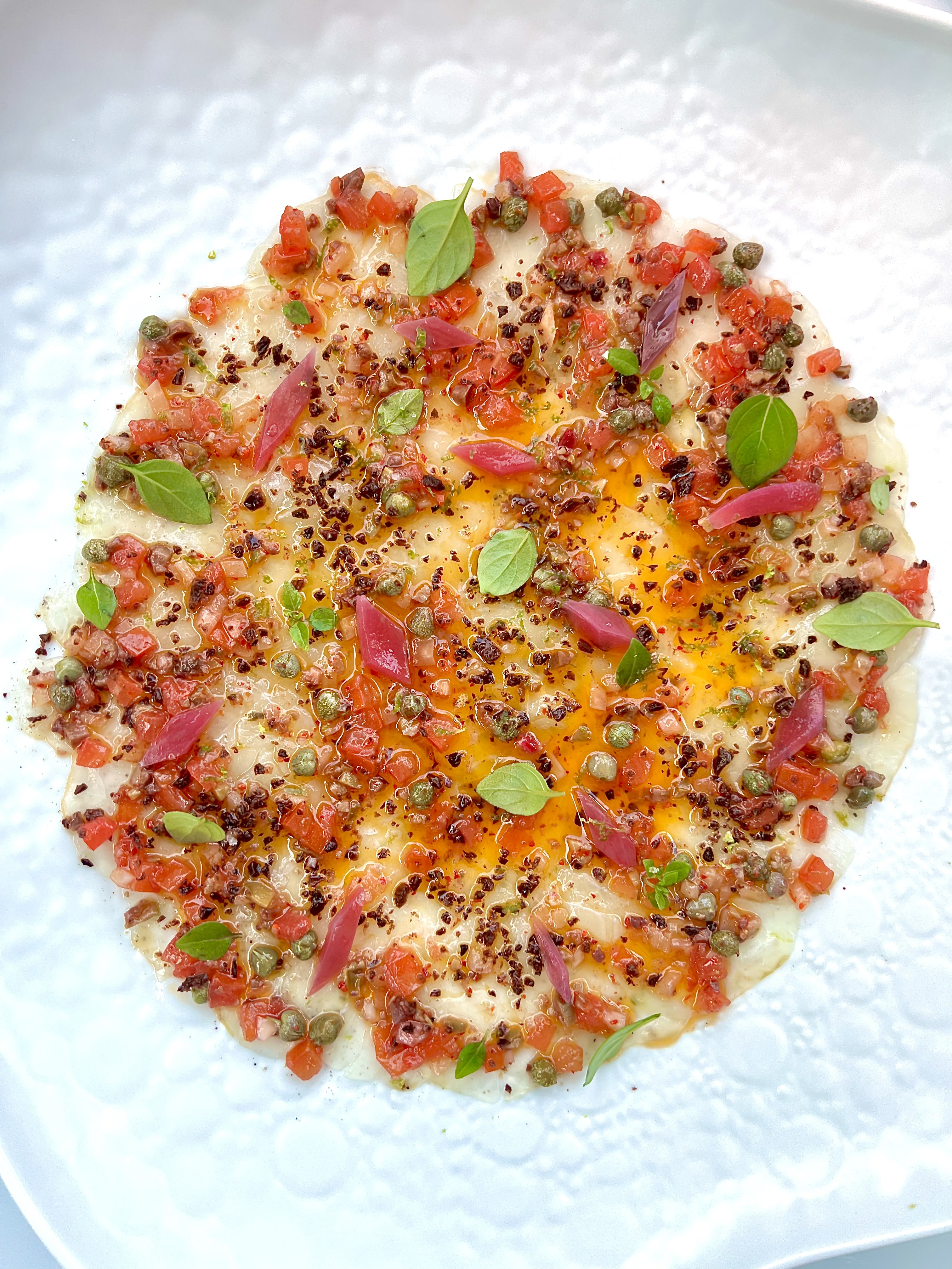 Le Carpaccio de Loup, de sa fine découpe, se marine des tomates en sucrosité bien vu, les olives Taggiasche, les câpres & pickles d’oignon rouge sont des pimpants condiments, la poudre d’olives noires et le basilic balancent entre profondeur et fraîcheur herbacée qui délivre un caractère chimichurri italien.