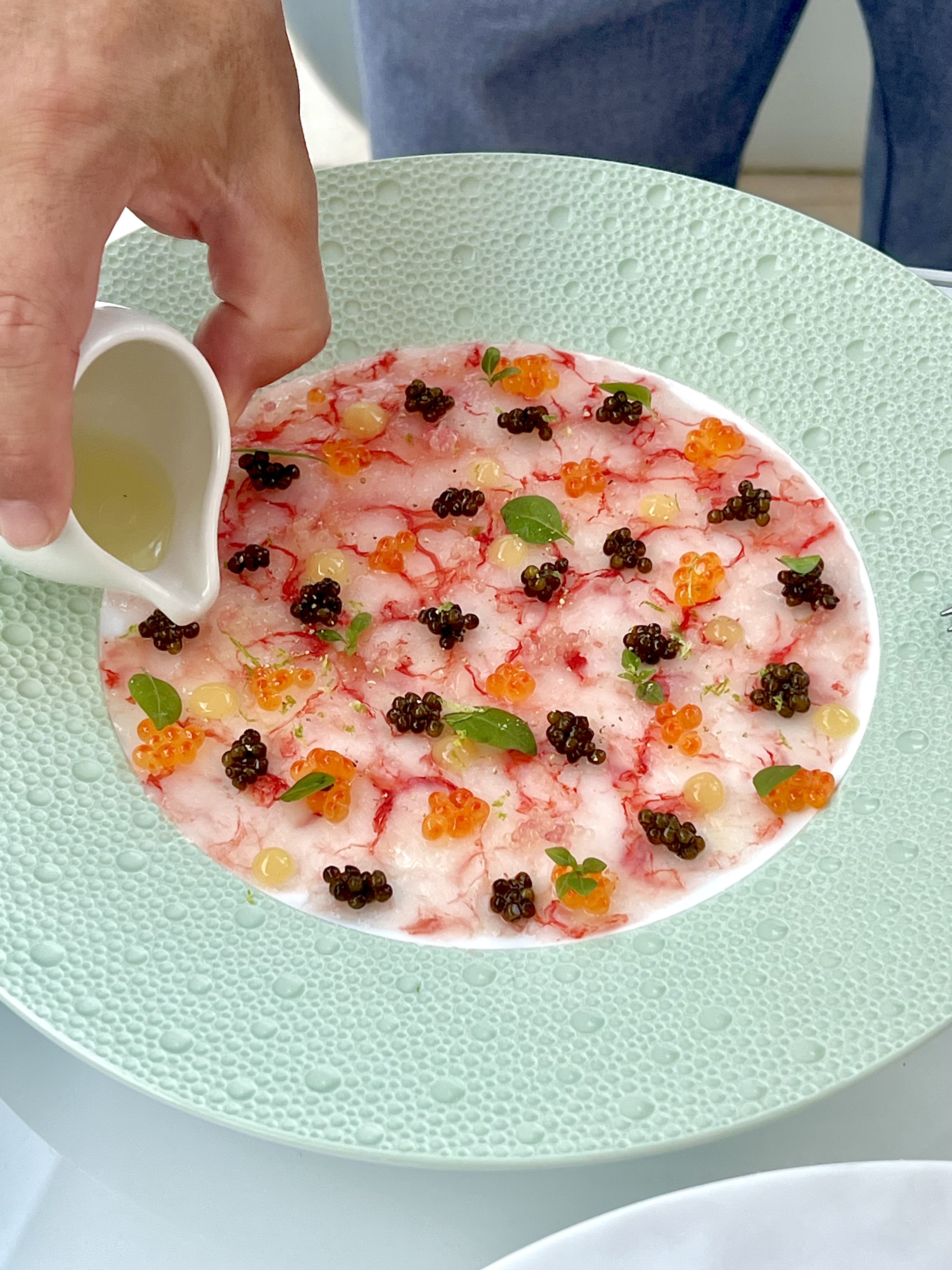 Le Gamberoni rossi, cette unique crevette du Golfe de Gênes à la saveur homard, se parfume aux agrumes dans un triptyque de caviar : citron caviar, œufs de truite et caviar Kristal. Le gel de citron de Menton et la vinaigrette au jus de citron et huile d’olive embrasse avec bienveillance cette délicate, noble et identitaire crevette. Tout est d’une subtilité, ciselée et brillante qui touche infiniment les papilles.