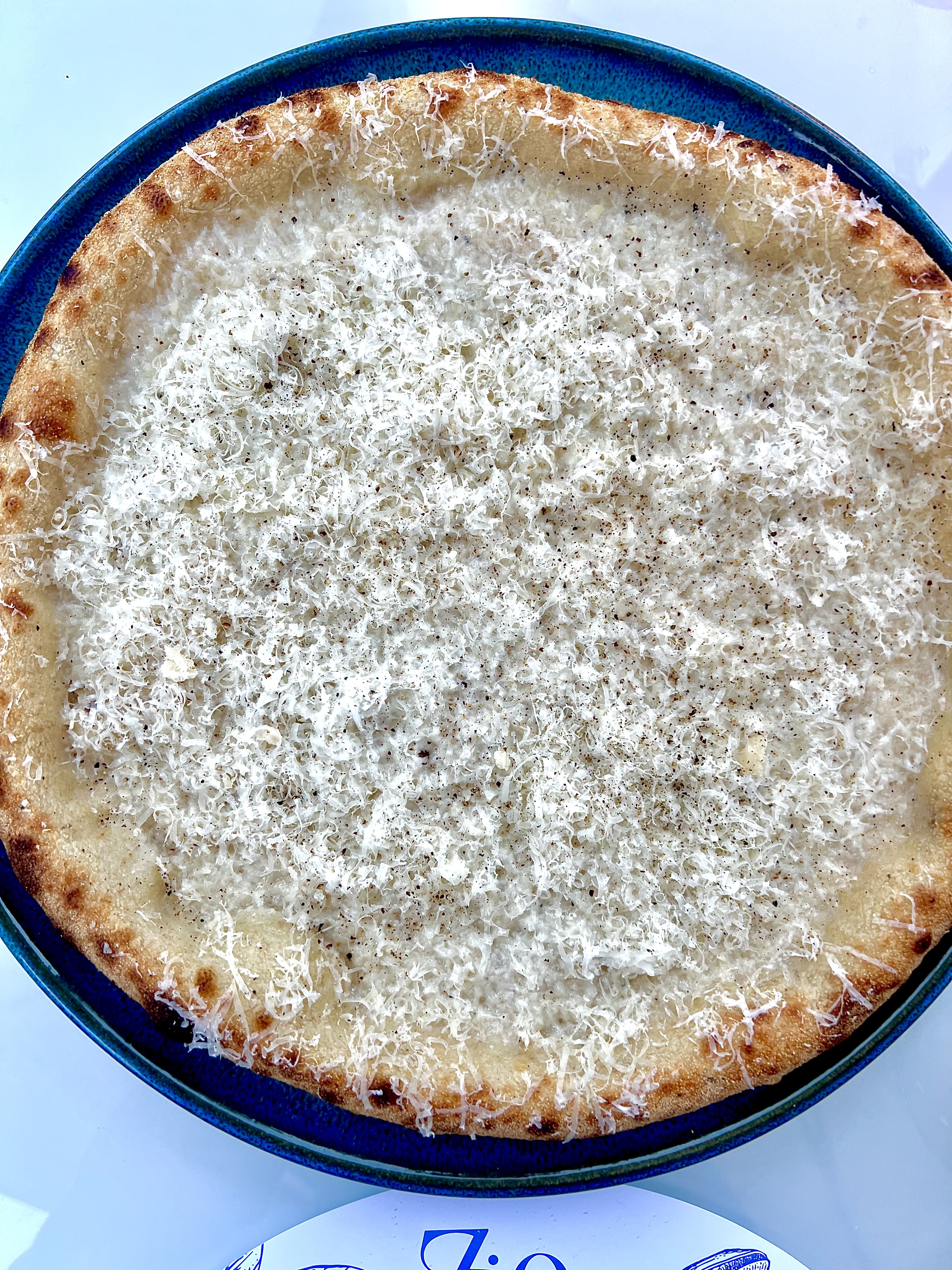 La Cacio e Pepe : simplicité de cette pizza qui vous enivre de ses saveurs si contrastées entre ce poivre bien chauffant arrondi de la douceur réconfortante du Pecorino. C’est tout aussi absolument addictif que l’emblématique plat de pâtes qui est presque une religion.