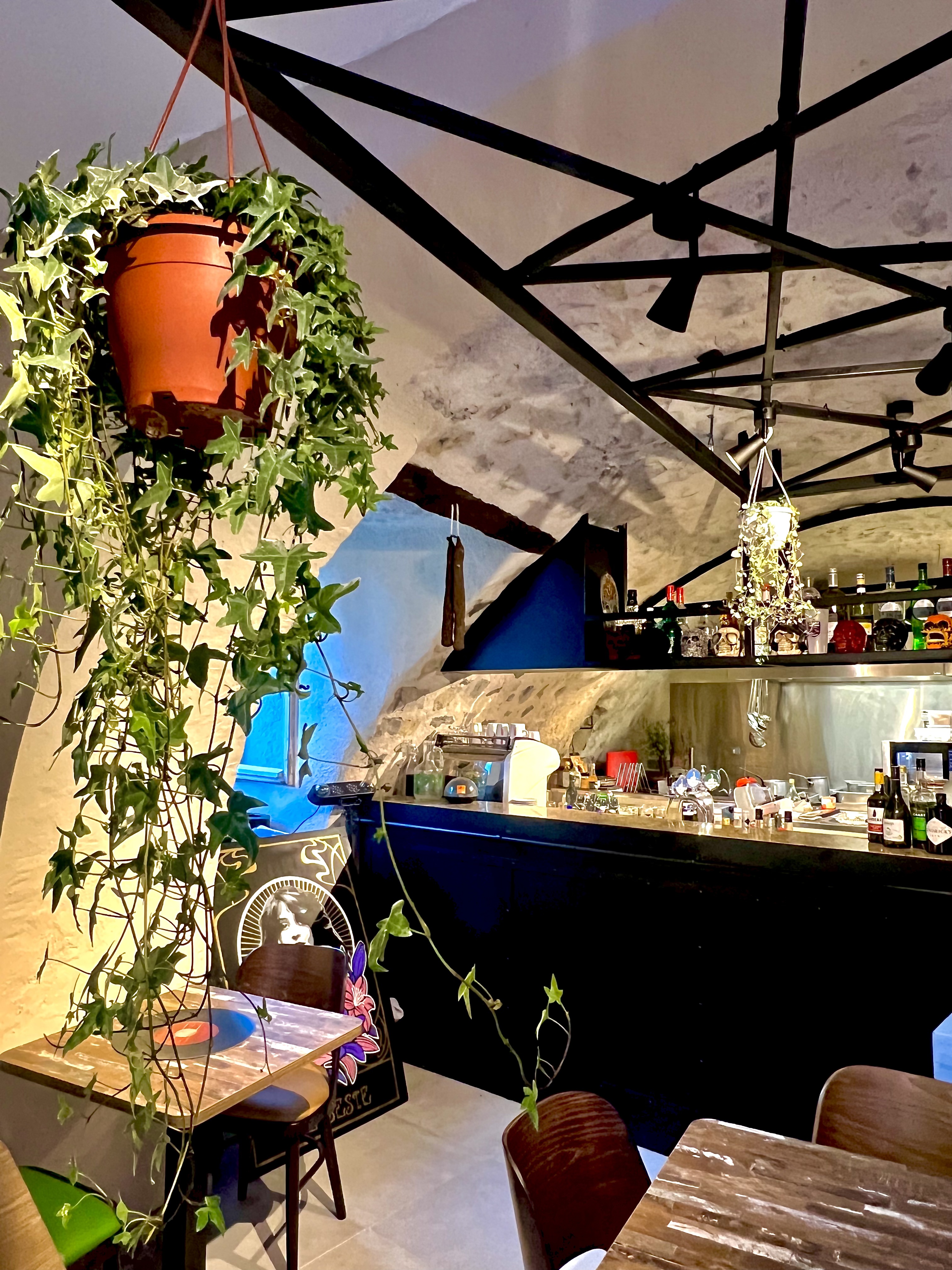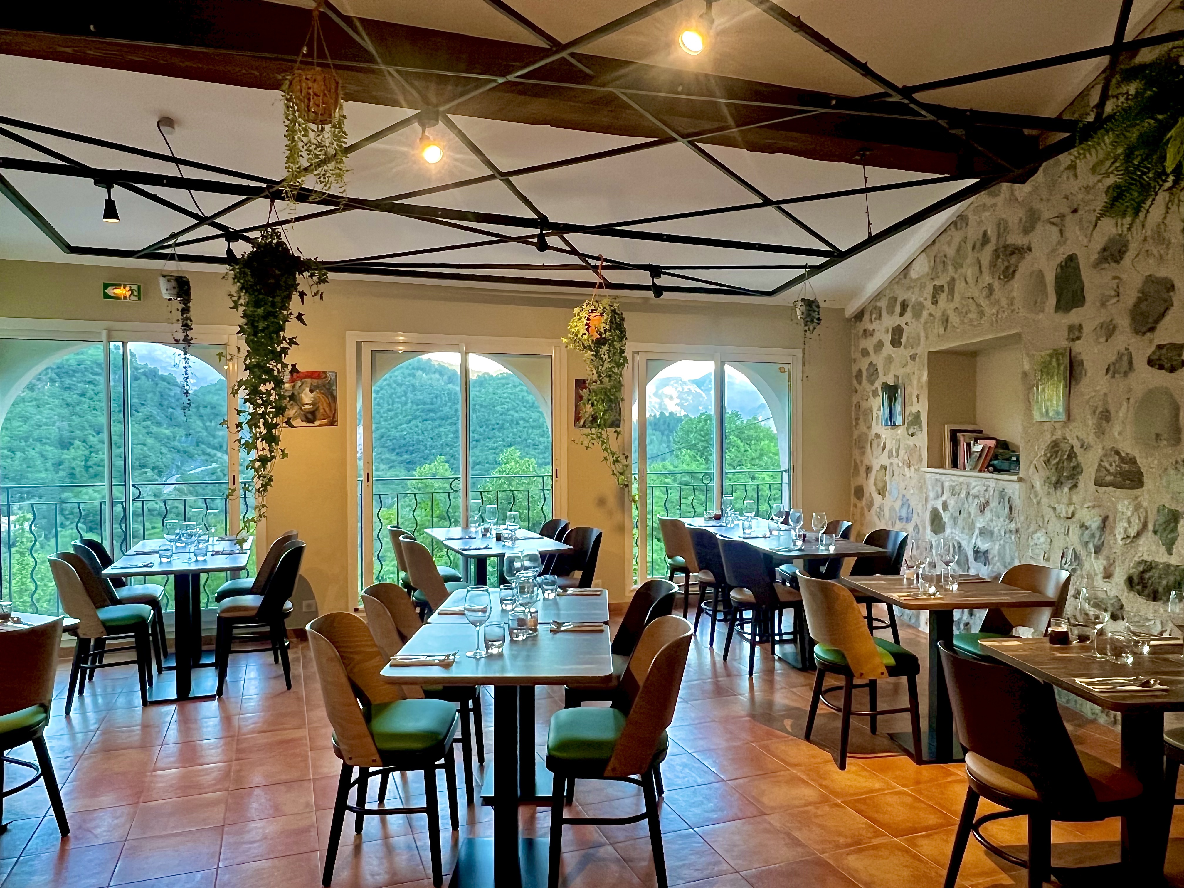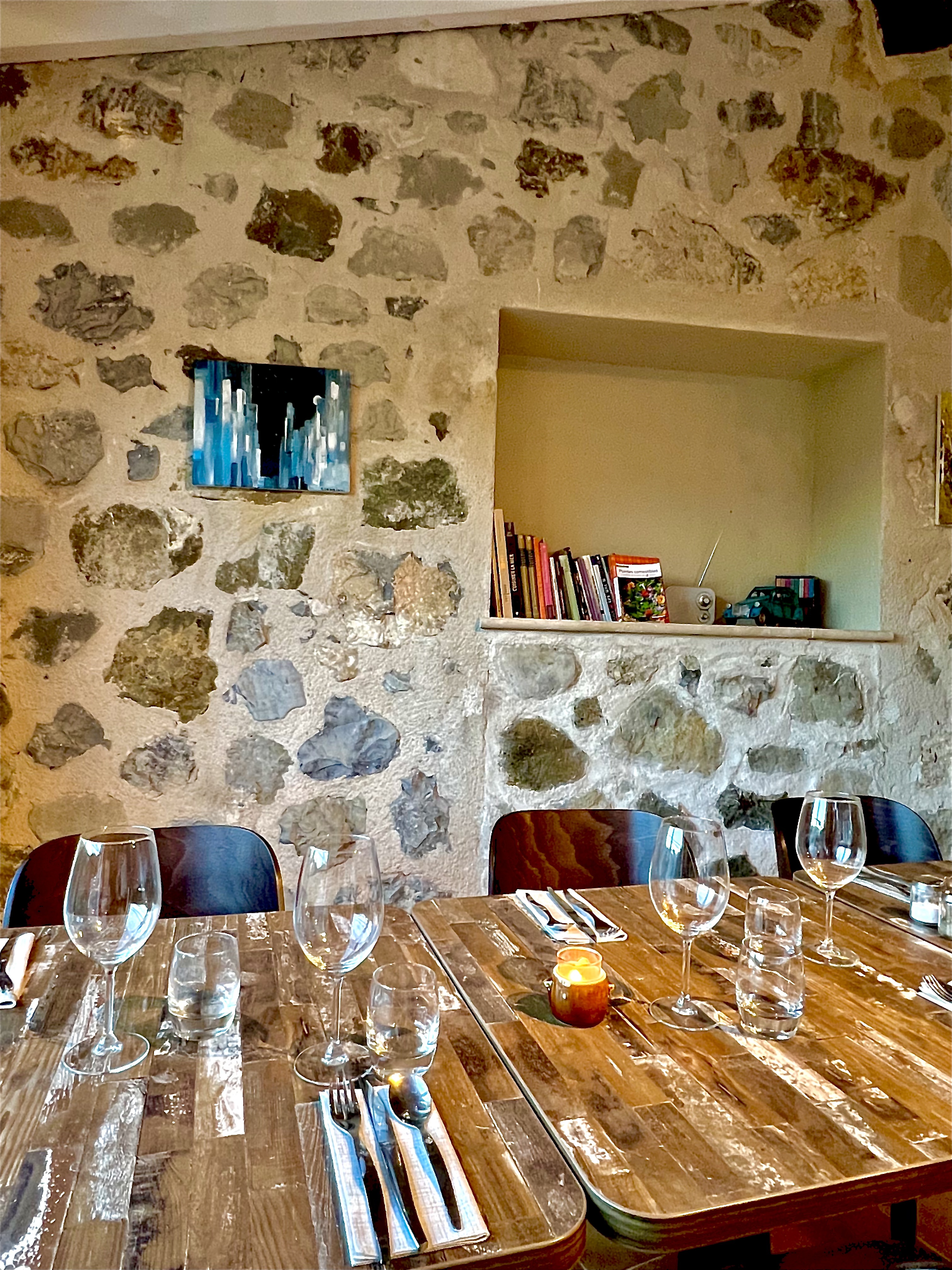 David, Lea et Janis vous accueillent comme un ami, un membre de leur famille. La cuisine ouverte, où l’on ressent toute la passion et l’application, délivre ses fumets enjôleurs, tel le foyer central de la maison qui agite avec ferveur l’appétit. La lumineuse et chaleureuse salle, qui se vit de son superbe panorama sur les montagnes et la nature environnante, a cette identité à la fois moderne et rustique d’une décoration industrielle, entre le métal et la pierre, et le pop-art, entre tags et tableaux colorés.