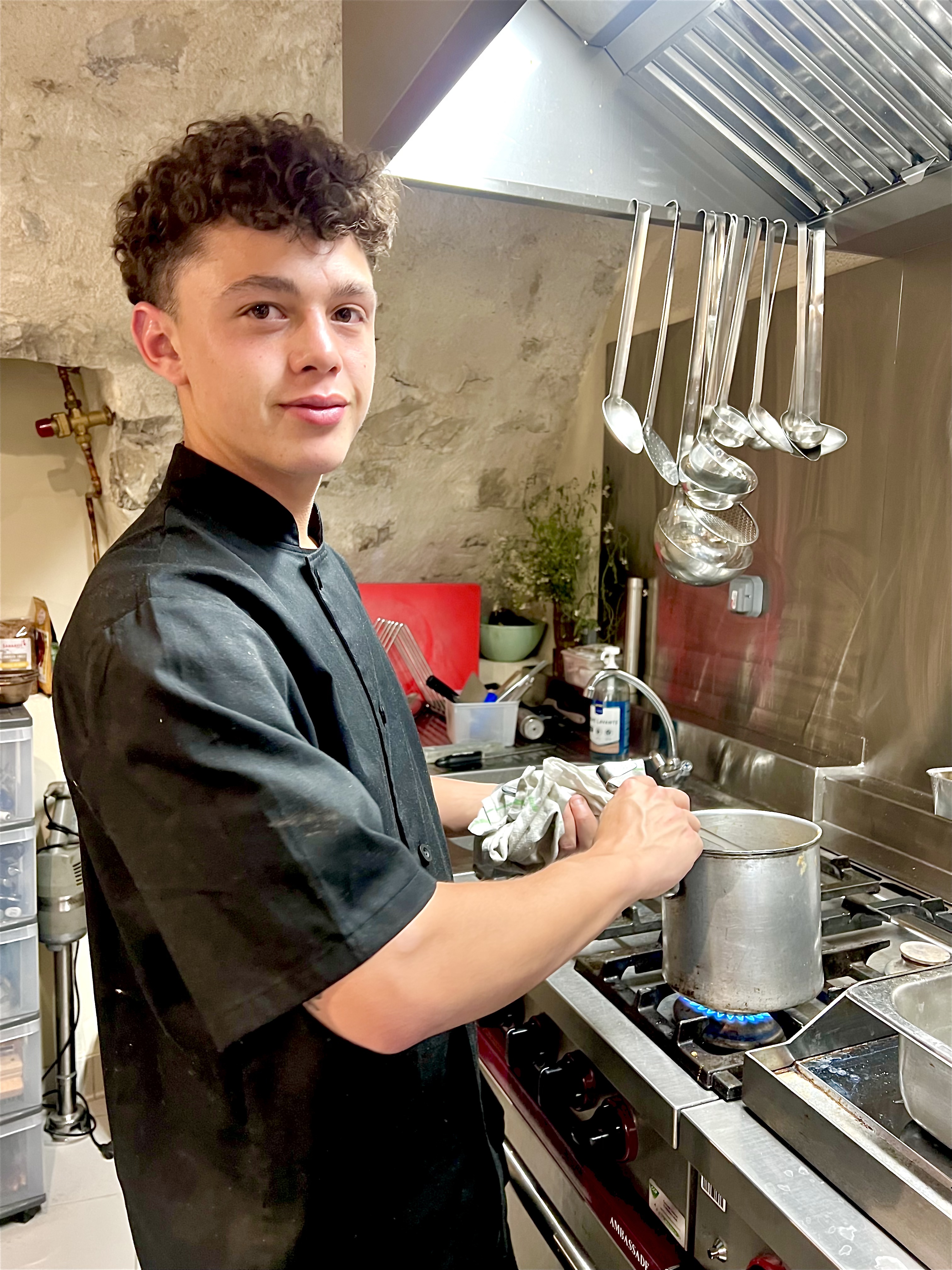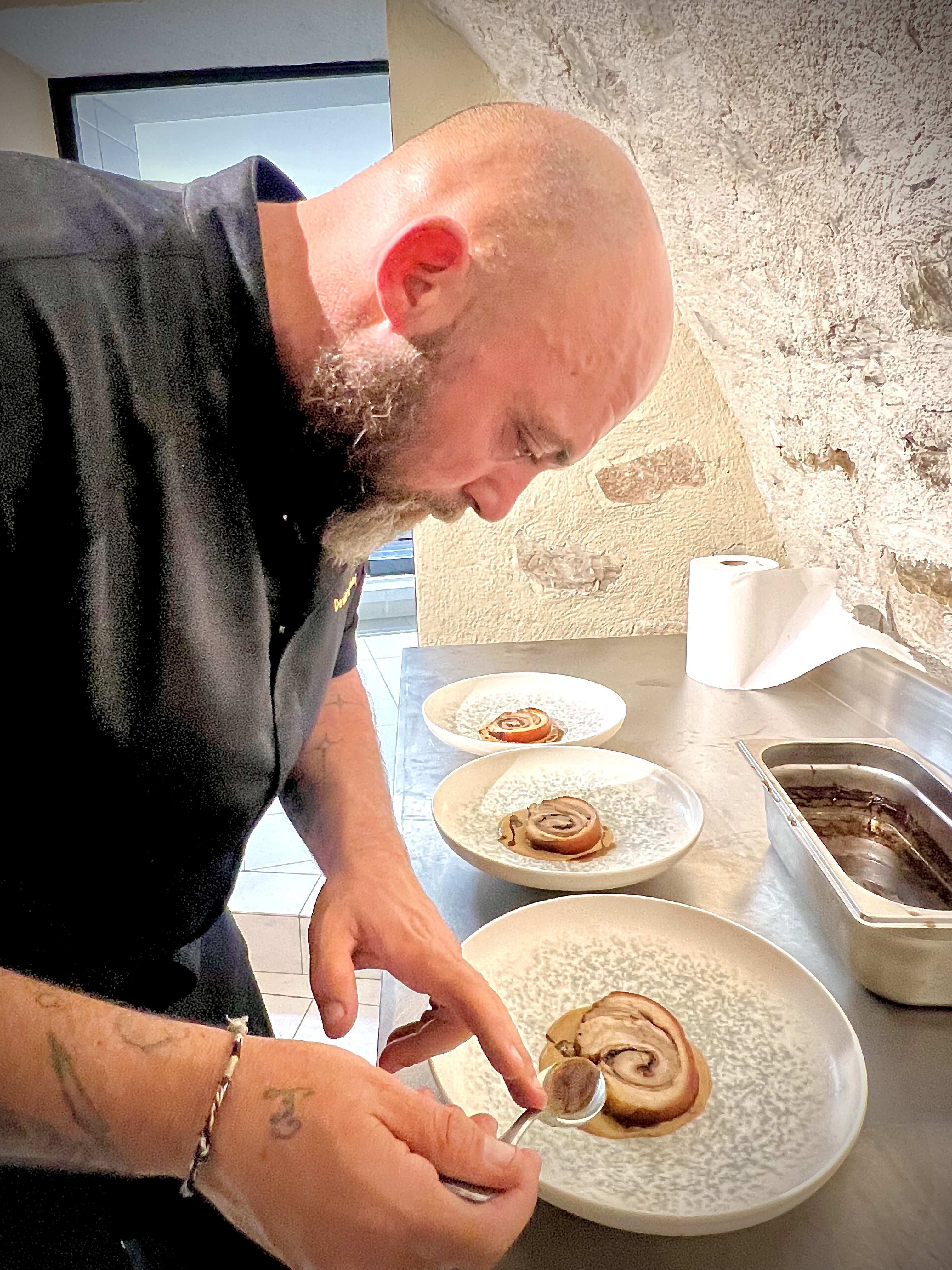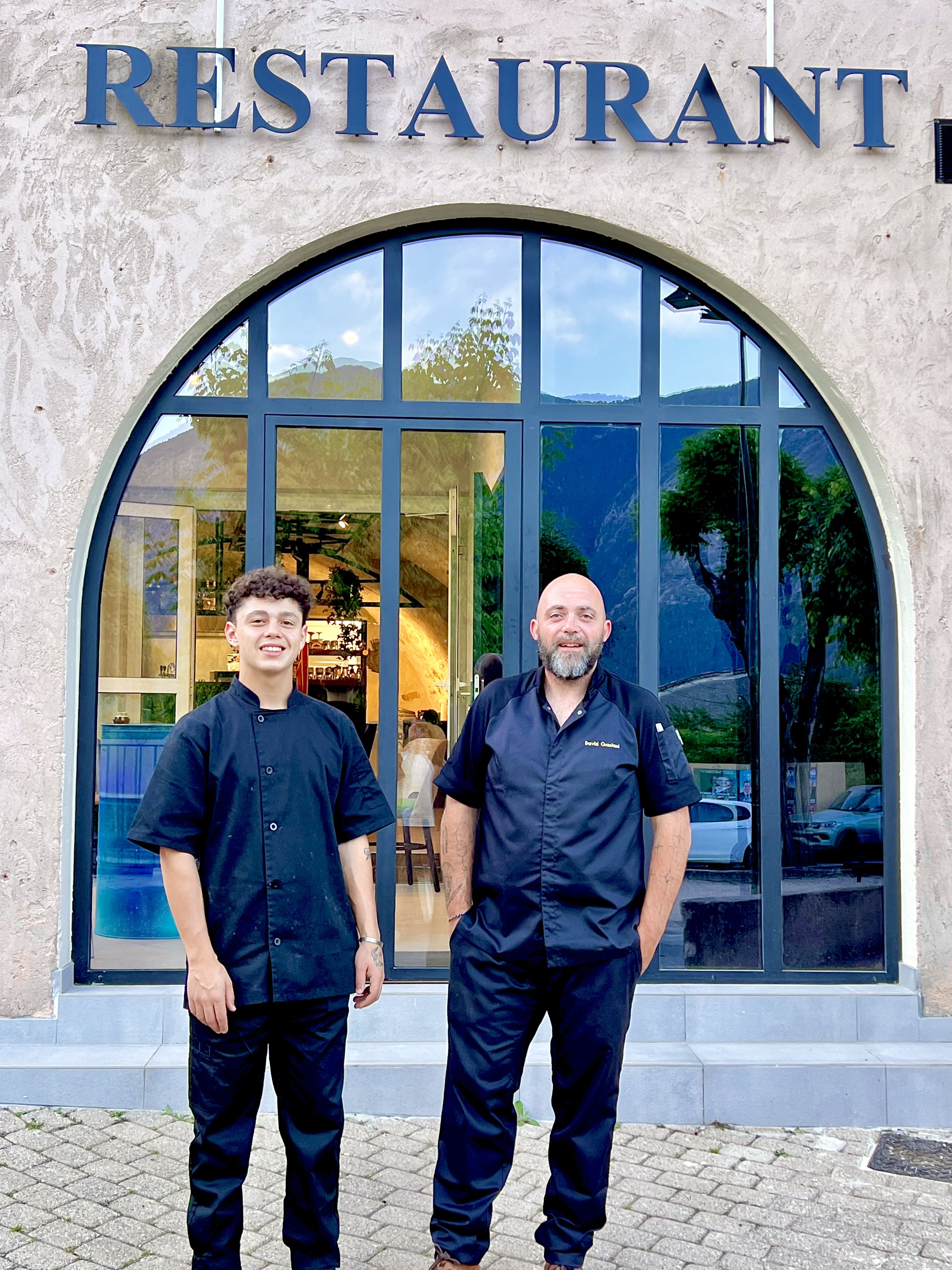 On l’a connu dans son village à Gattières, où tout a commencé d’une cuisine canaille qui a passé le cap d’une cuisine audacieuse, inventive et gastronomique avec des touches de folie que seuls les autodidactes sont capables de fournir, car non enfermés dans des carcans et des lignes classiques. Après l’avoir vu dans différentes adresses de la Côte et après des déboires de patrons aux vertus peu vertueuses qui ont failli l’atteindre et lui faire ranger ses couteaux, après quelques temps pour se recentrer et redevenir le David d’avant et aborder de nouveaux horizons qui sont les siens, on le retrouve depuis peu dans le charmant village médiéval de Massoins, situé dans la vallée du Cians à 46 kilomètres de Nice. David, l’homme, aime le grand air de la campagne et de la montagne, et la dynamique mairie du village avait besoin d’un chef pour son Auberge communale, flambant neuve. Et voilà David qui débarque, tel un « Messie » culinaire, pour réveiller avec talent tous les appétits des villageois et villages environnants. Cette vallée, qui paraît si loin, ne l’est pas autant et n’est certainement pas perdue : entre activités dynamiques de la commune et des autres villages aux alentours, entre résidences secondaires de niçois ou de monégasques en quête de nature, le village de Massoins vit de sa belle vie qui devient gourmande et enjouée depuis l’arrivée de David Graziani.