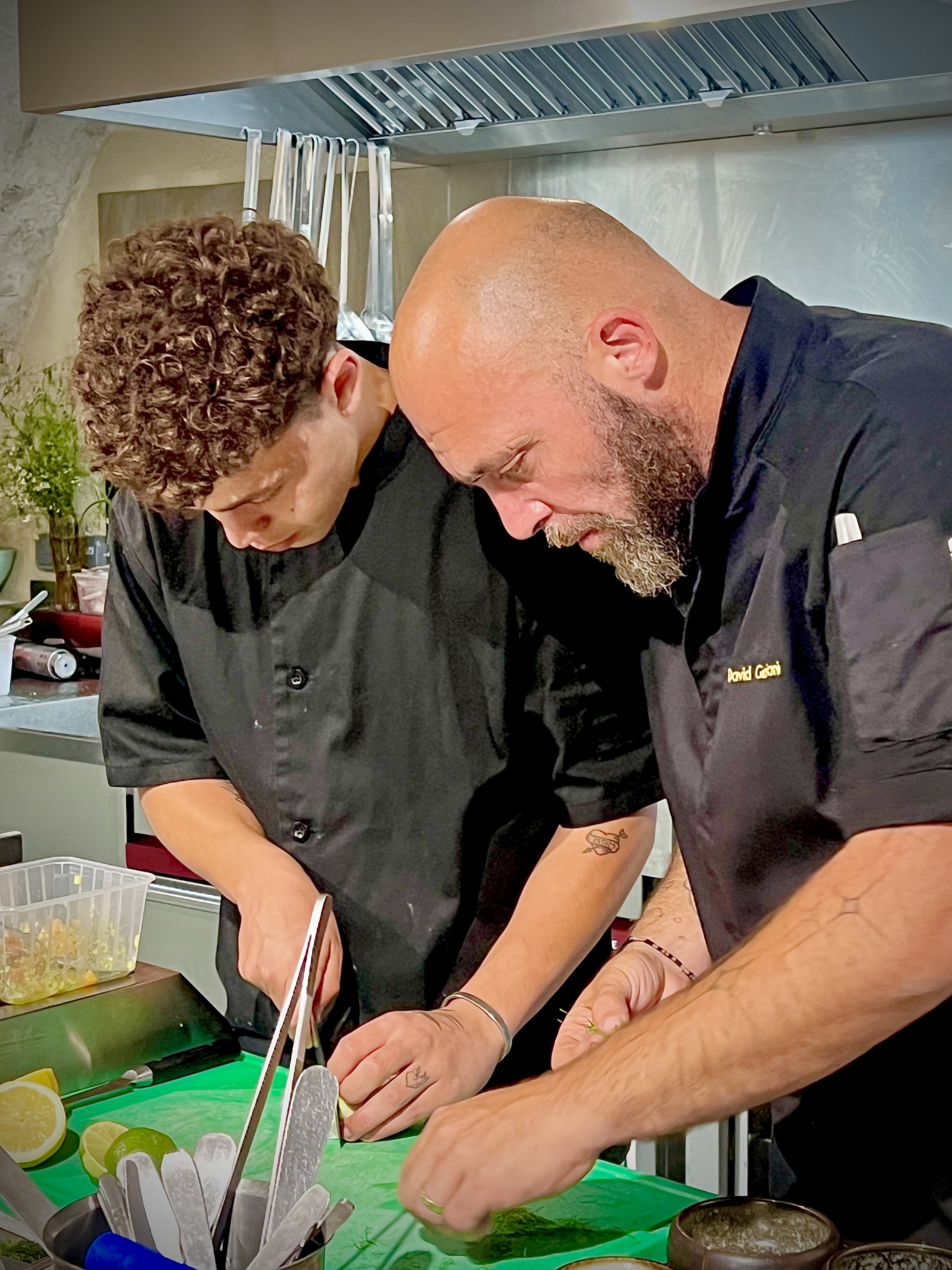 A La Buona Mangiuca, épaulé du très prometteur et jeune Janis, il orchestre une cuisine mature, à la fois justement créative et gourmande, qui célèbre le terroir et les très beaux produits de cette vallée, si riche, entre la Truite du Cians, si proche, les légumes et les œufs de la célèbre Agnes Papone à Puget Thenier (qui fournit chefs et belles tables étoilées de la région, comme Le Negresco), le cochon d’un petit éleveur d’Annot et les fromages de l’Esteron à Plan du Var…. Chez David et Lea (son épouse qui dynamise et illumine la salle de son amour), on se régale sans complexe, on se lèche les babines avec enthousiasme, respect et attention. Le chef vous raconte avec passion sa cuisine d’instinct, chaque plat est une création unique du jour ou de la nuit car son esprit frétille d’inventivité en continu pour notre plus grand plaisir.