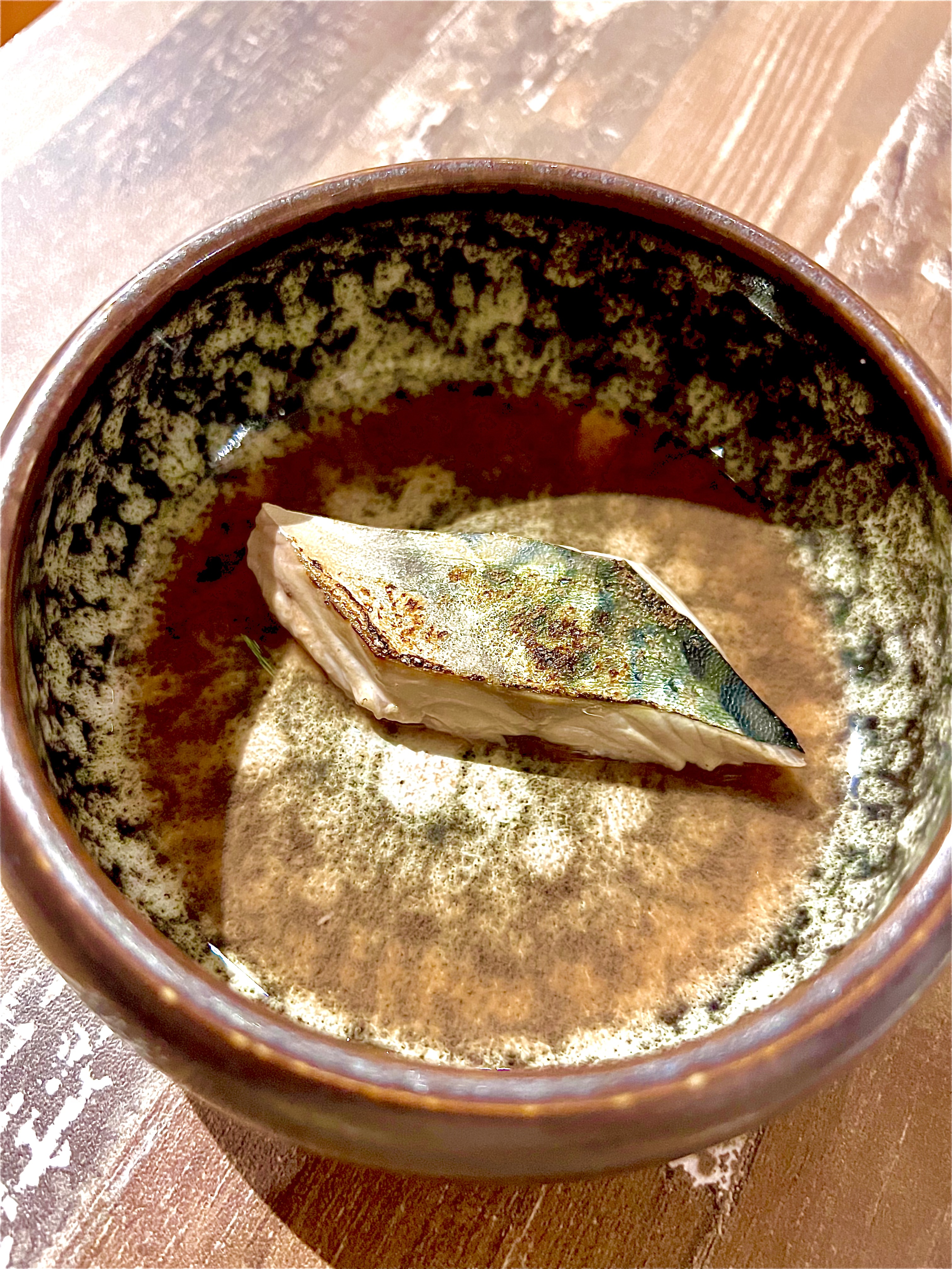 Maquereau au chalumeau, vinaigre de mon mariage 18 ans : identitaire, le maquereau est d’abord fumé aux herbes du jardin, puis cuit-grillé à la flamme, il se ravive de la douce et accompagnante acidité de ce vinaigre vintage et familial qui s’exprime en filigrane.