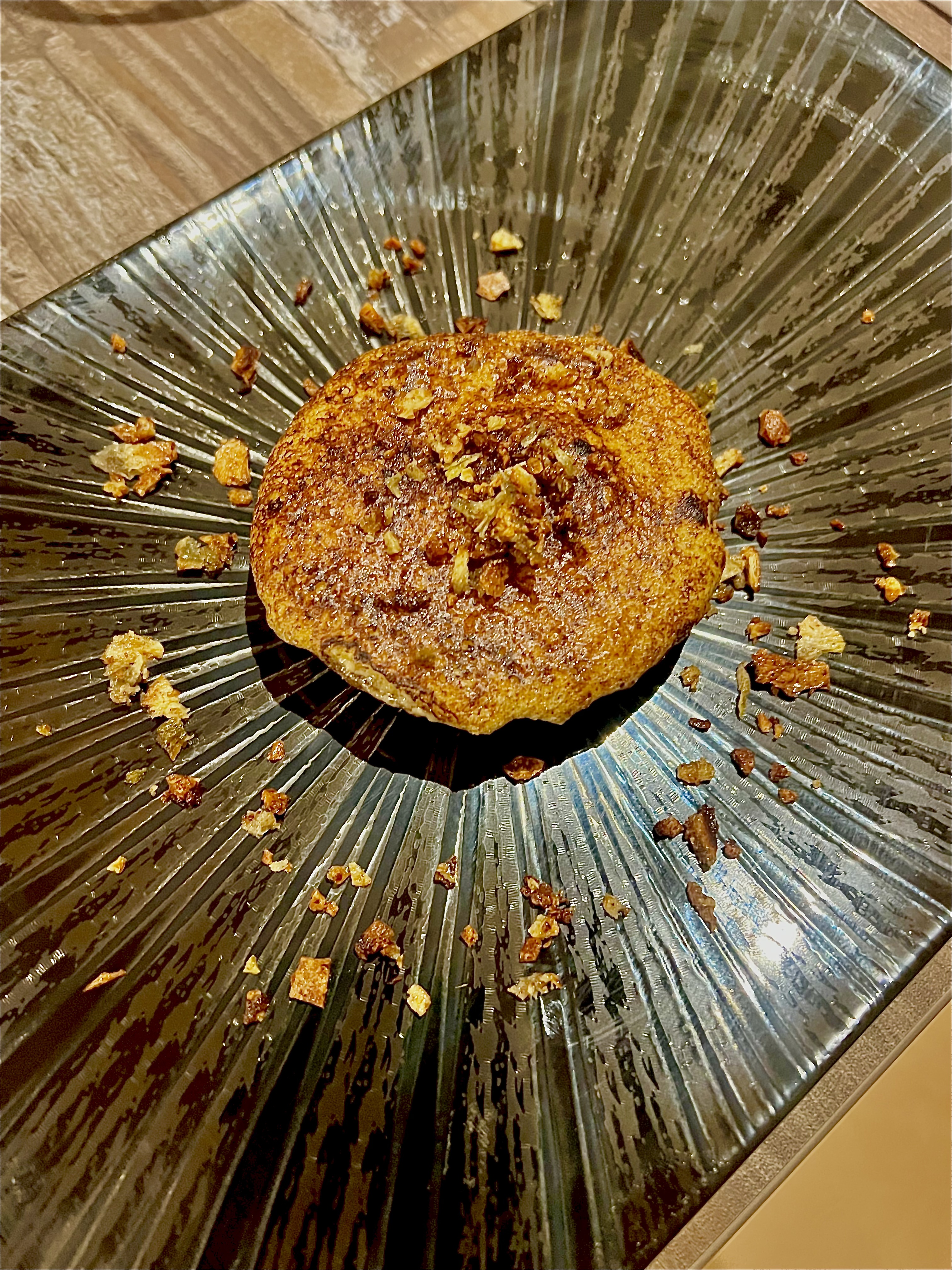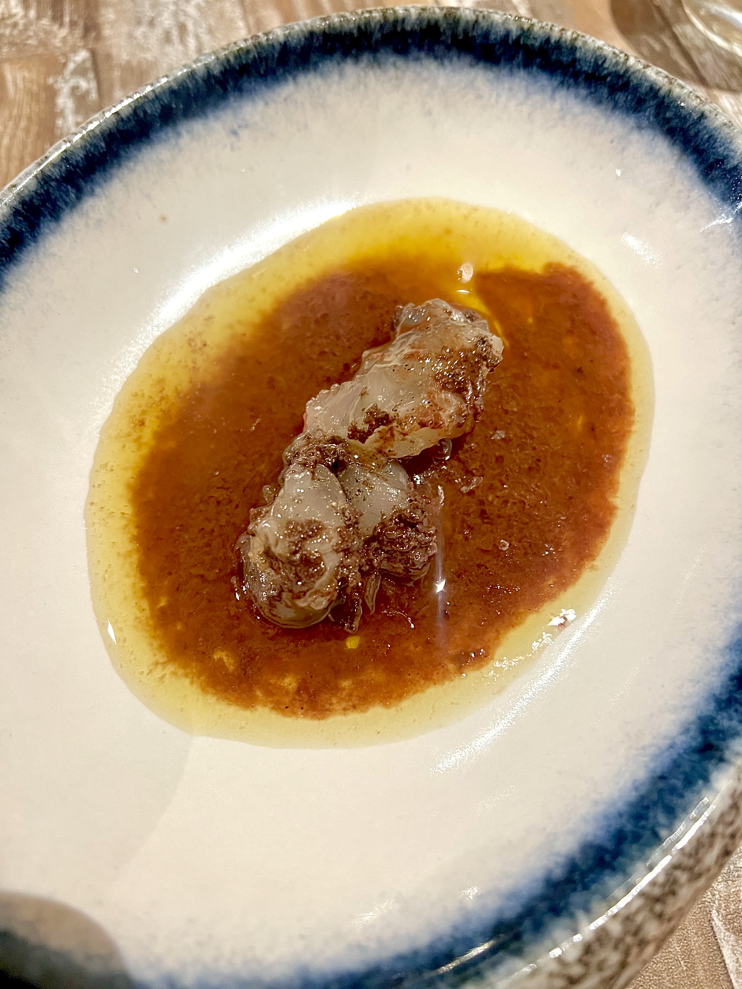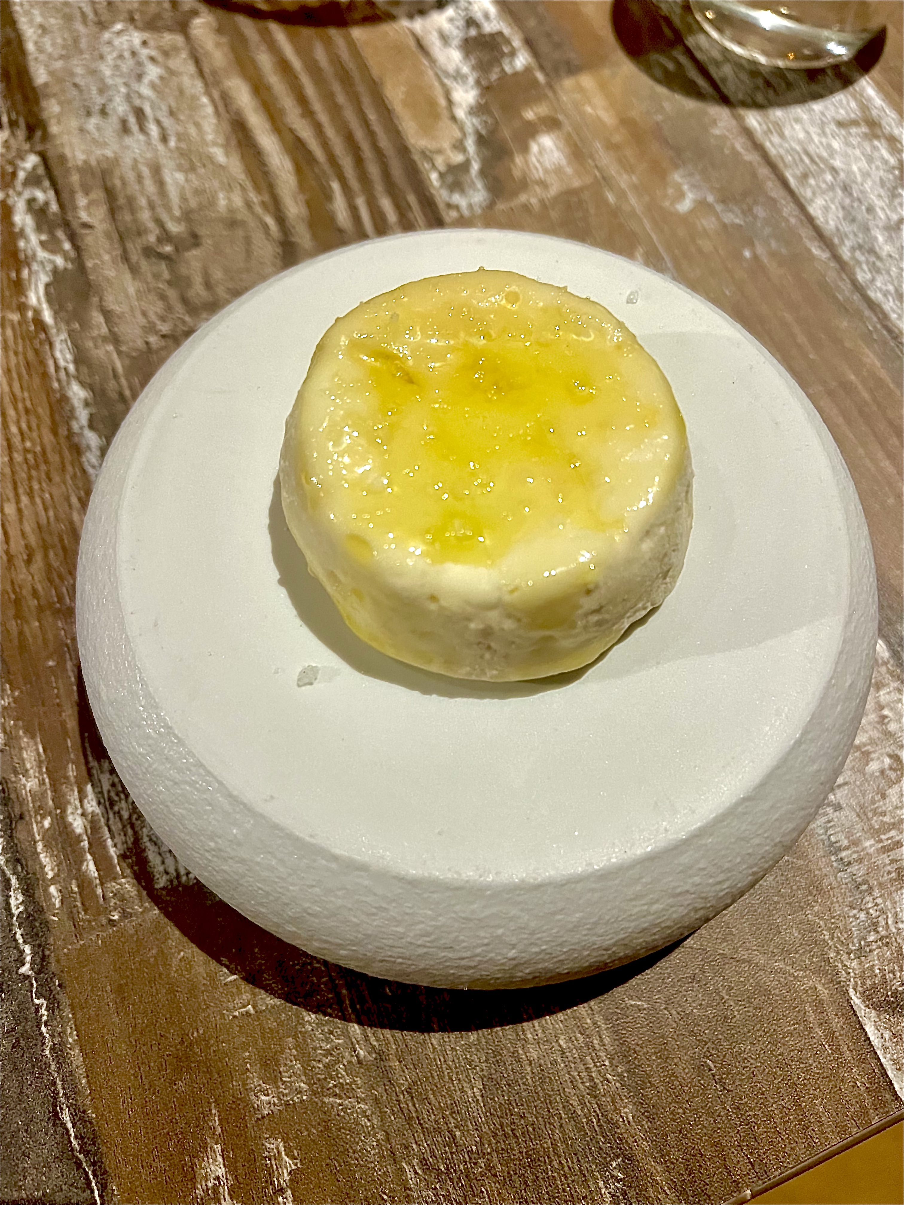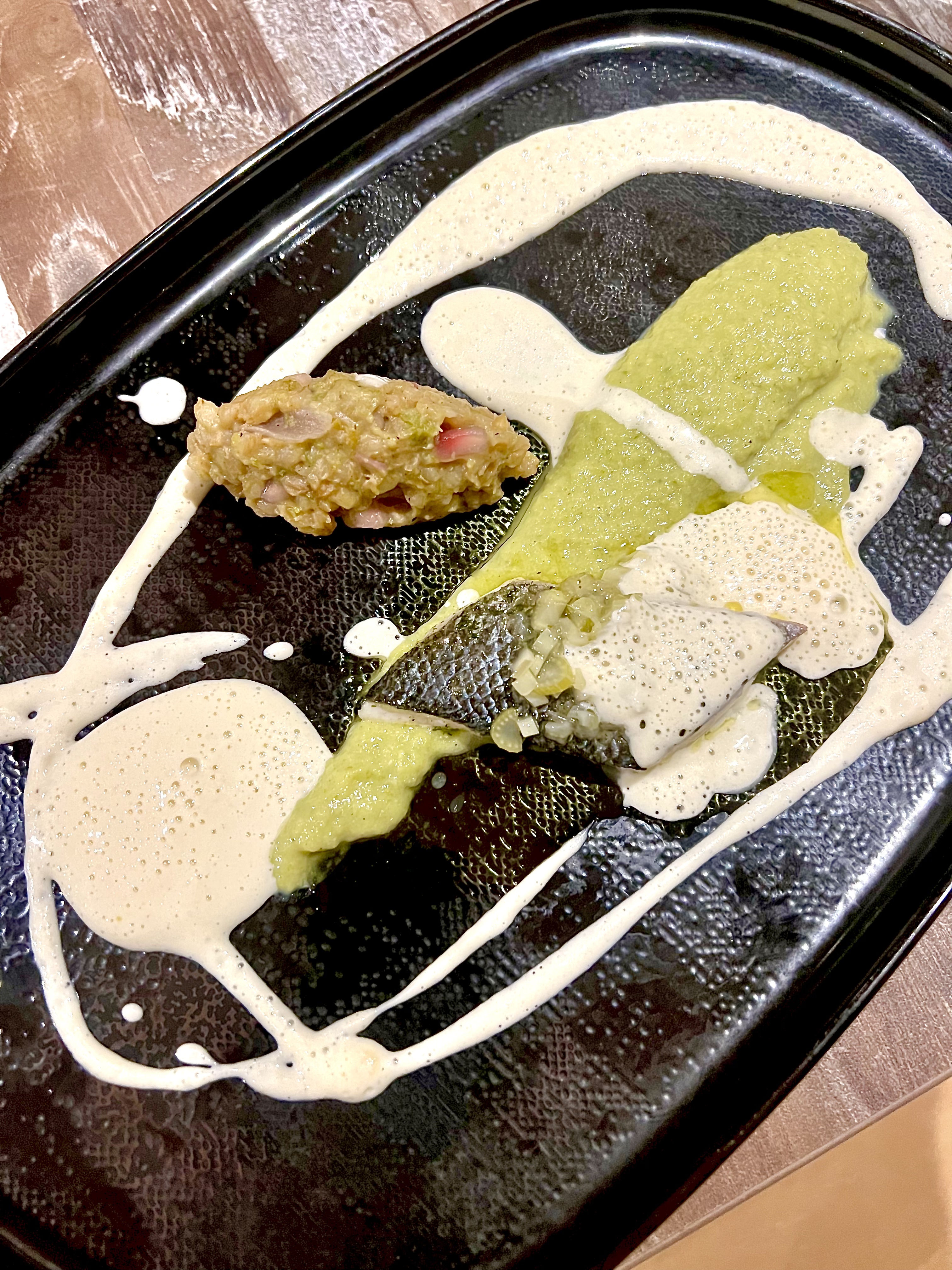 Artichaut, comme une tartelette, Crémeux de lard, jaune d’oeuf cru de chez Agnès, Sabayon au parmesan : visuel qui attise l’appétit et donne instantanément envie de plonger la cuillère pour découvrir ce qu’il se cache sous ce sabayon de parmesan en soufflé. Sublime surprise de cet oeuf cru tiédi qui coule de bonheur de son intense jaune au gras suave et parfait. Le coeur de l’artichaut se joue base de pâte croquante et vibre de délice complice du crémeux de lard fumé, quant à la chips d’artichaut, elle « crisp » en cadence. Tout fonctionne et s’aligne judicieusement en bouche.