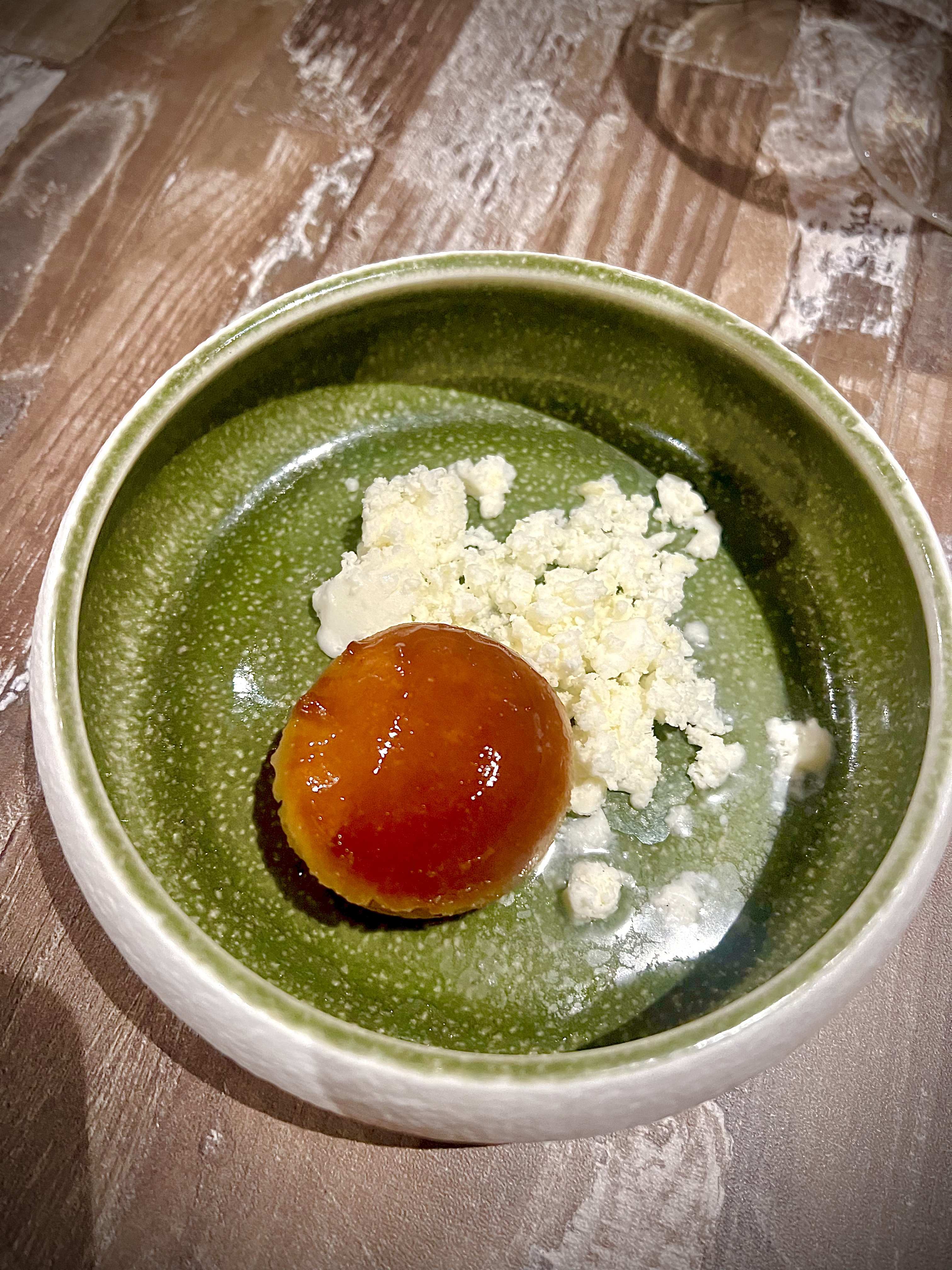 Pour les desserts, Janis est de la partie avec ce Granité citron vert, baba génépi. Le baba est baba de la verveine du jardin, s’enivre en équilibre du montagnard Génépi et le granité aux agrumes se déstructure en force : c’est frais, vif et nettoyant.