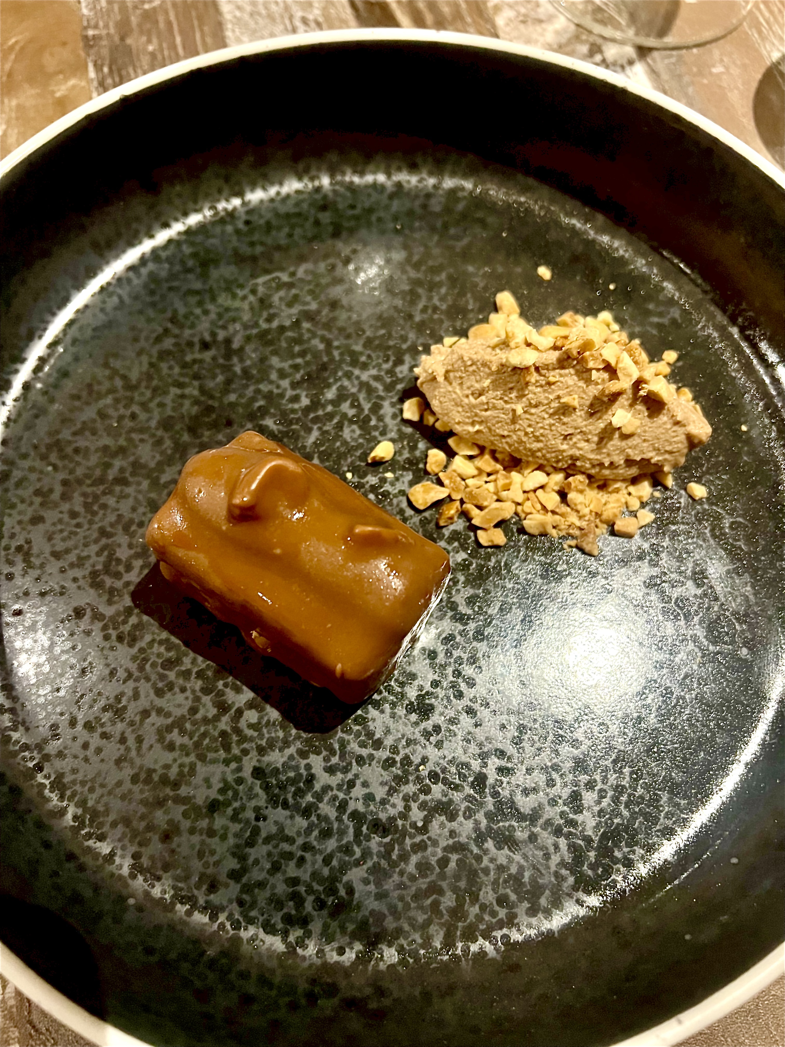 Snickers maison revisité : la glace ganache est montée au chocolat en caramel de dulce et les cacahuètes torréfiées sont la note agréablement régressive.