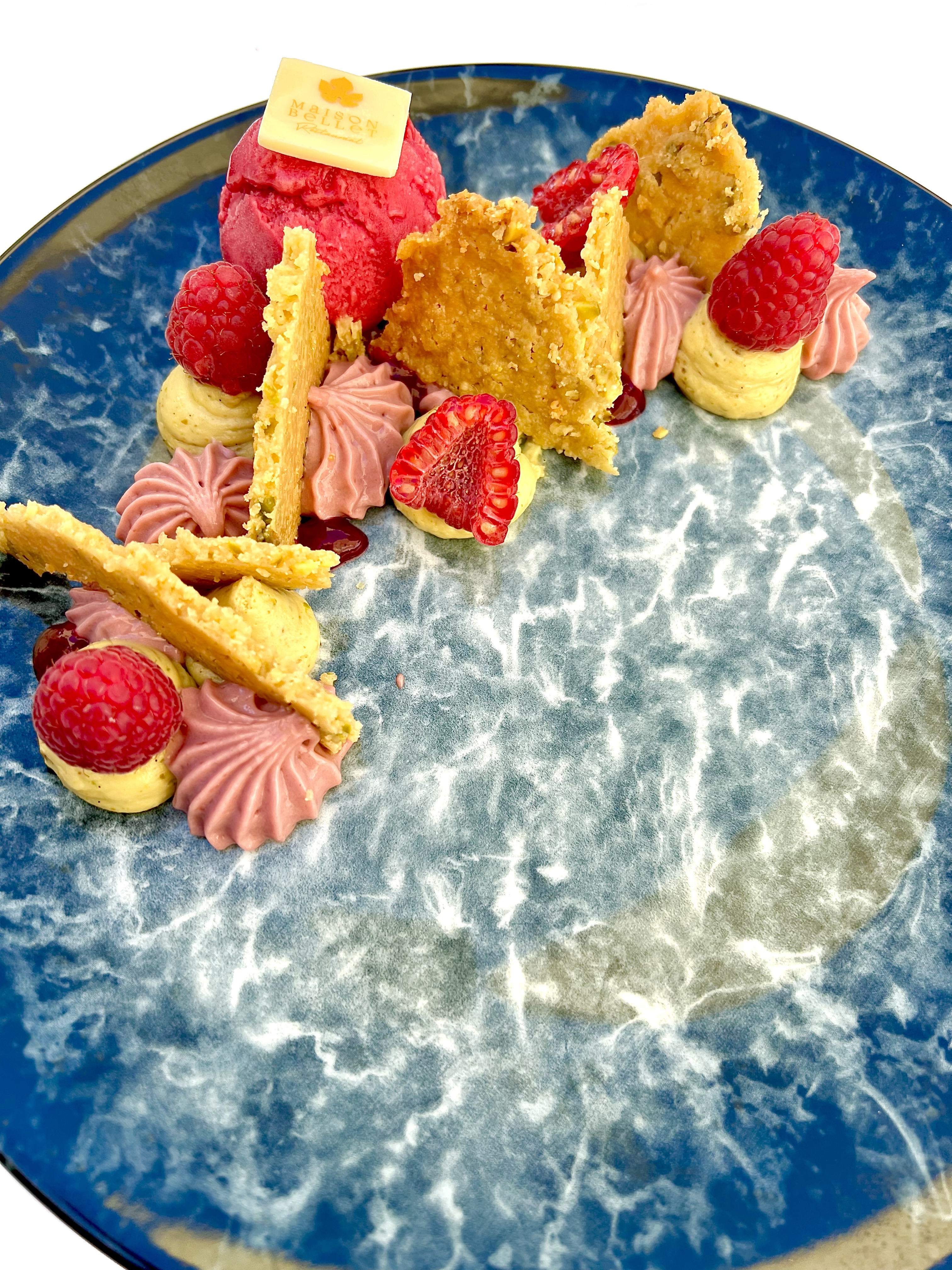 Les douceurs, qui changent régulièrement, jouent dans la cour des desserts de cuisiniers qui ont la simplicité et l’efficacité du réconfort, comme le Royal Chocolat, Mousse onctueuse chocolat, ganache montée Dulcey, biscuit craquant cacao ou le Cœur croustillant praliné Framboise / Pistache, biscuit streuzel et crémeux à la pistache, framboises fraîches et sorbet framboise ou encore les indémodables Crêpes Suzette.