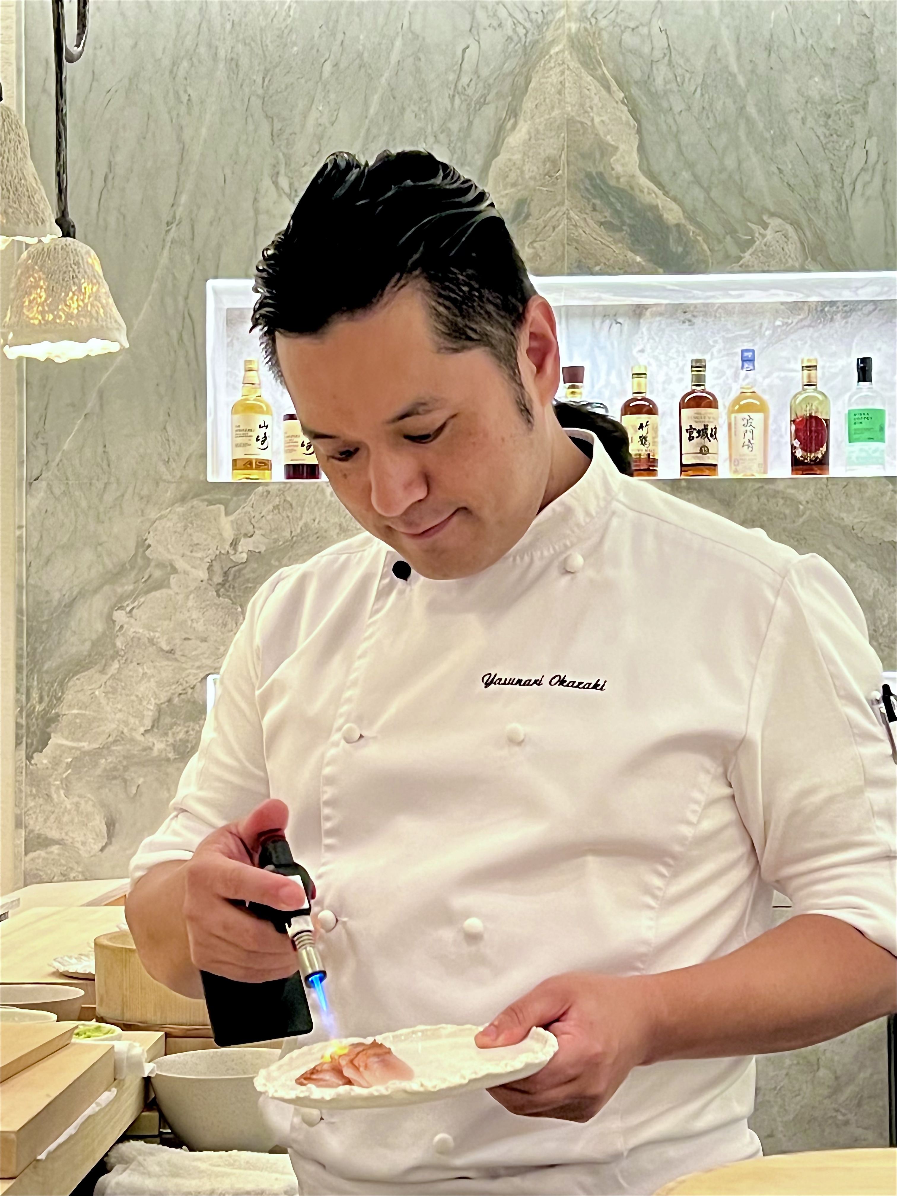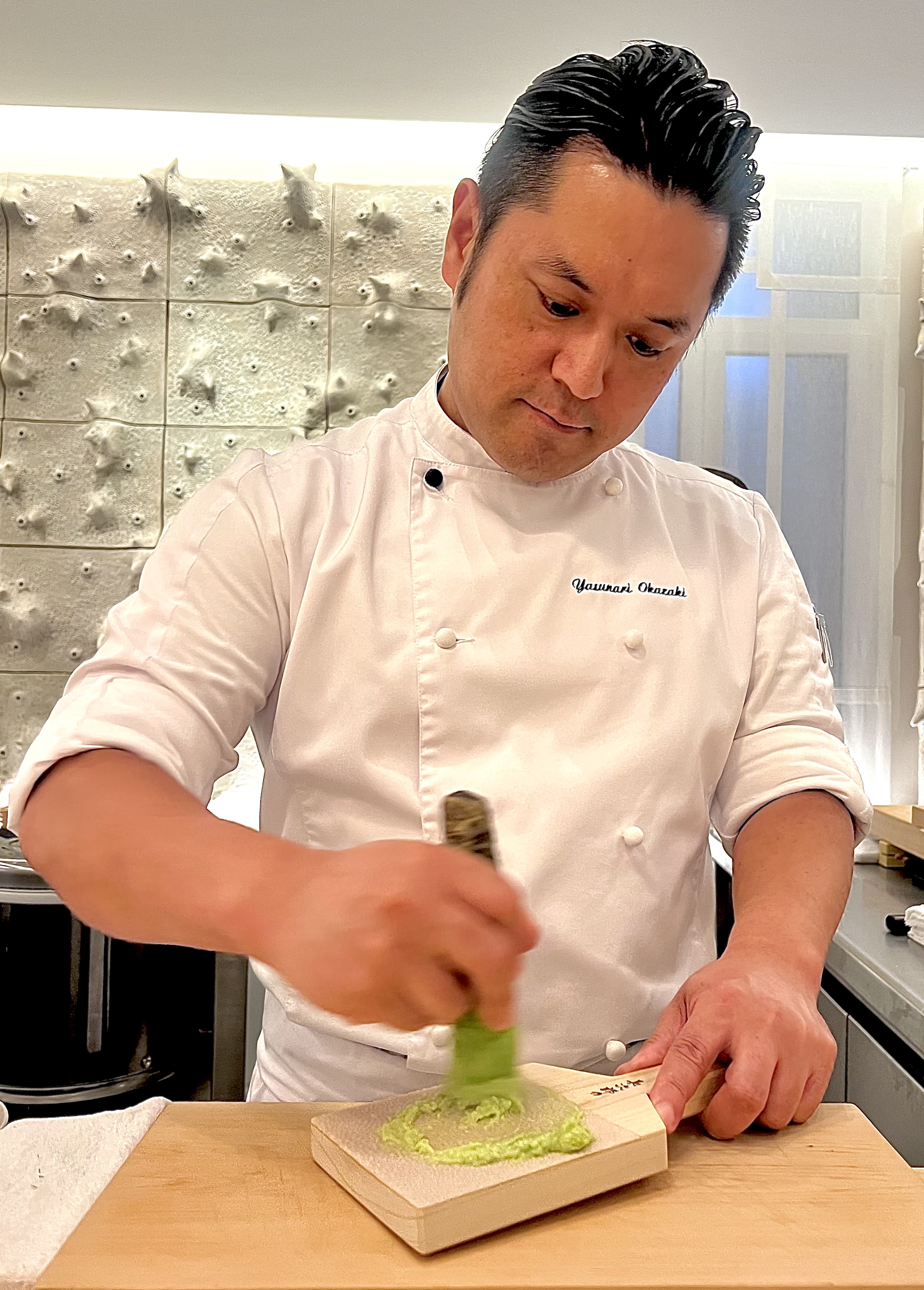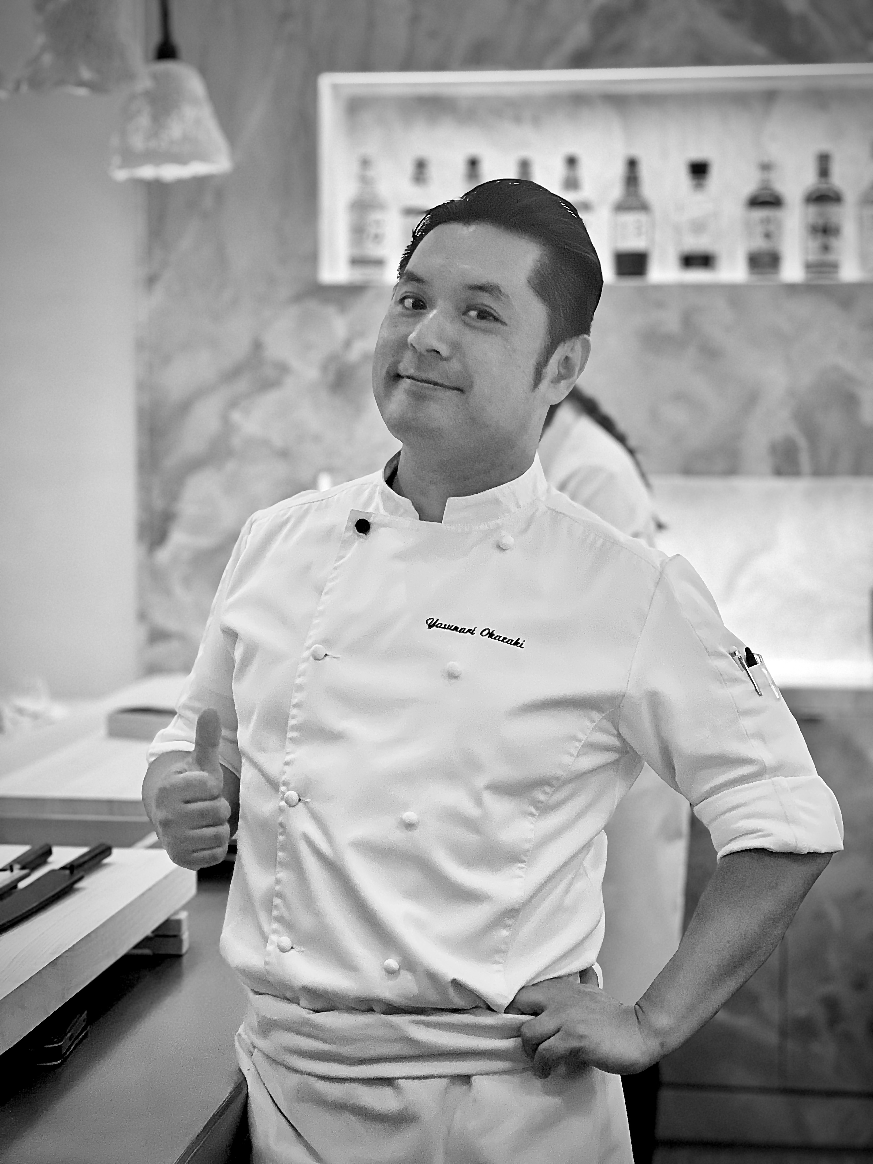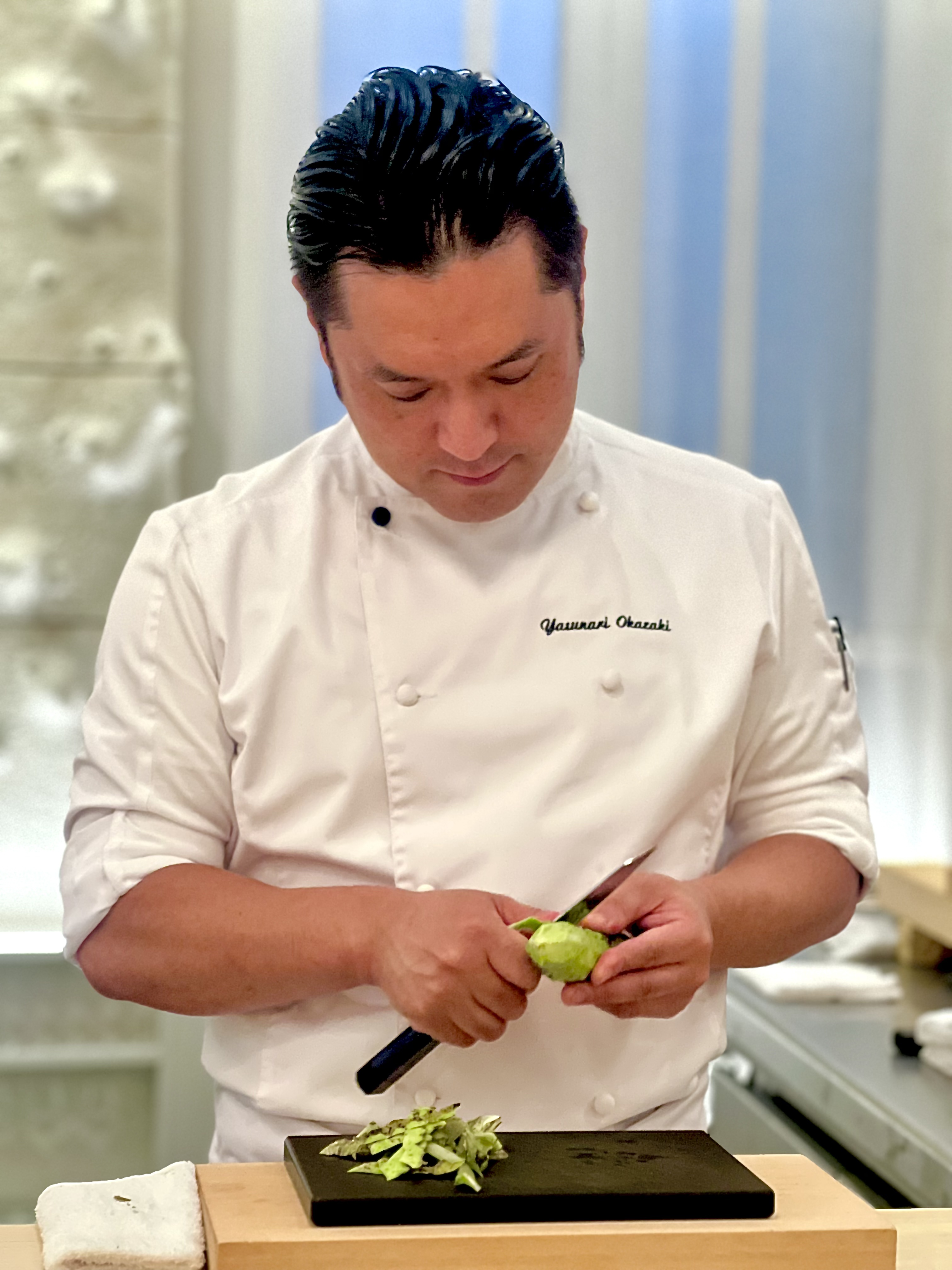 Yasunari Okazaki, fils d’un chef sushi, est très vite baigné dans cet art et apprend tout de son père qui lui transmet les notions essentielles d’engagement, de dévouement, de la perfection du geste et de l’«omotenashi» おもてなし (l’hospitalité à la japonaise dans son paroxysme, entre altruisme et minutie tournée sur ses hôtes en anticipant leurs besoins). Il se forme durant une quinzaine d’années dans différents établissements de grands renoms du pays et, à 33 ans, il devient chef kaiseki. Il possède également la licence de la très réglementée découpe du fugu. C’est en novembre 2016 que tout va changer lorsqu’il croise le chemin du Chef Alléno, il fait un passage éclair dans la capitale française avant de prendre la décision d’accepter l’aventure de L’Abysse à Paris qui ouvre ses portes en 2018. De cet échange admirable naît une cuisine hors norme qui est très vite récompensée d’une étoile au Guide Michelin, puis l’année suivante les deux étoiles consacrent cette table singulière sans précédent qui devient le restaurant japonais le plus étoilé d’Europe.
