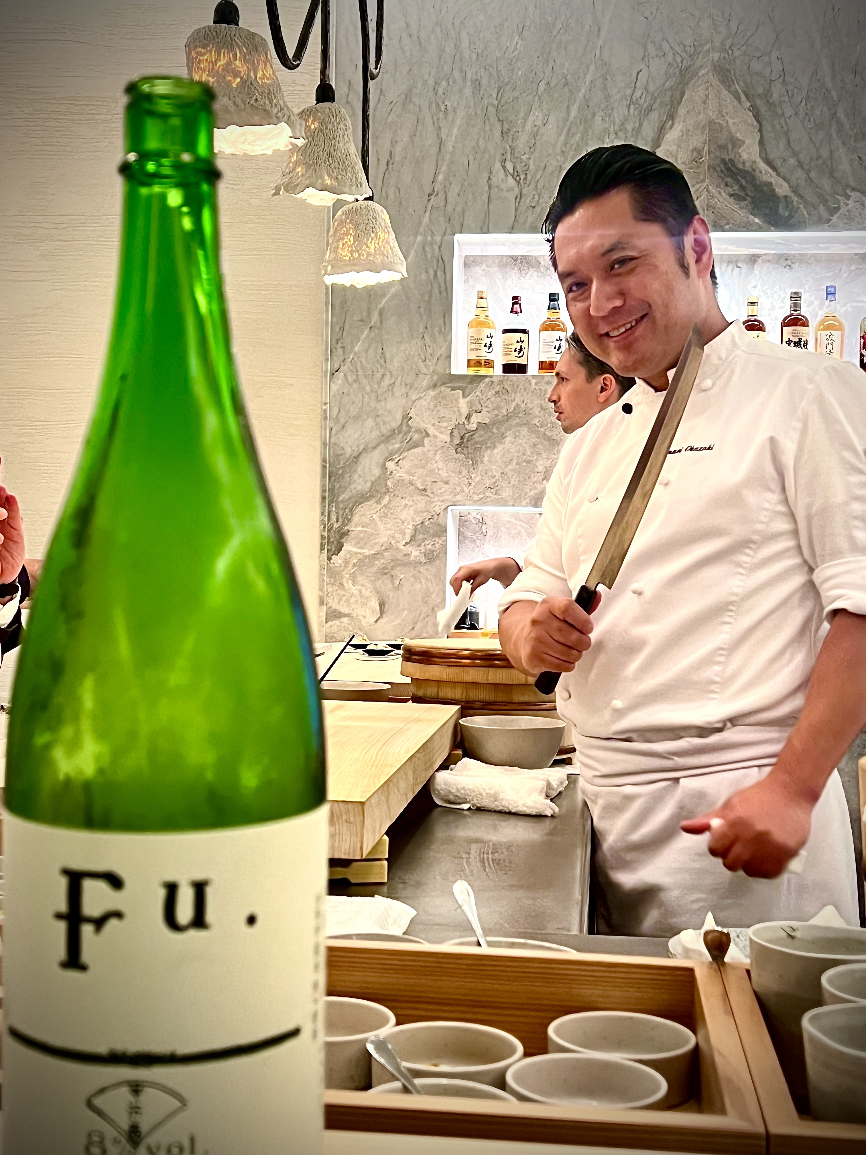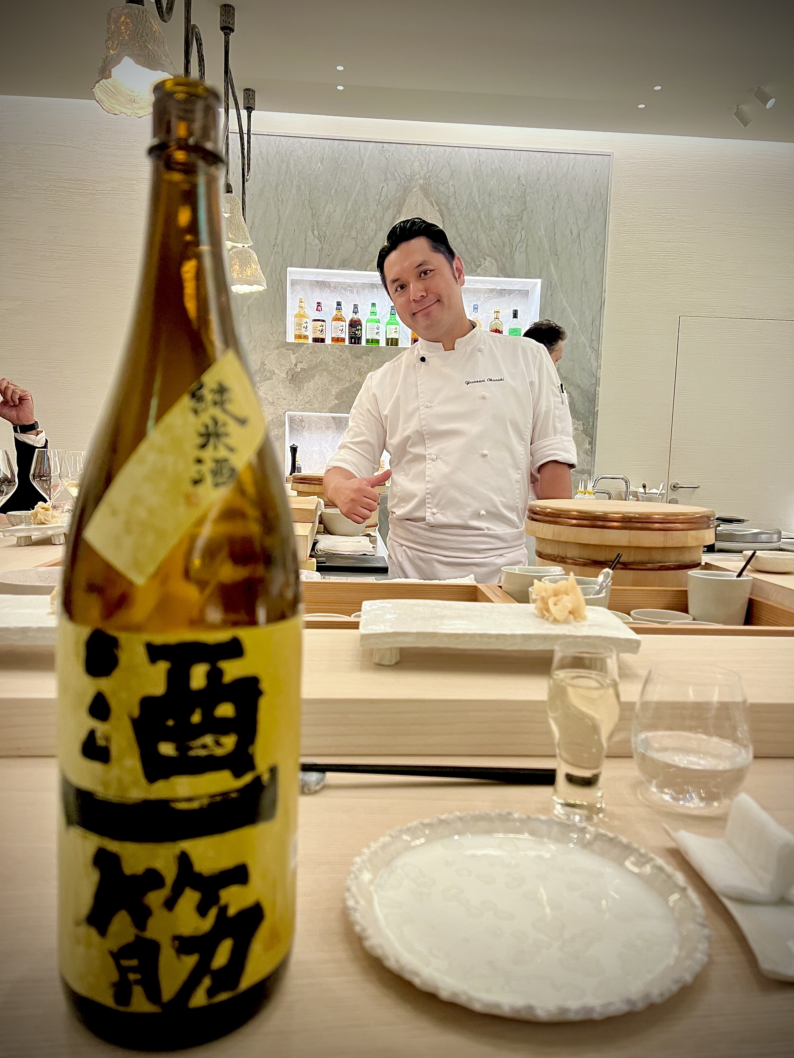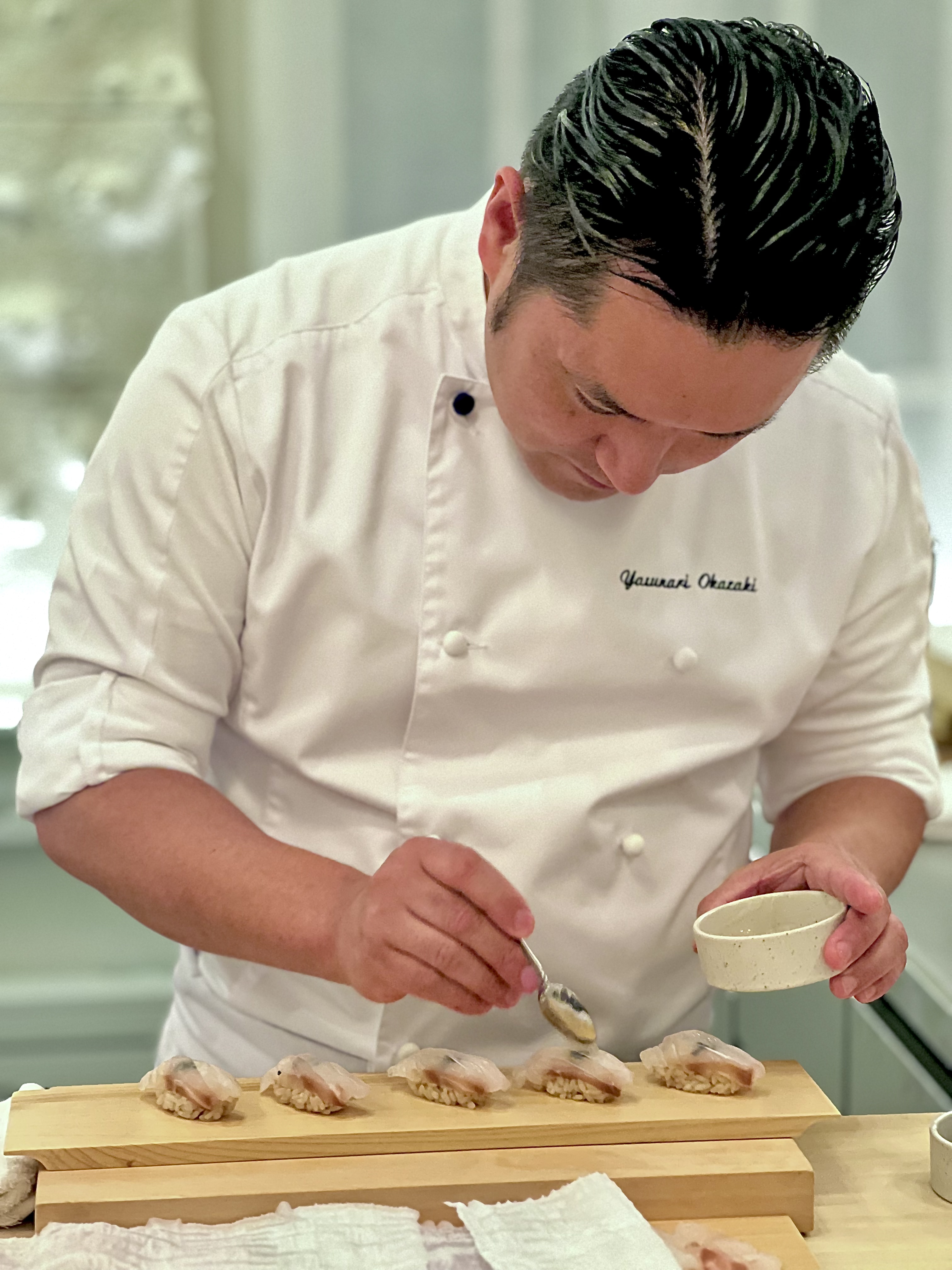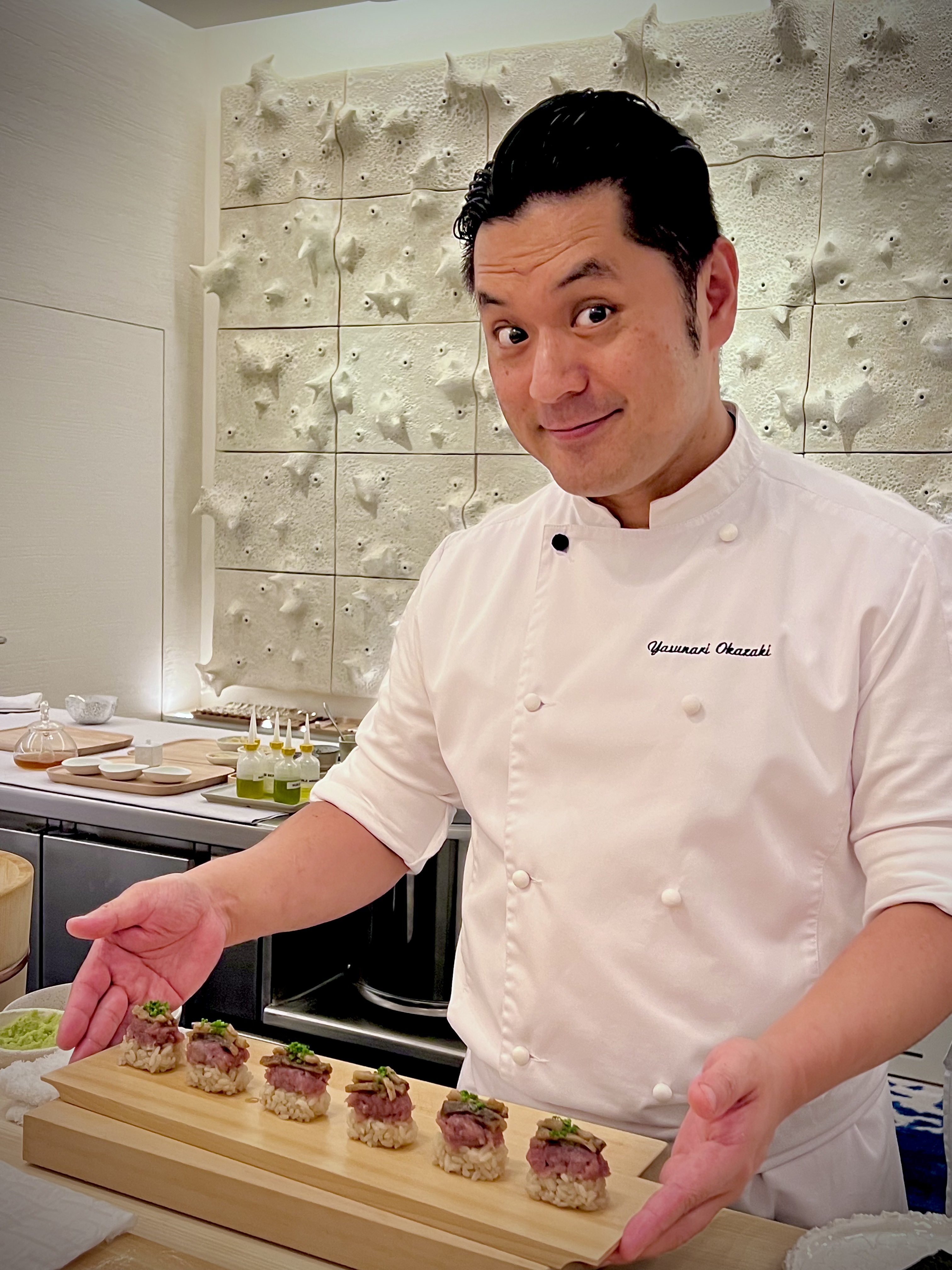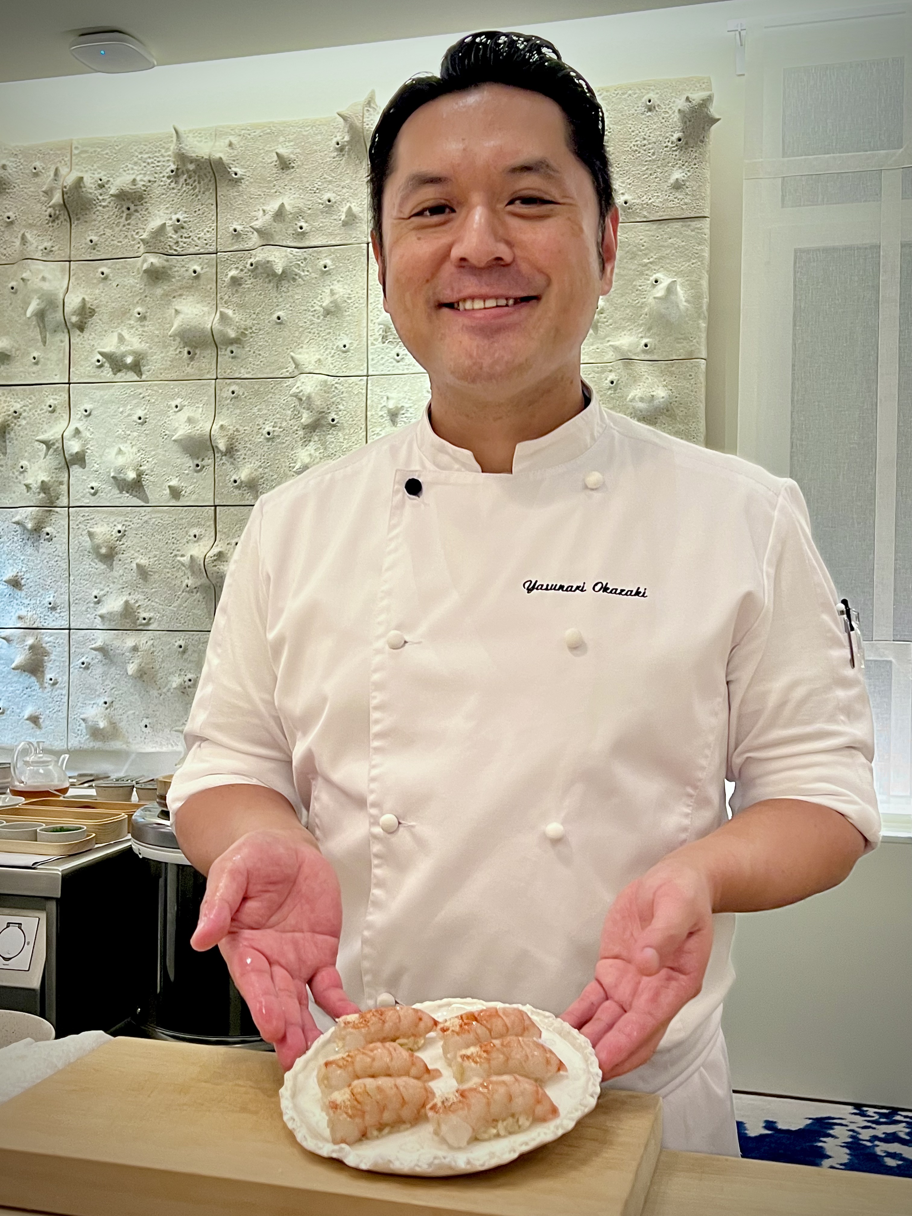 Yasunari Okazaki, fils d’un chef sushi, est très vite baigné dans cet art et apprend tout de son père qui lui transmet les notions essentielles d’engagement, de dévouement, de la perfection du geste et de l’«omotenashi» おもてなし (l’hospitalité à la japonaise dans son paroxysme, entre altruisme et minutie tournée sur ses hôtes en anticipant leurs besoins). Il se forme durant une quinzaine d’années dans différents établissements de grands renoms du pays et, à 33 ans, il devient chef kaiseki. Il possède également la licence de la très réglementée découpe du fugu. C’est en novembre 2016 que tout va changer lorsqu’il croise le chemin du Chef Alléno, il fait un passage éclair dans la capitale française avant de prendre la décision d’accepter l’aventure de L’Abysse à Paris qui ouvre ses portes en 2018. De cet échange admirable naît une cuisine hors norme qui est très vite récompensée d’une étoile au Guide Michelin, puis l’année suivante les deux étoiles consacrent cette table singulière sans précédent qui devient le restaurant japonais le plus étoilé d’Europe.