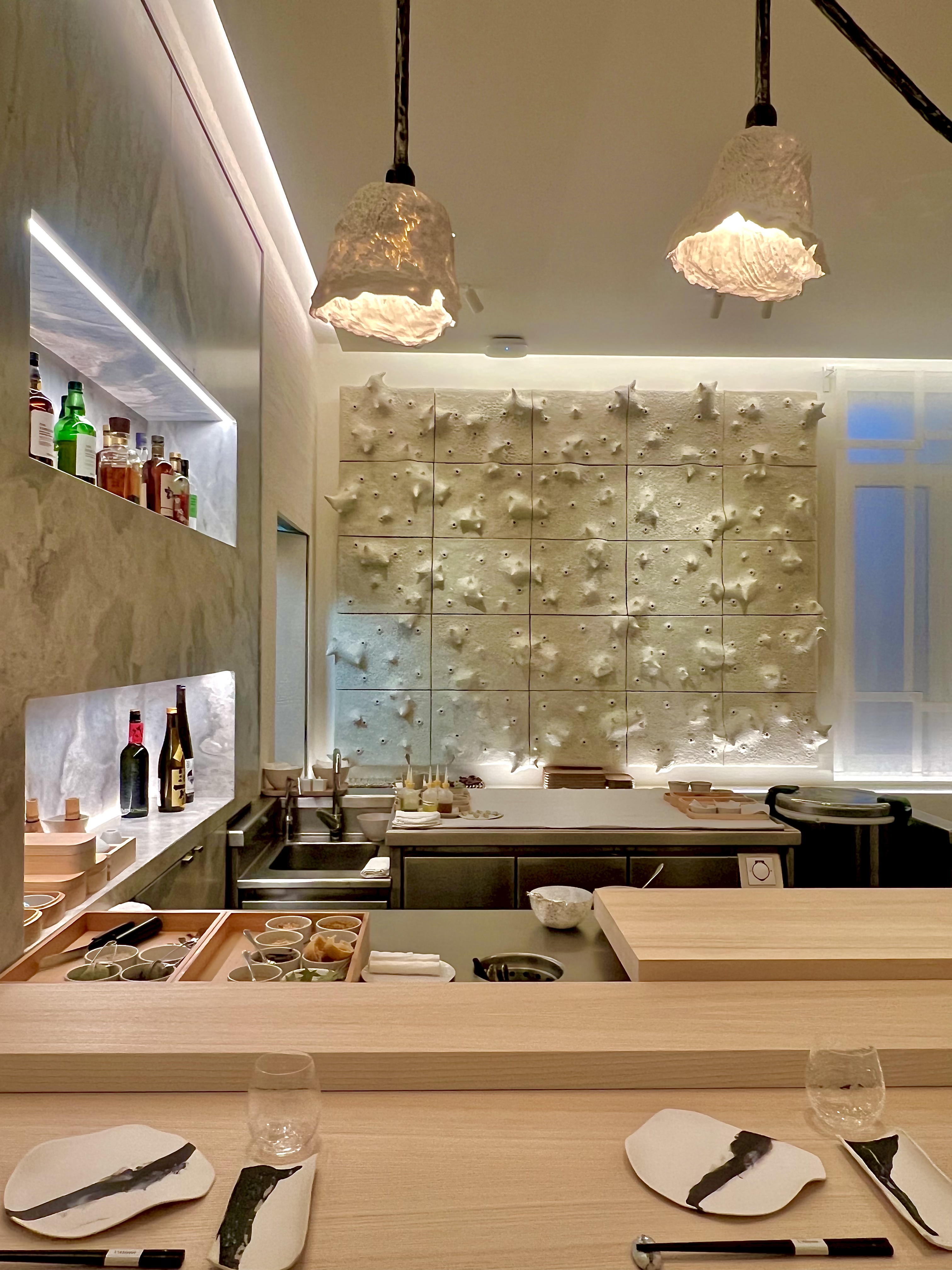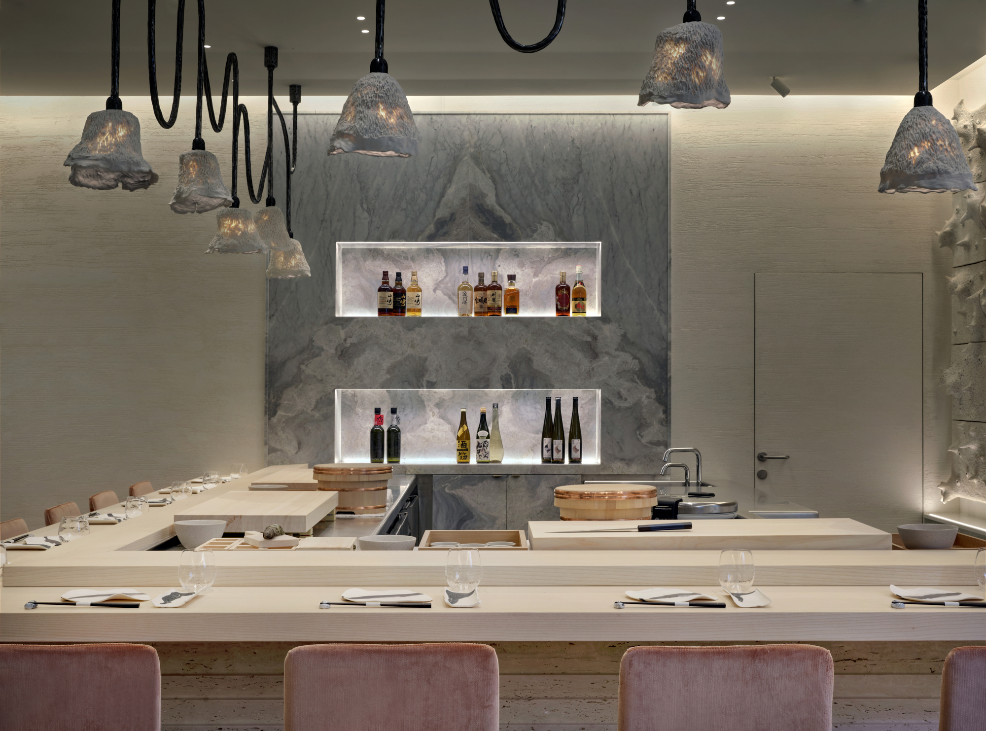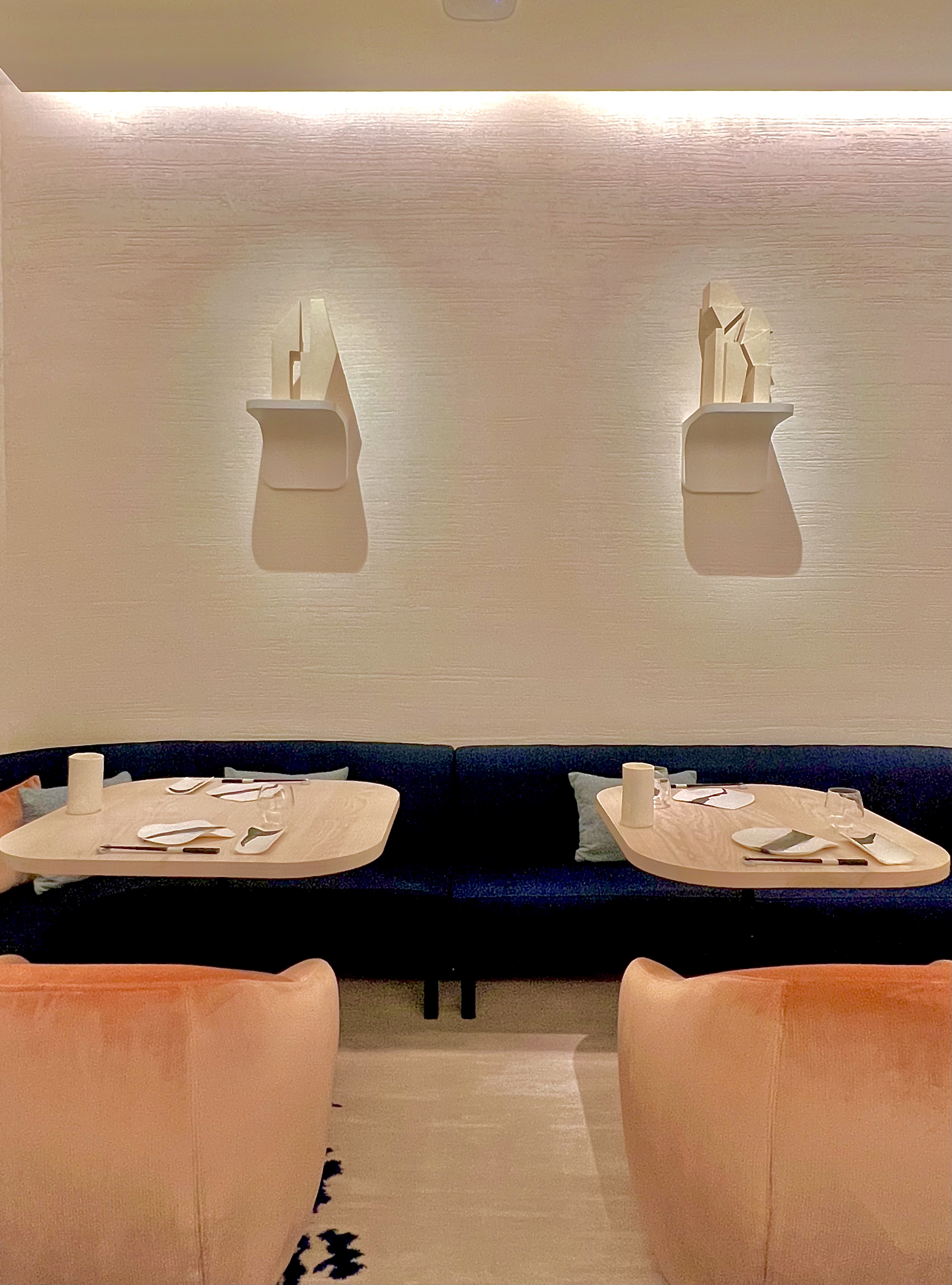 Situé en lieu et place du Crystal bar, L’Abysse Monte-Carlo se révèle au loin, depuis le long couloir de l’Hôtel Hermitage, d’un mur tel une vague figée en travertin ayant submergé l’entrée : le contraste est subjuguant et saisissant. La porte, presque dérobée, est un sas qui s’ouvre vers un nouvel univers, un nouveau monde, une nouvelle dimension, celle du Japon et de la sérénité. Véritable bulle hors du temps, la décoration signée Laurence Bonnel-Alléno, accompagnée du duo d’architectes RoWin’atelier, vous inspire à vivre ce moment avec attention et apaisement. Les matières sont texturées, à la fois, chaudes et froides, douces et rugueuses, brutes et sophistiquées, comme le bois, le marbre, le velours et la céramique qui vous donnent cette fébrile envie d’un contact charnel et vivant avec les lieux, comme avec ce mur magistral de William Coggin ou les lustres de Célia Bertrand. La clarté est ici essentielle, telle une lumineuse vision de l’Atlantide surgissant au loin dans les plus grandes profondeurs. Le bar vous happe et vous donne cette envie de vous y asseoir. Les 10 places sont la promesse de vous faire vivre toute la cinématographie des gestes en apesanteur du Maître et de ses équipes. Pour une intimité académique, les places dans la salle aux banquettes poudrées sont idéales, tout en capturant une vision d’ensemble.