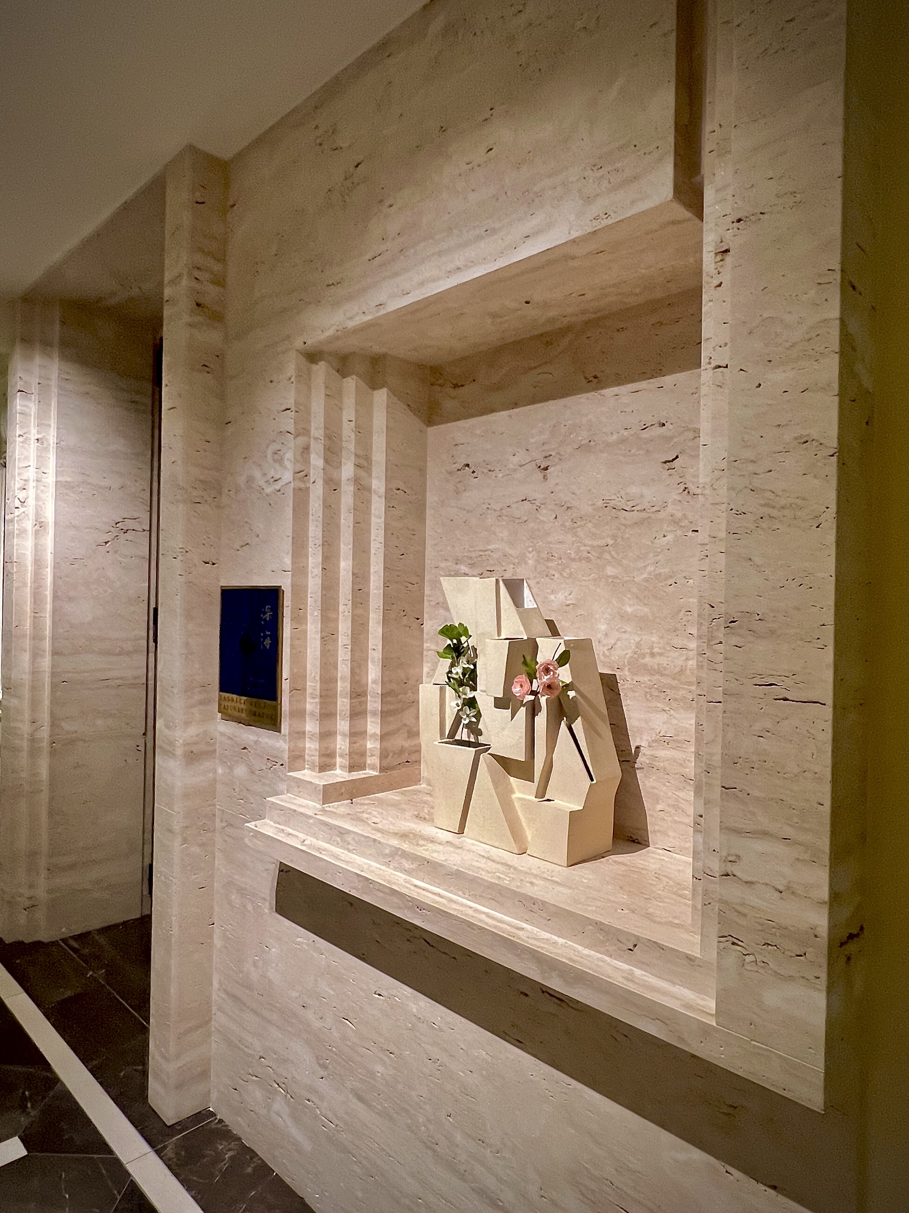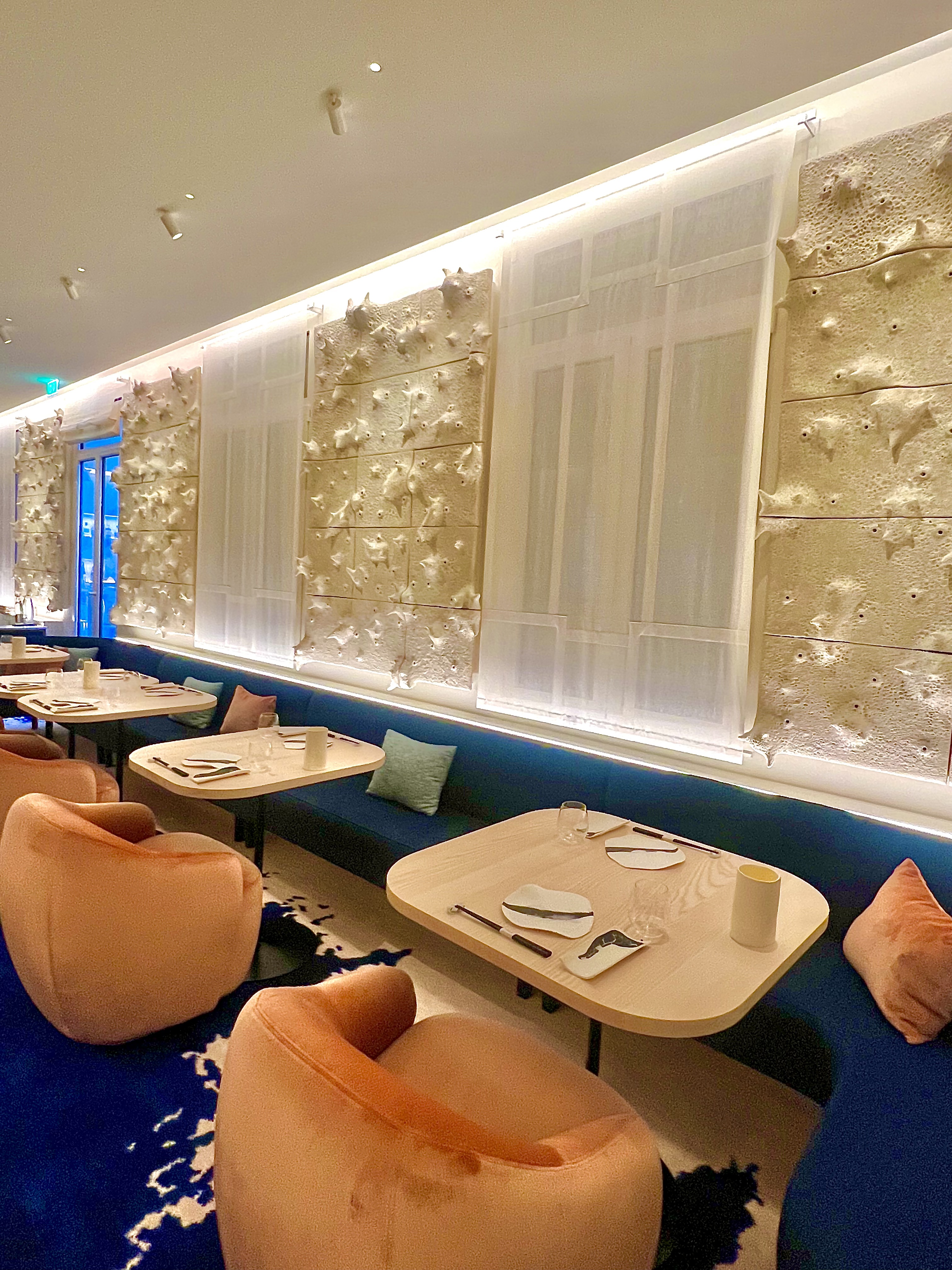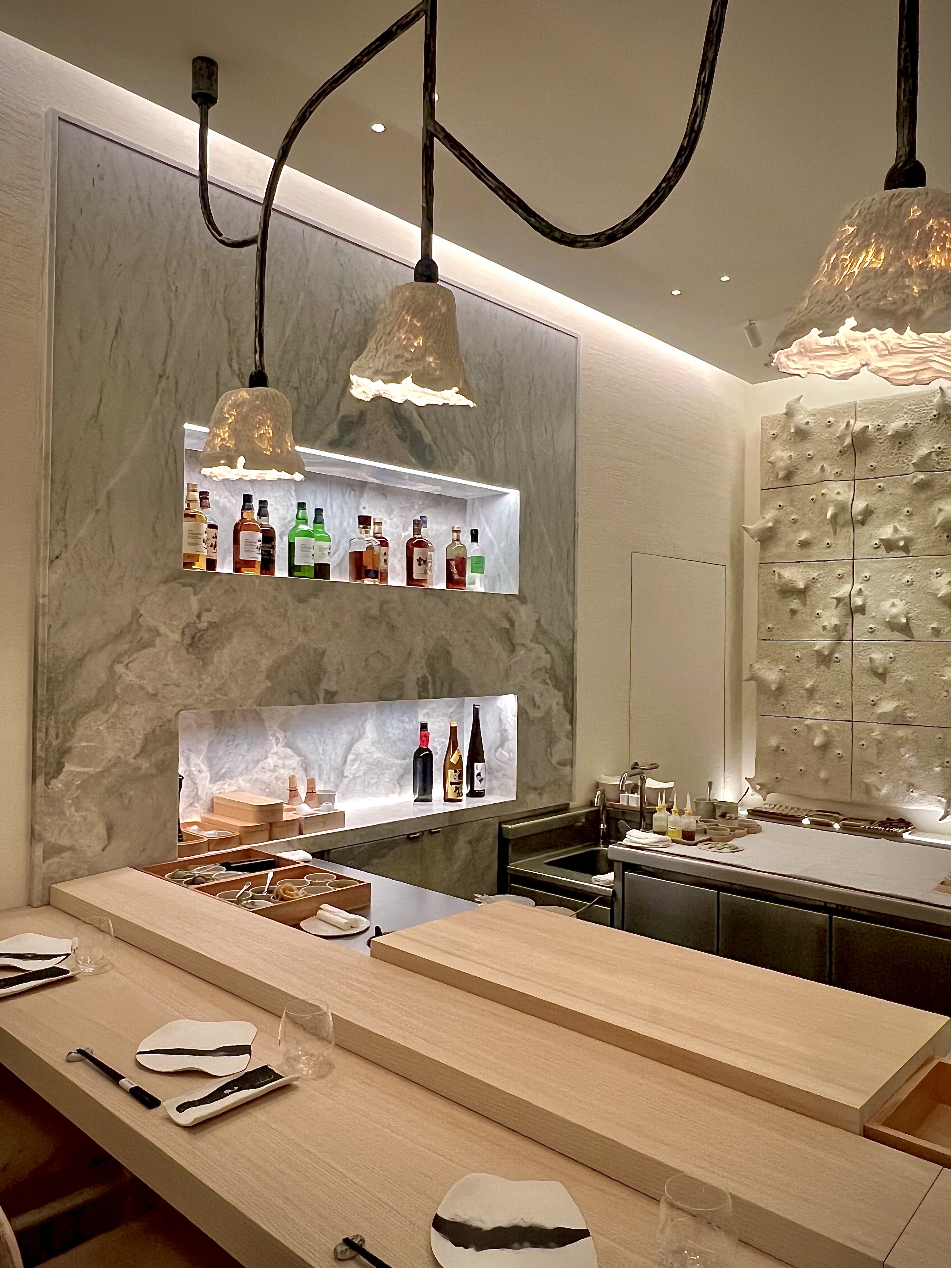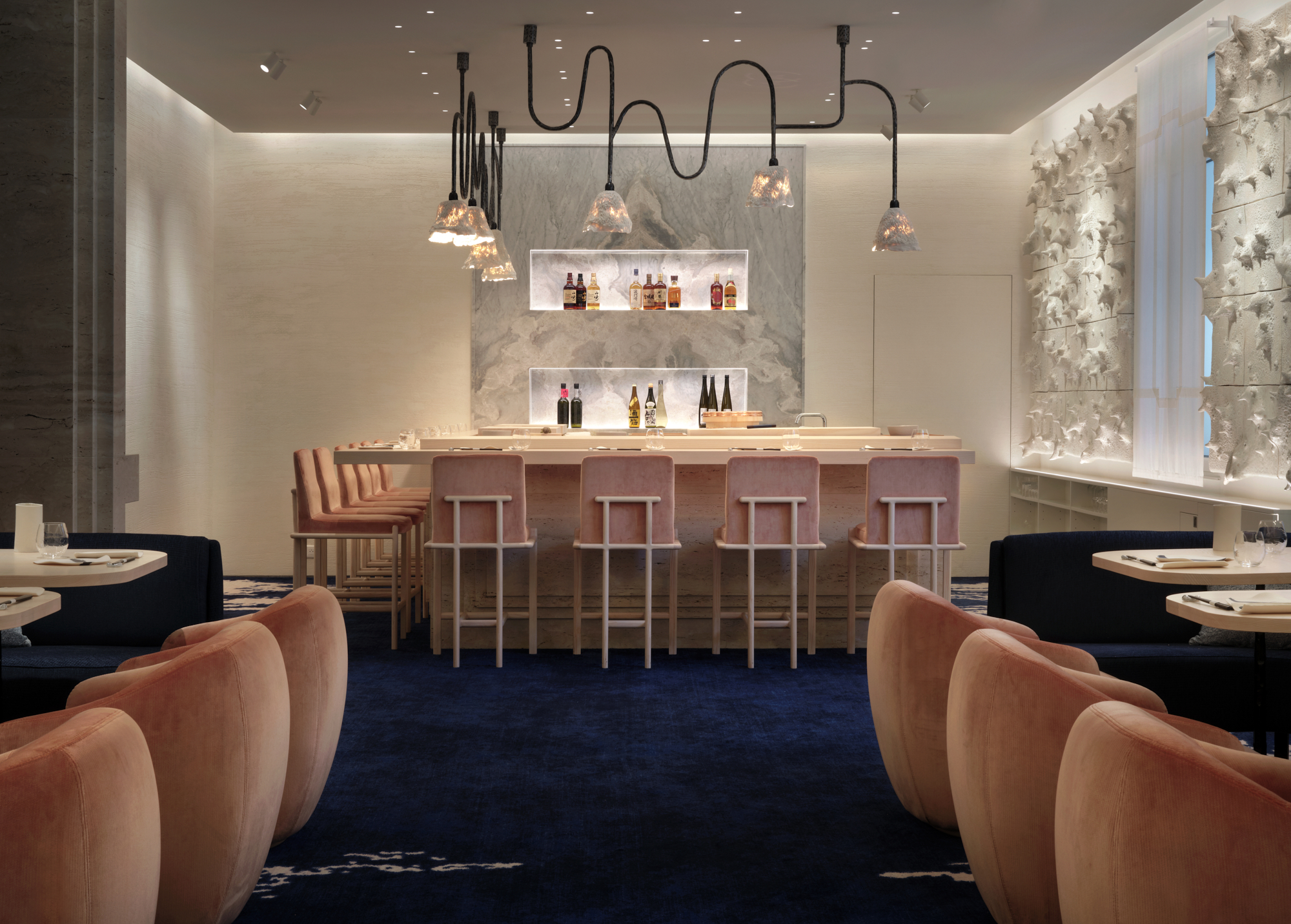 Situé en lieu et place du Crystal bar, L’Abysse Monte-Carlo se révèle au loin, depuis le long couloir de l’Hôtel Hermitage, d’un mur tel une vague figée en travertin ayant submergé l’entrée : le contraste est subjuguant et saisissant. La porte, presque dérobée, est un sas qui s’ouvre vers un nouvel univers, un nouveau monde, une nouvelle dimension, celle du Japon et de la sérénité. Véritable bulle hors du temps, la décoration signée Laurence Bonnel-Alléno, accompagnée du duo d’architectes RoWin’atelier, vous inspire à vivre ce moment avec attention et apaisement. Les matières sont texturées, à la fois, chaudes et froides, douces et rugueuses, brutes et sophistiquées, comme le bois, le marbre, le velours et la céramique qui vous donnent cette fébrile envie d’un contact charnel et vivant avec les lieux, comme avec ce mur magistral de William Coggin ou les lustres de Célia Bertrand. La clarté est ici essentielle, telle une lumineuse vision de l’Atlantide surgissant au loin dans les plus grandes profondeurs. Le bar vous happe et vous donne cette envie de vous y asseoir. Les 10 places sont la promesse de vous faire vivre toute la cinématographie des gestes en apesanteur du Maître et de ses équipes. Pour une intimité académique, les places dans la salle aux banquettes poudrées sont idéales, tout en capturant une vision d’ensemble.