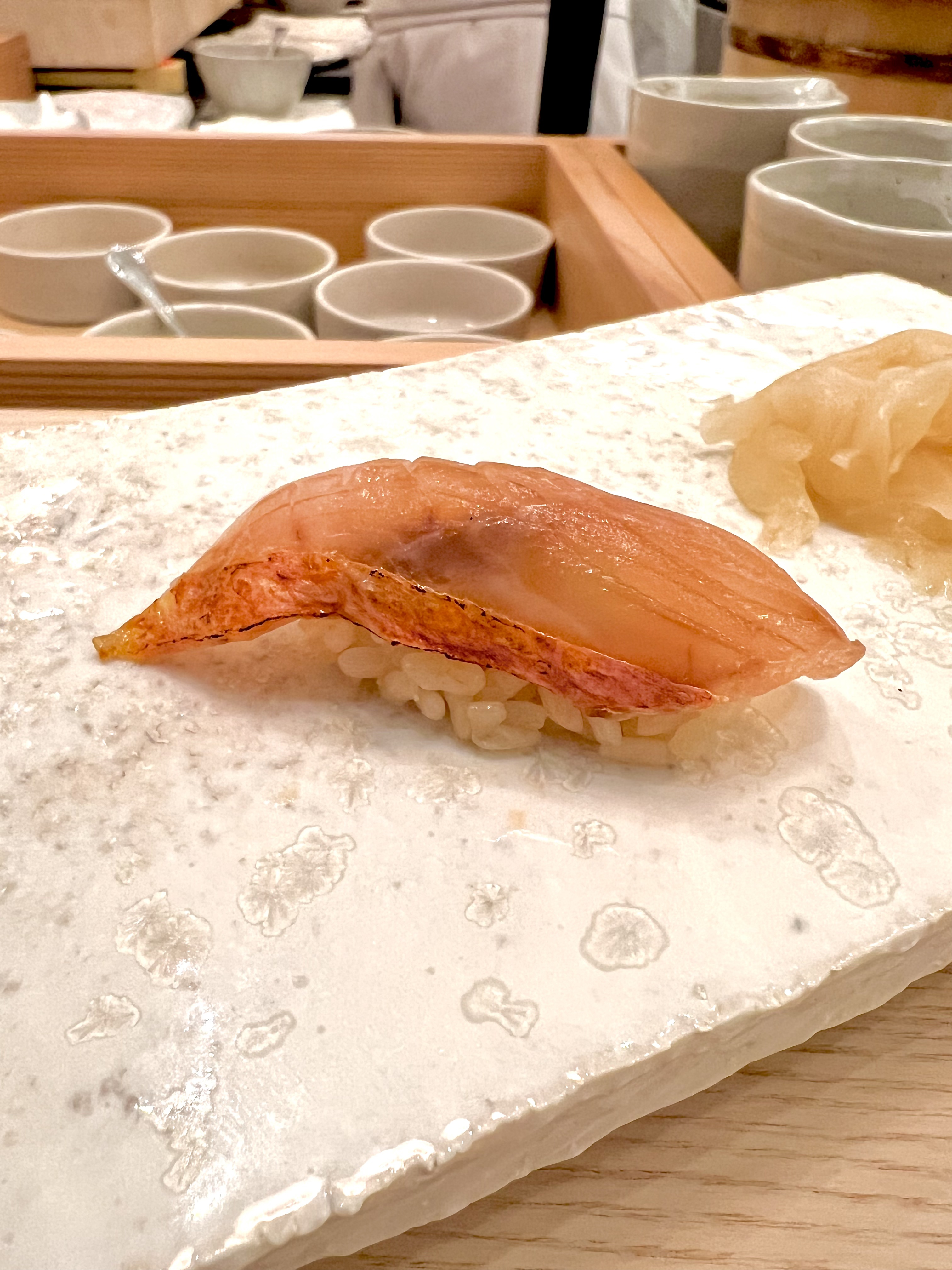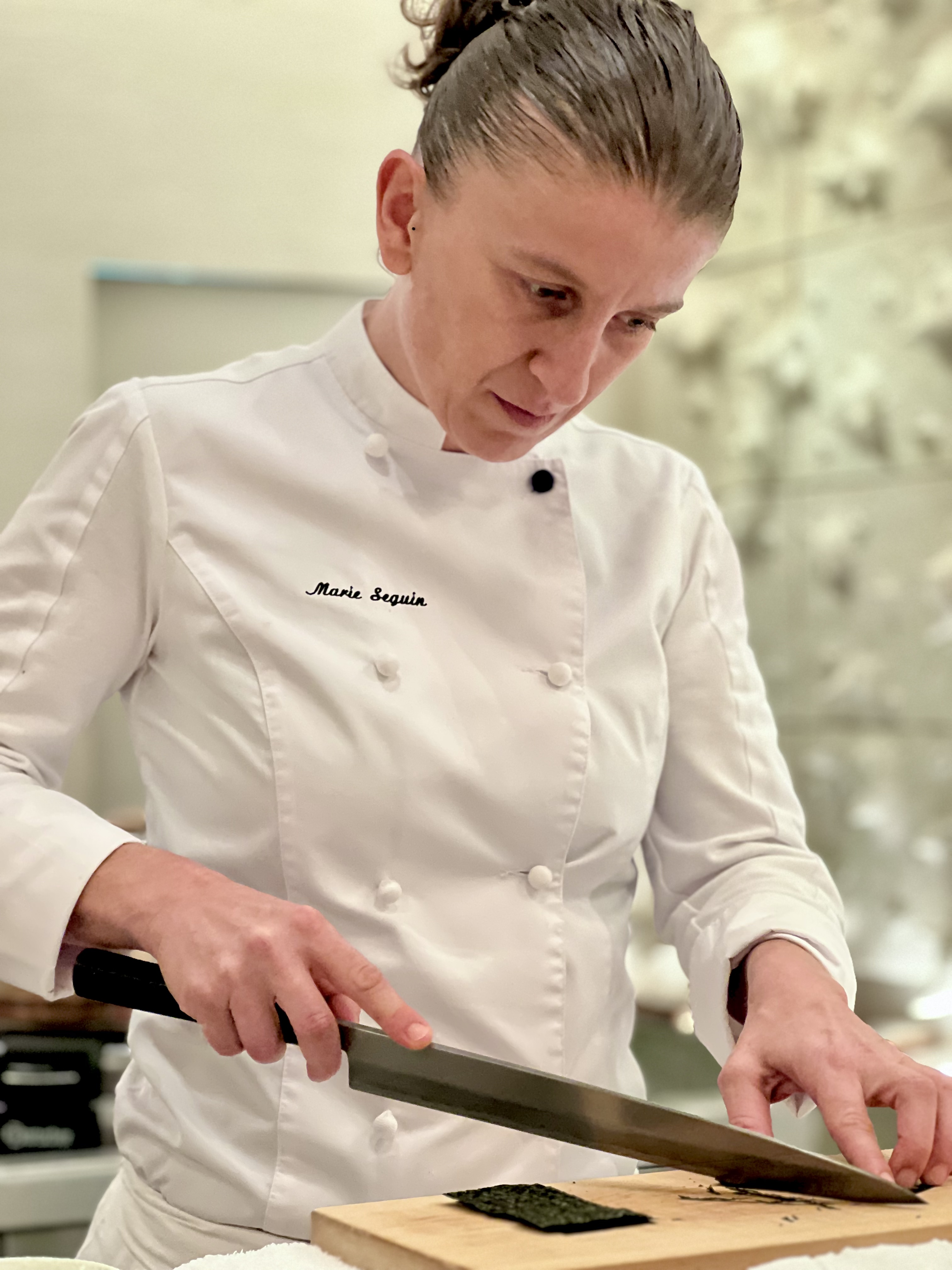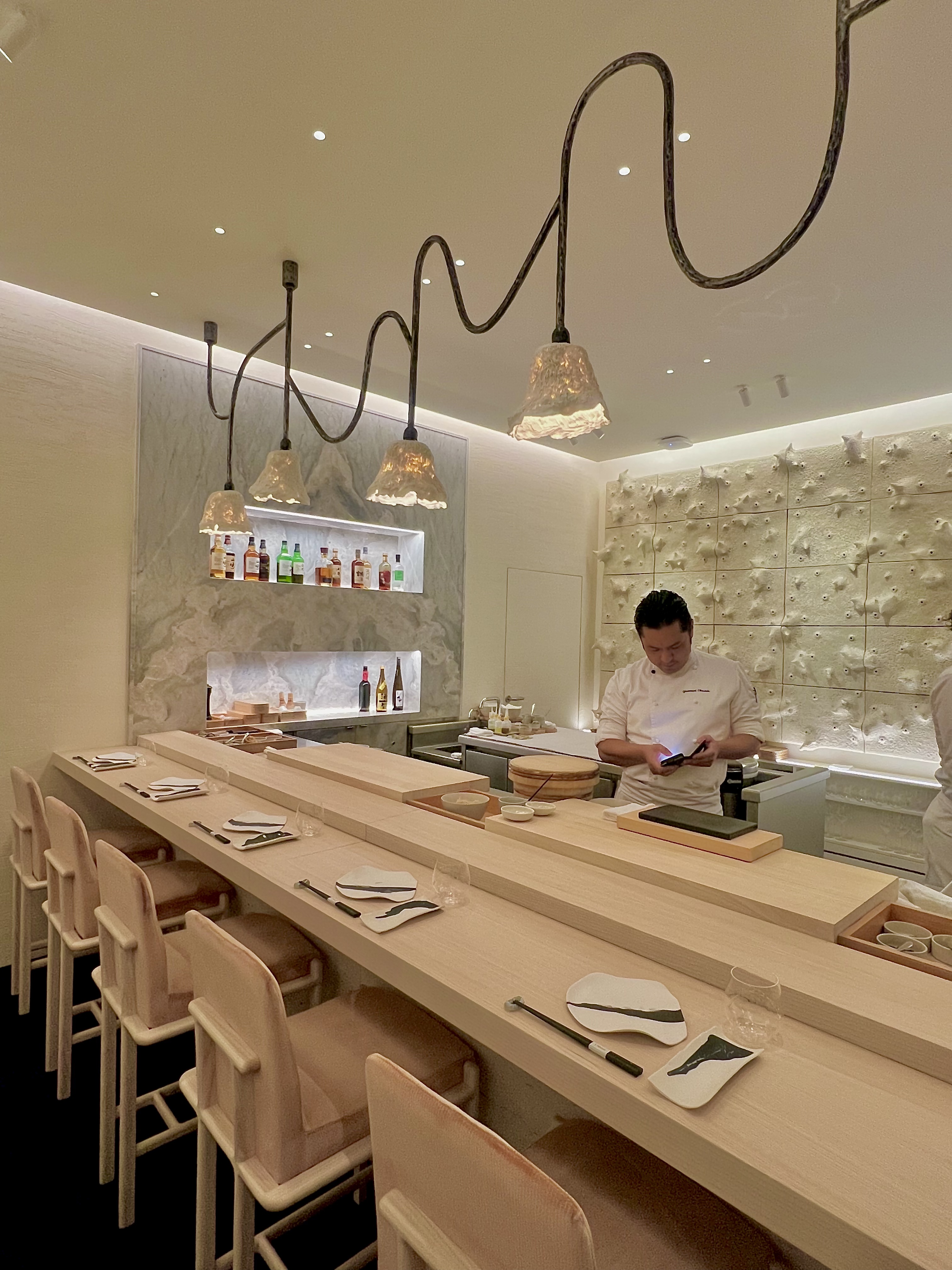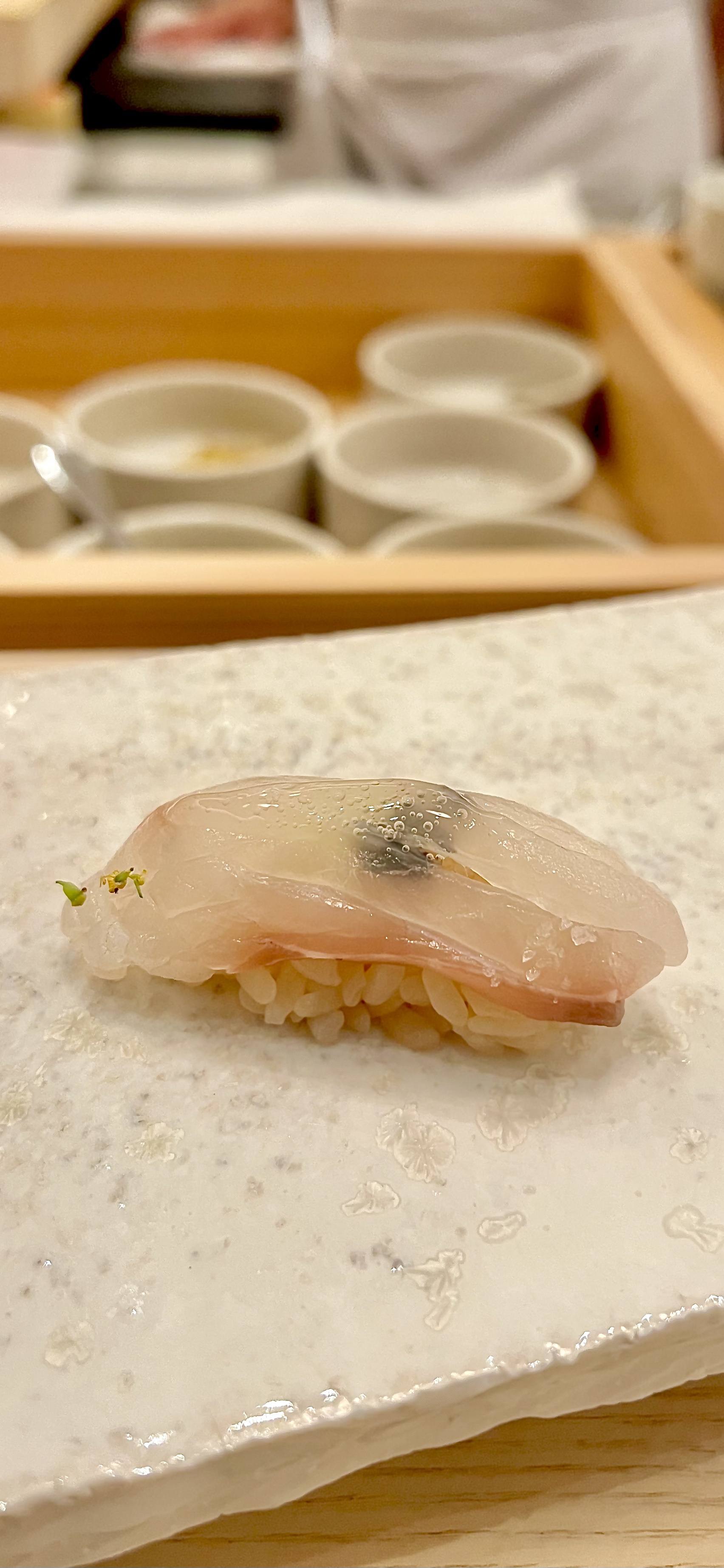 La lame du Yanagiba du maître est affûtée pour une découpe parfaite et s’adapte à la typologie de la chair pour délivrer souplesse et texture en bouche, puis le poisson est effleuré au pinceau avec une sauce nikiri à base de sauce soja et de saké flambé. Le riz Sasanishiki (précieux joyau cultivé dans la Préfecture de Miyagi) est travaillé à température du corps, parfumé aux algues Kombu et assaisonné d’un mélange secret de vinaigre, de sel, et de sucre. Le geste est irréel de perfection de ces mains en infaillible balance d’une chorégraphie façonnant ces grains se métamorphosant en un coussin idéal des prises du jour, comme le Loup, le Denti, le Rouget ou la Seiche qui, posées délicatement sur le dessus, s’assouplissent au contact du riz, maintenu tiédi et deviennent alors Nigiri. La dégustation est à la fois cérémoniale et conviviale, d’une complicité presque émue avec le chef qui délivre son savoir-faire pour vous et pour votre plaisir.